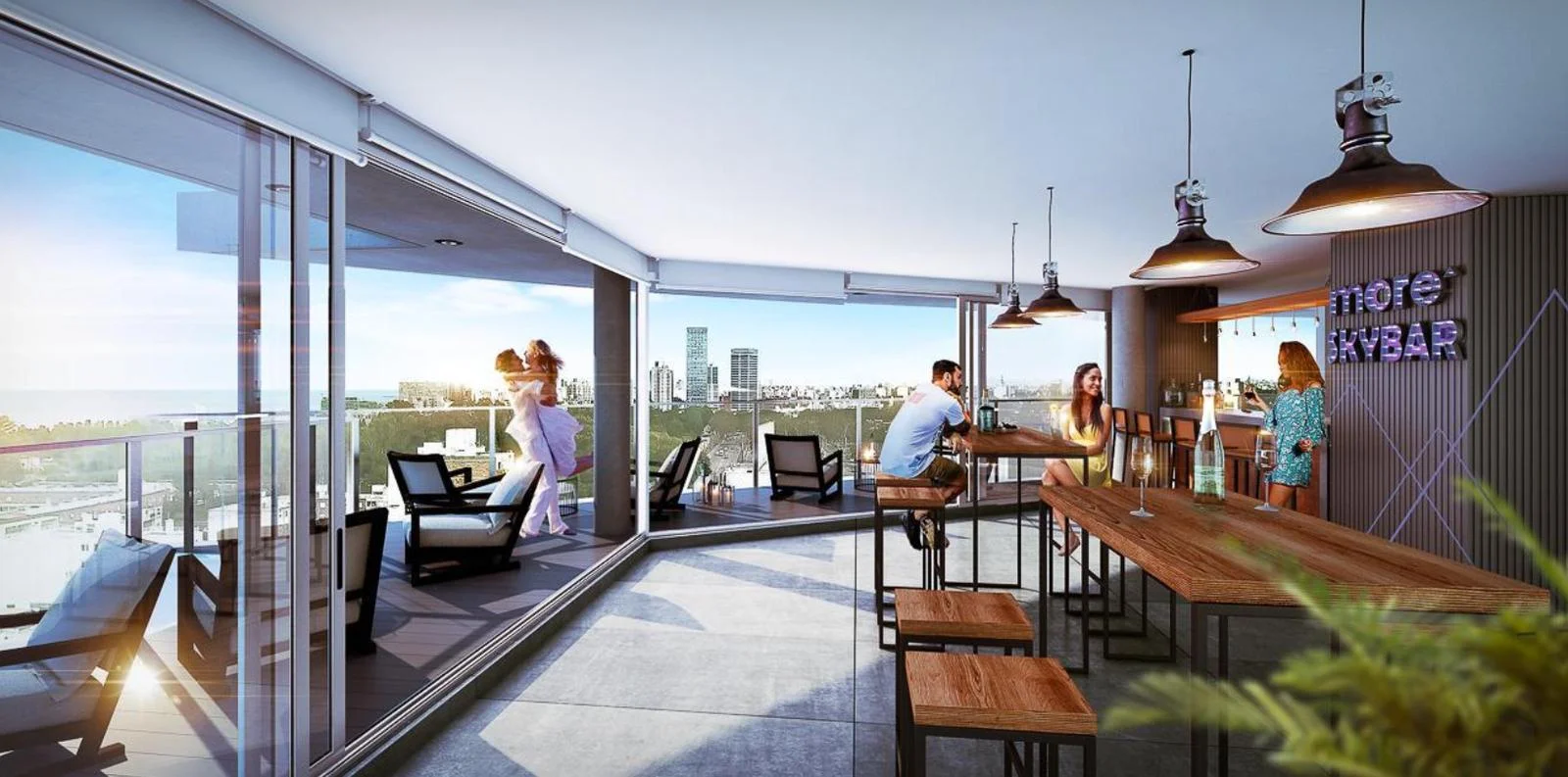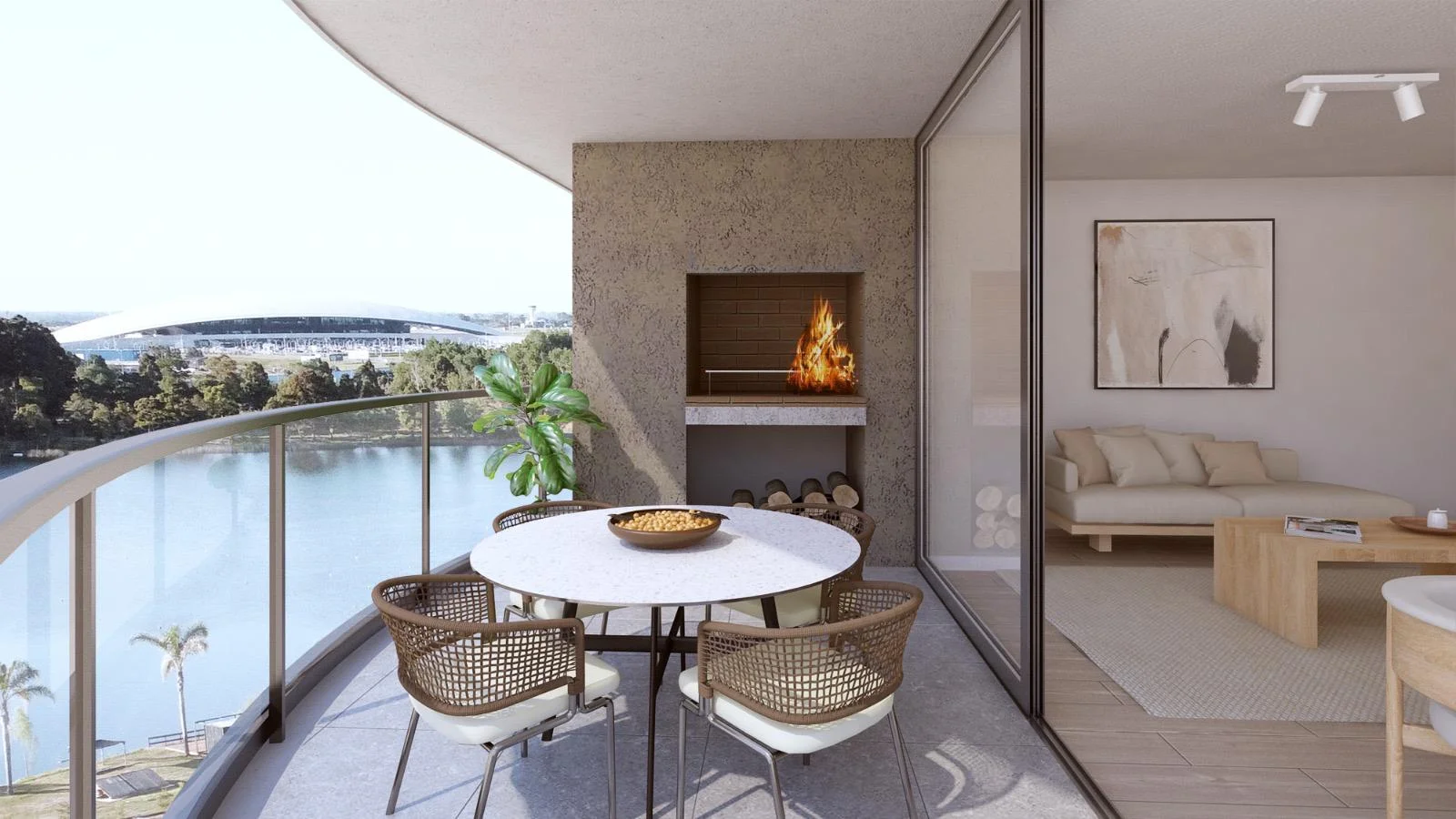Amplia terraza de contemplación al Lago Pesquero equipada con livings exteriores.