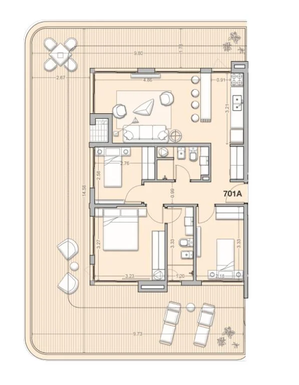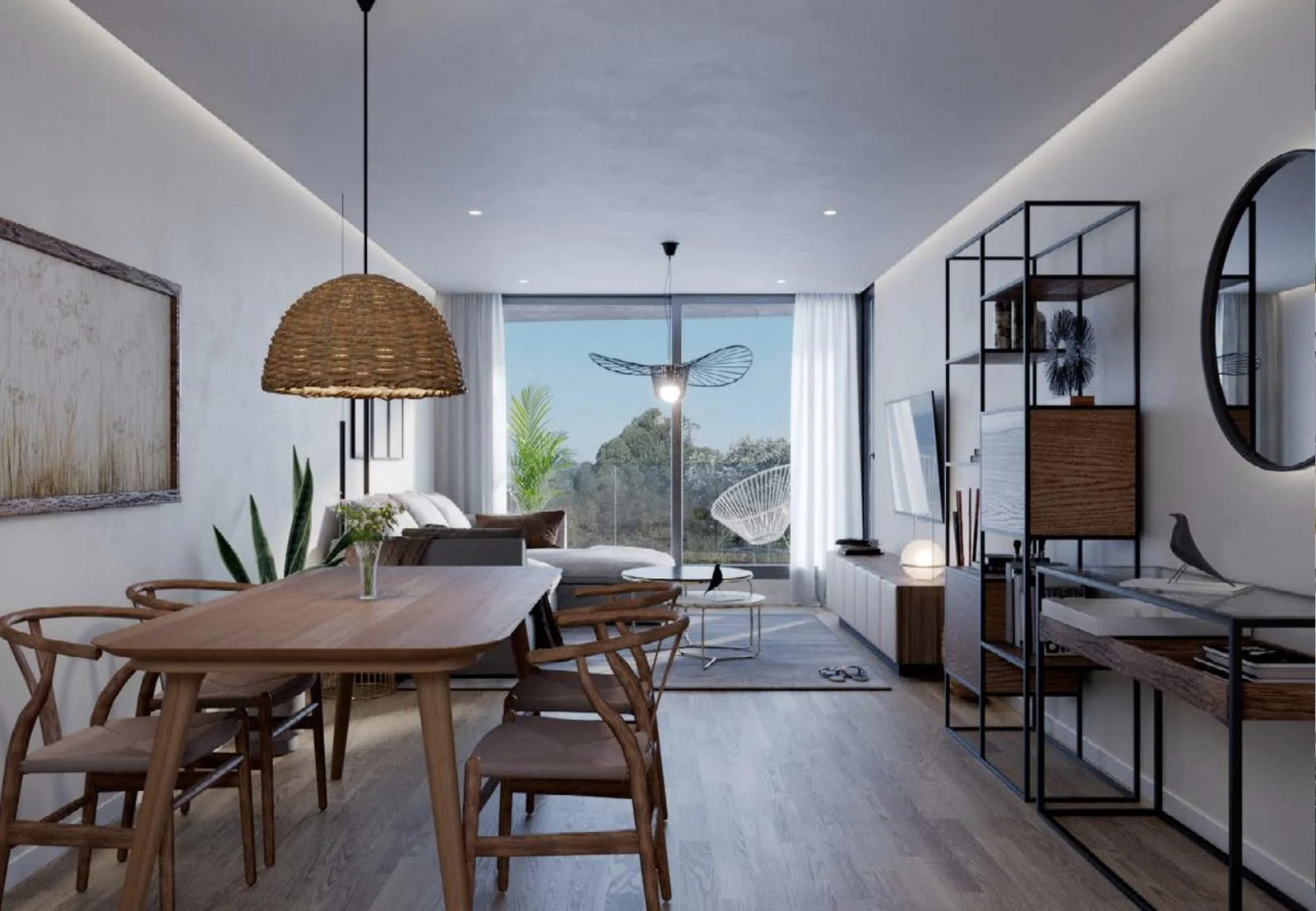 Apartamento con Cocina Integrada a amplio Living Comedor con Barra pasa platos. Salida a Terraza Exclusiva con Parrillero Propio. Baño completo. Dormitorios al Frente con salida a Terraza y Placares.