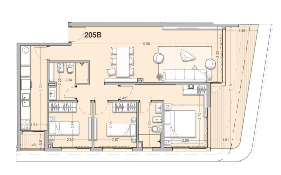 Apartamento con Cocina Integrada a amplio Living Comedor con Barra pasa platos. Salida a Terraza Exclusiva con Parrillero Propio. Baño completo. Dormitorios al Frente con salida a Terraza y Placares.
