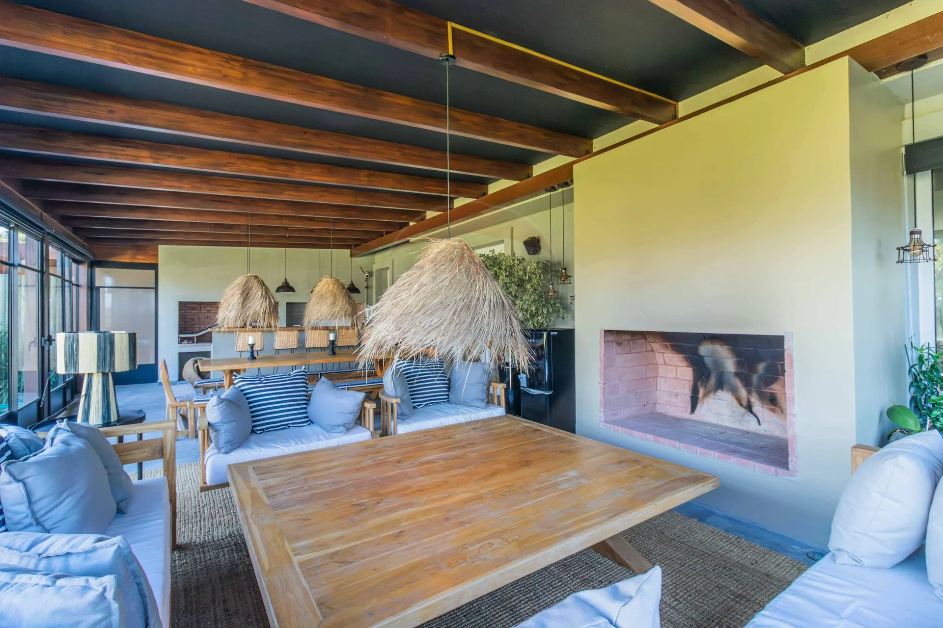 Barbacoa con hermosa estufa a leña tradicional con cerramientos de vidrio, comedor y parrillero.
