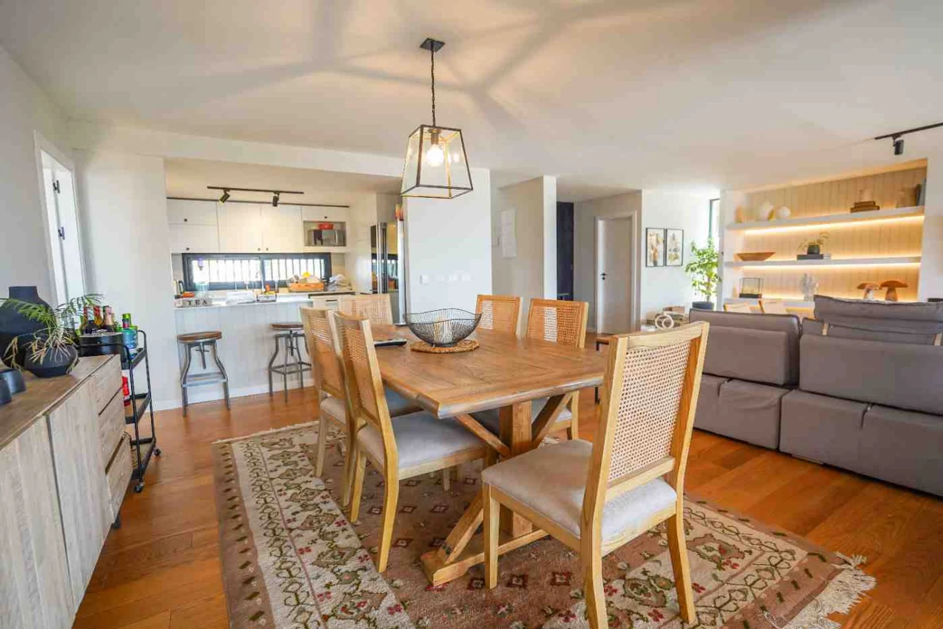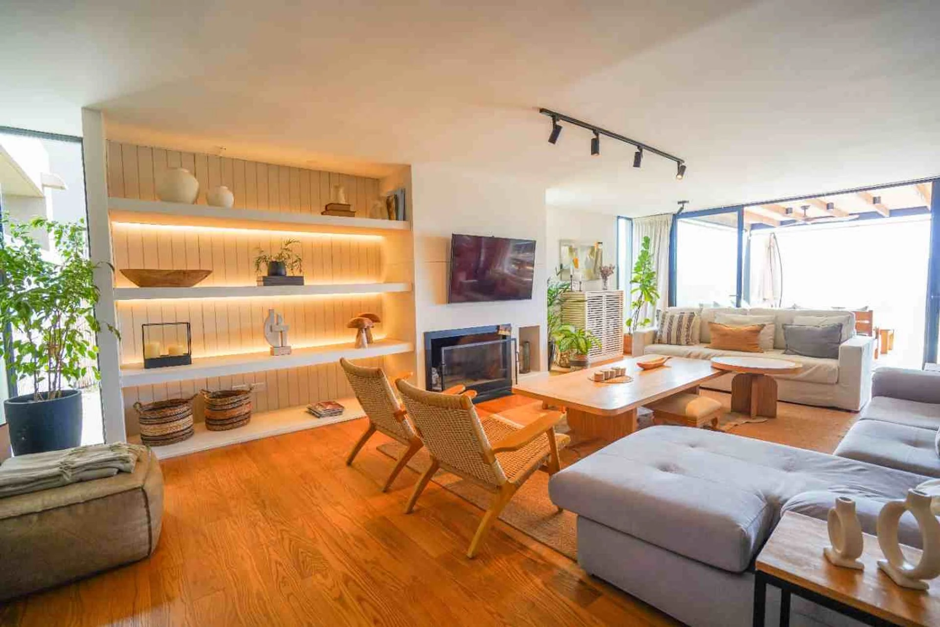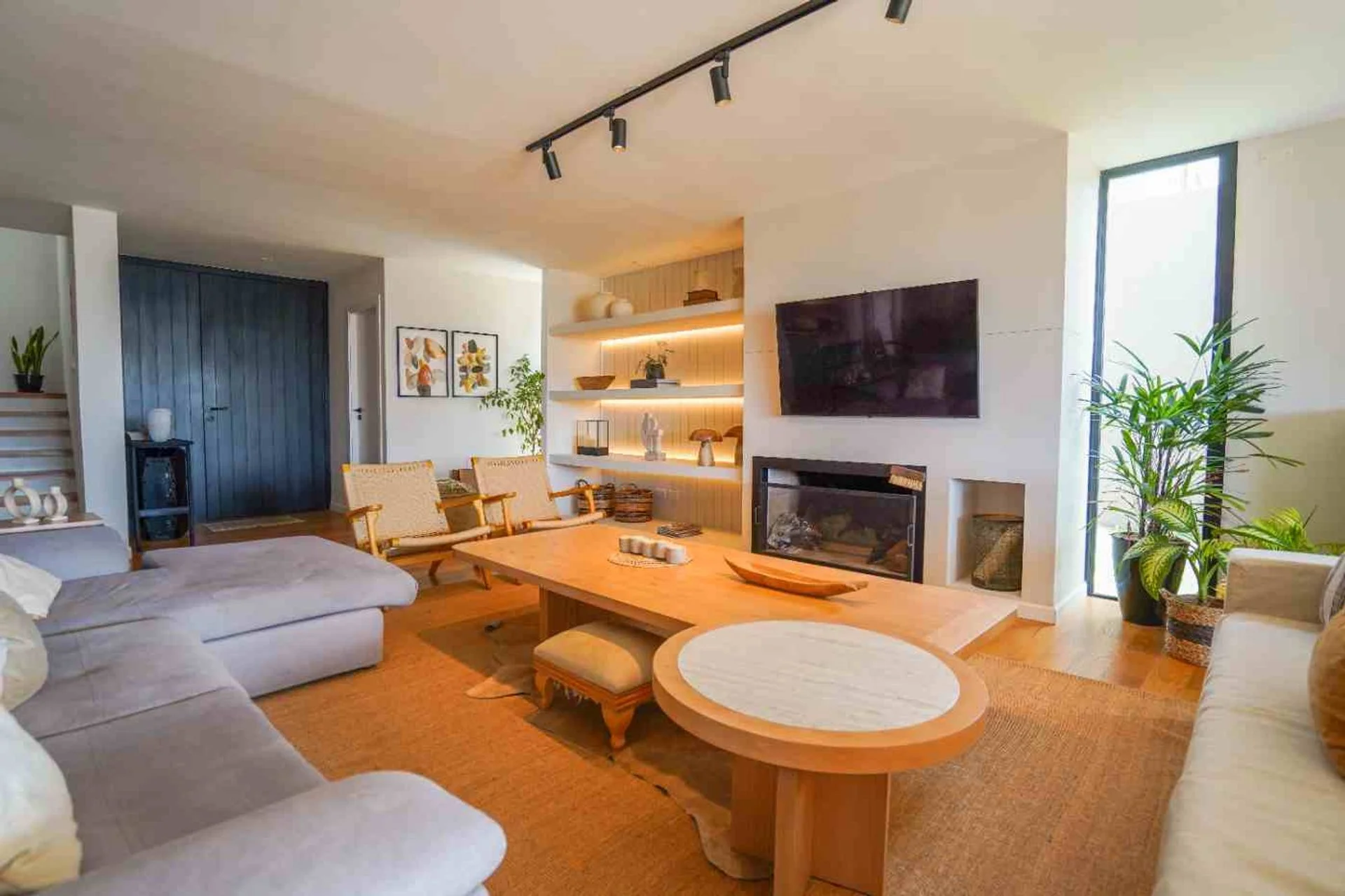 El living comedor, con orientación norte, es un espacio amplio y luminoso que integra una cocina. Cuenta con estufa a leña, aire acondicionado y un segundo ambiente que puede utilizarse como playroom, escritorio o estar. En planta baja también encontramos un toilette y un cuarto y baño de servicio.