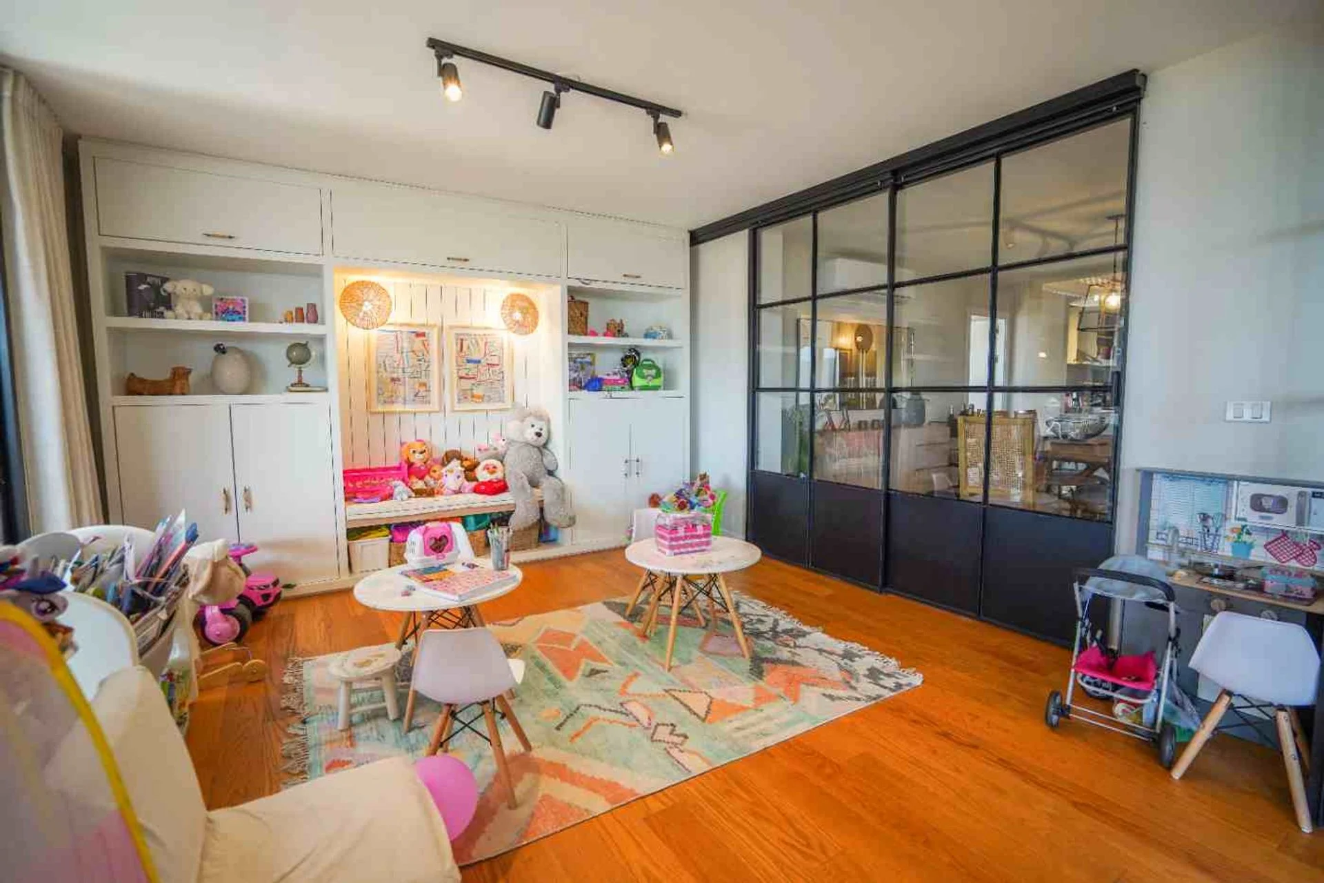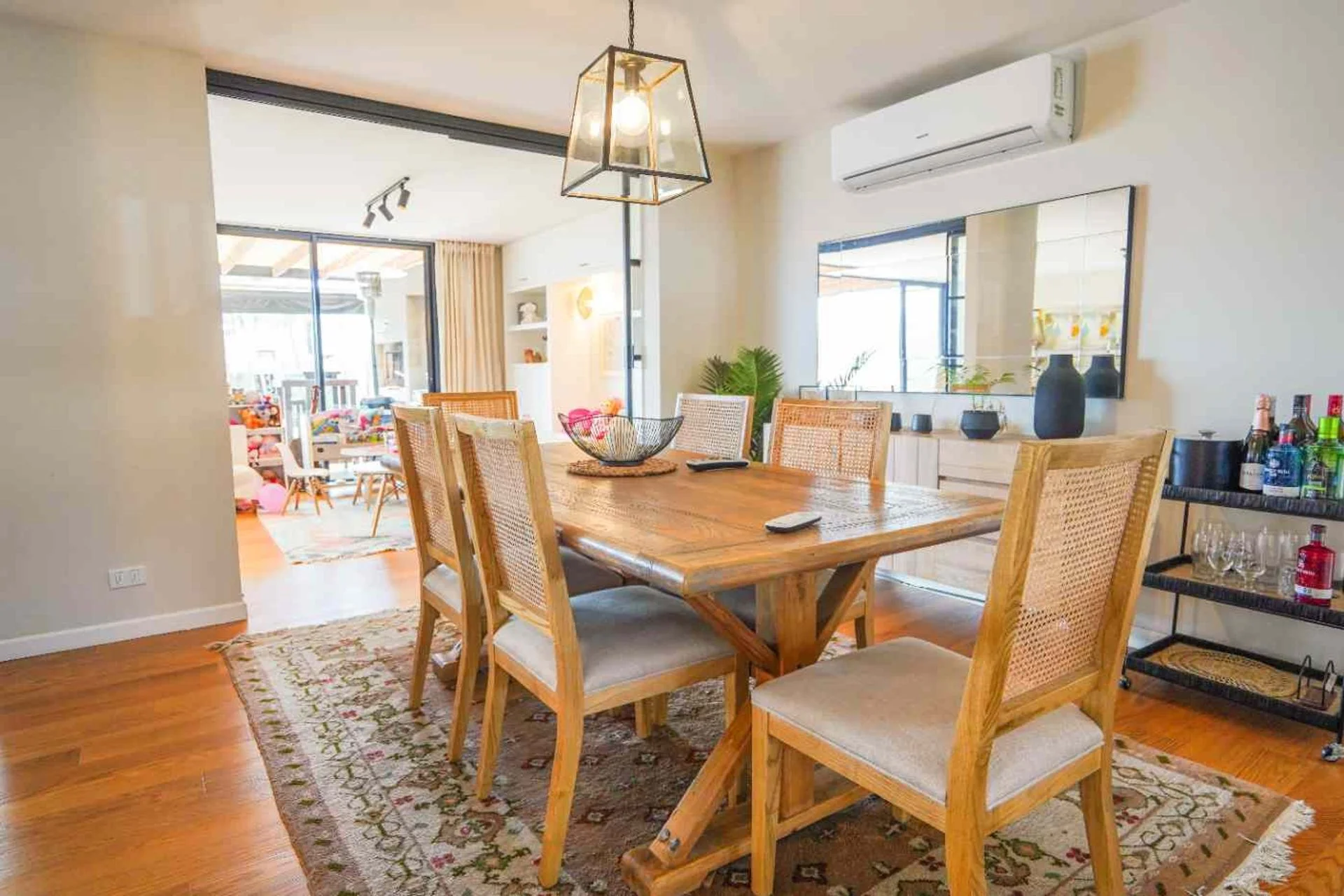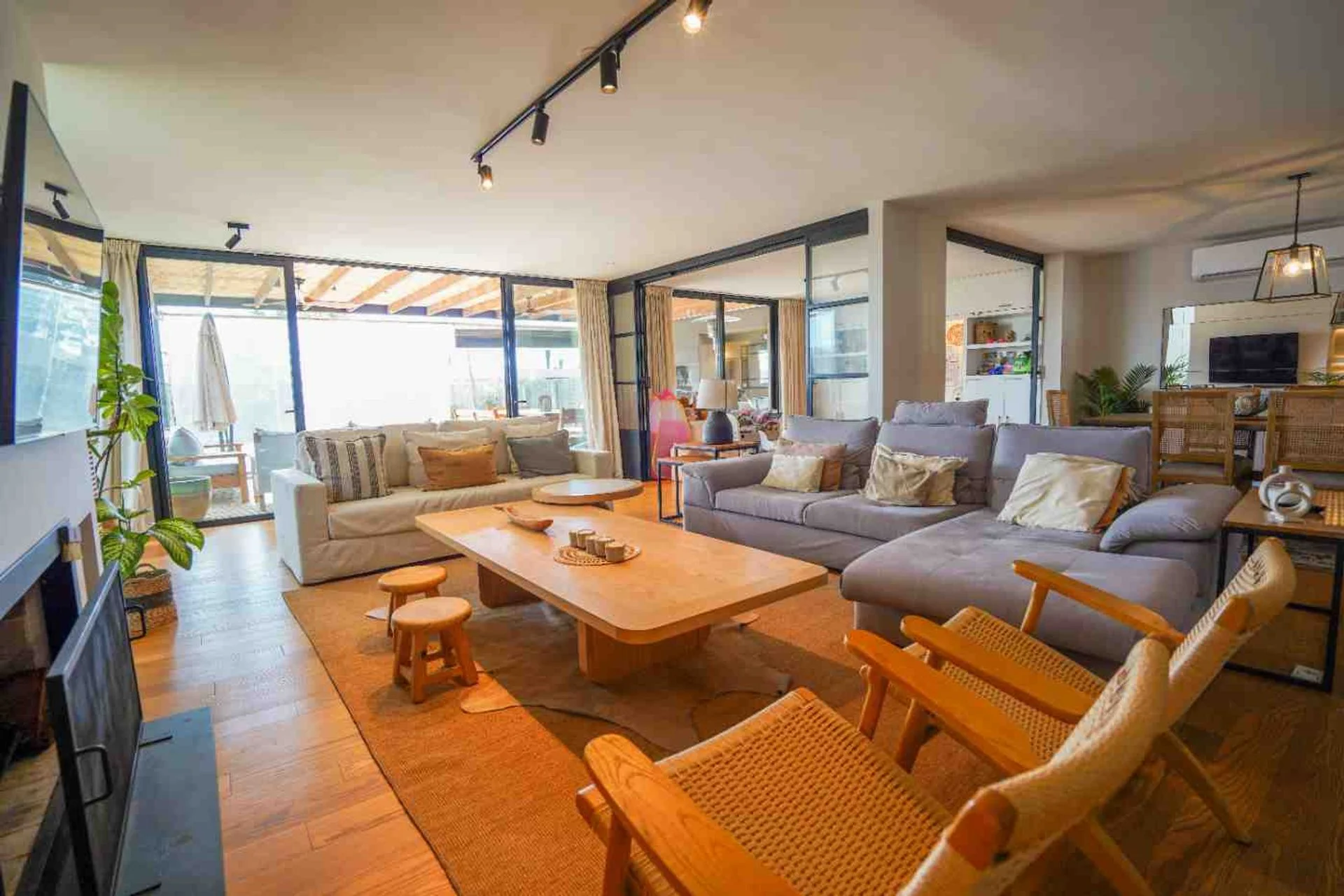 El living comedor, con orientación norte, es un espacio amplio y luminoso que integra una cocina. Cuenta con estufa a leña, aire acondicionado y un segundo ambiente que puede utilizarse como playroom, escritorio o estar. En planta baja también encontramos un toilette y un cuarto y baño de servicio.