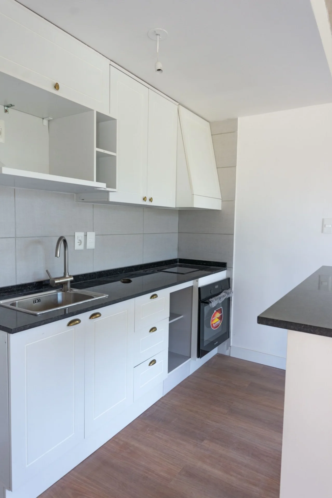 - Cocina: Semi-integrada, equipada con anafe, horno empotrado y campana de extracción.