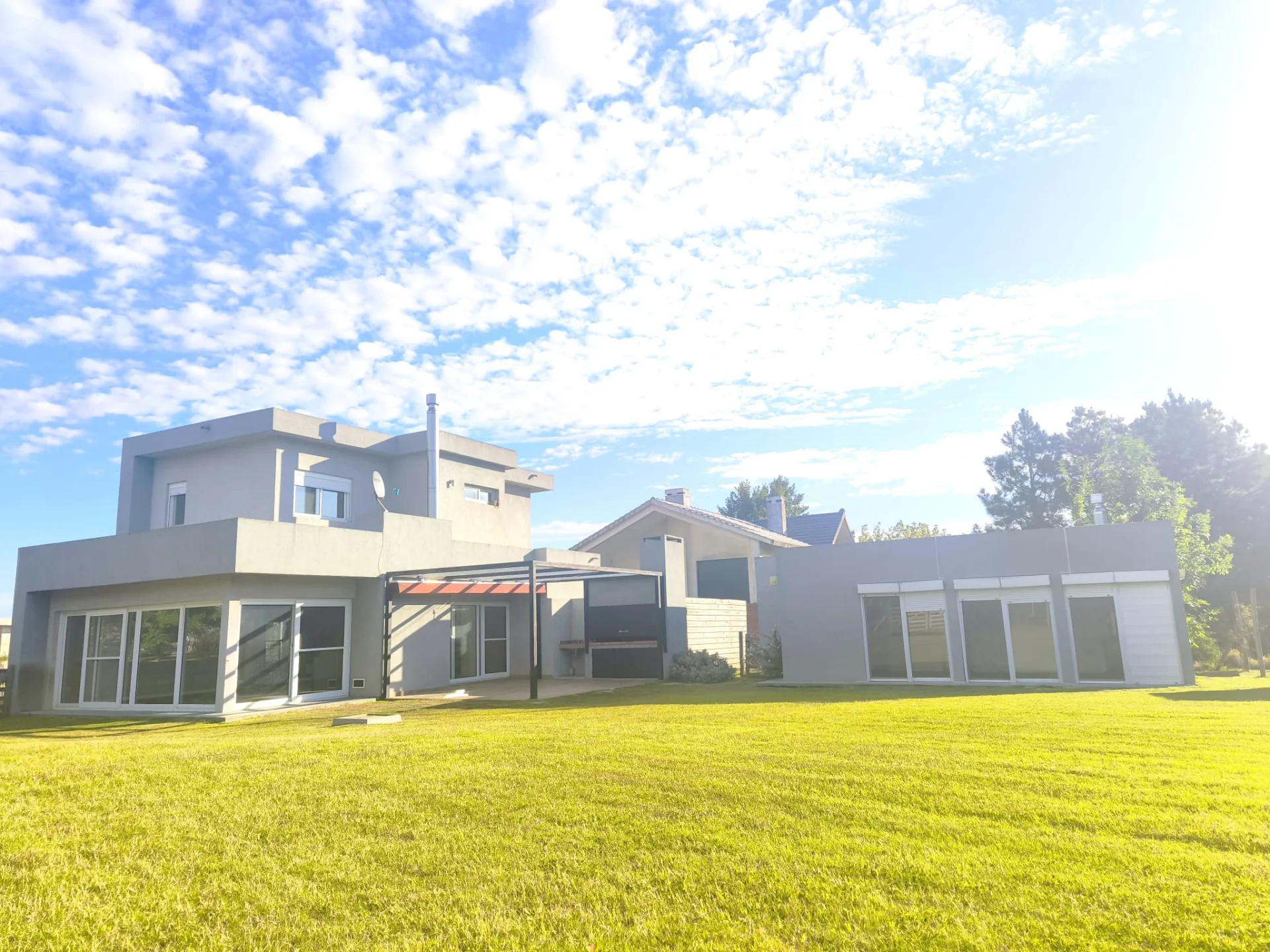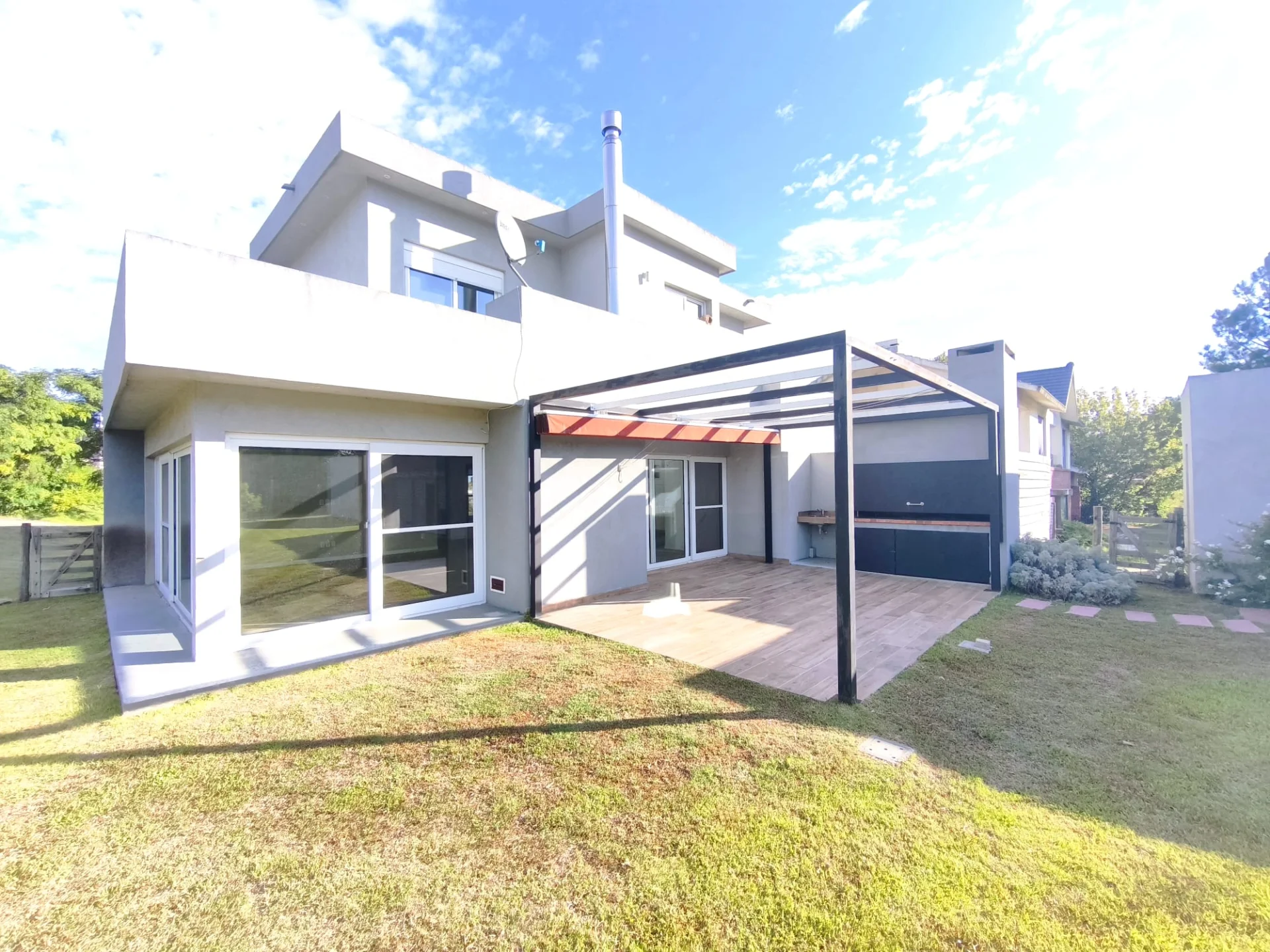 Galería con parrillero, pérgola y deck de madera que conecta a una gran barbacoa cerrada equipada con toilette y kitchenette.