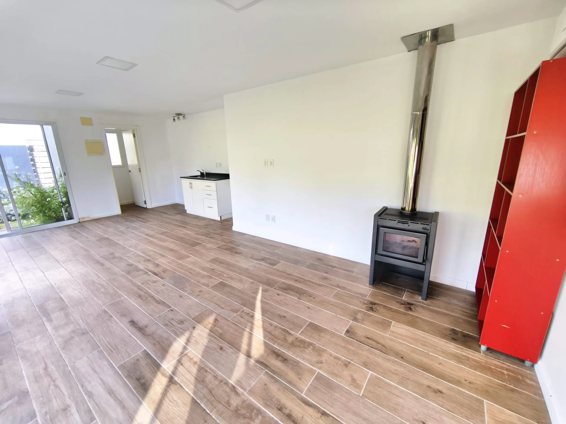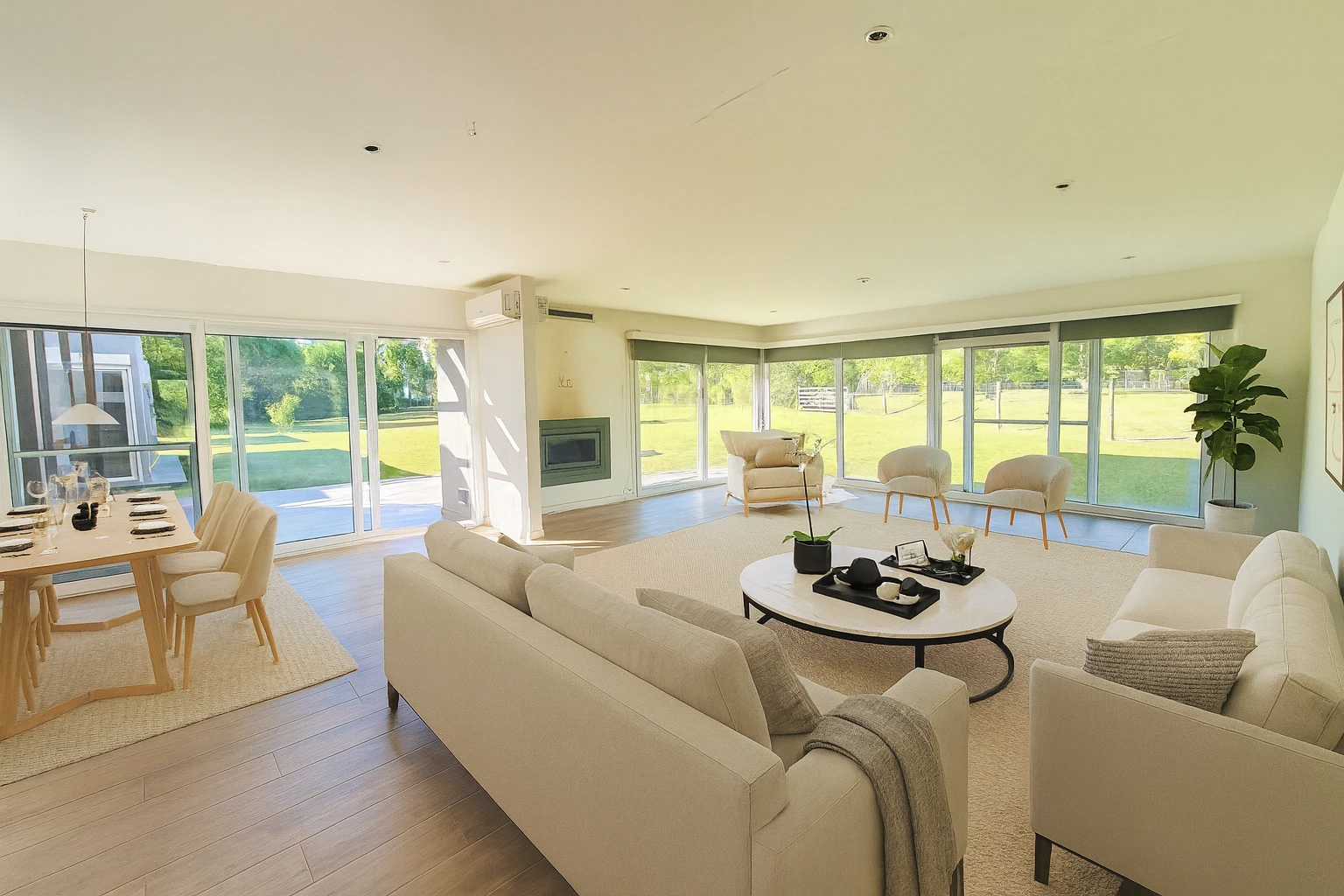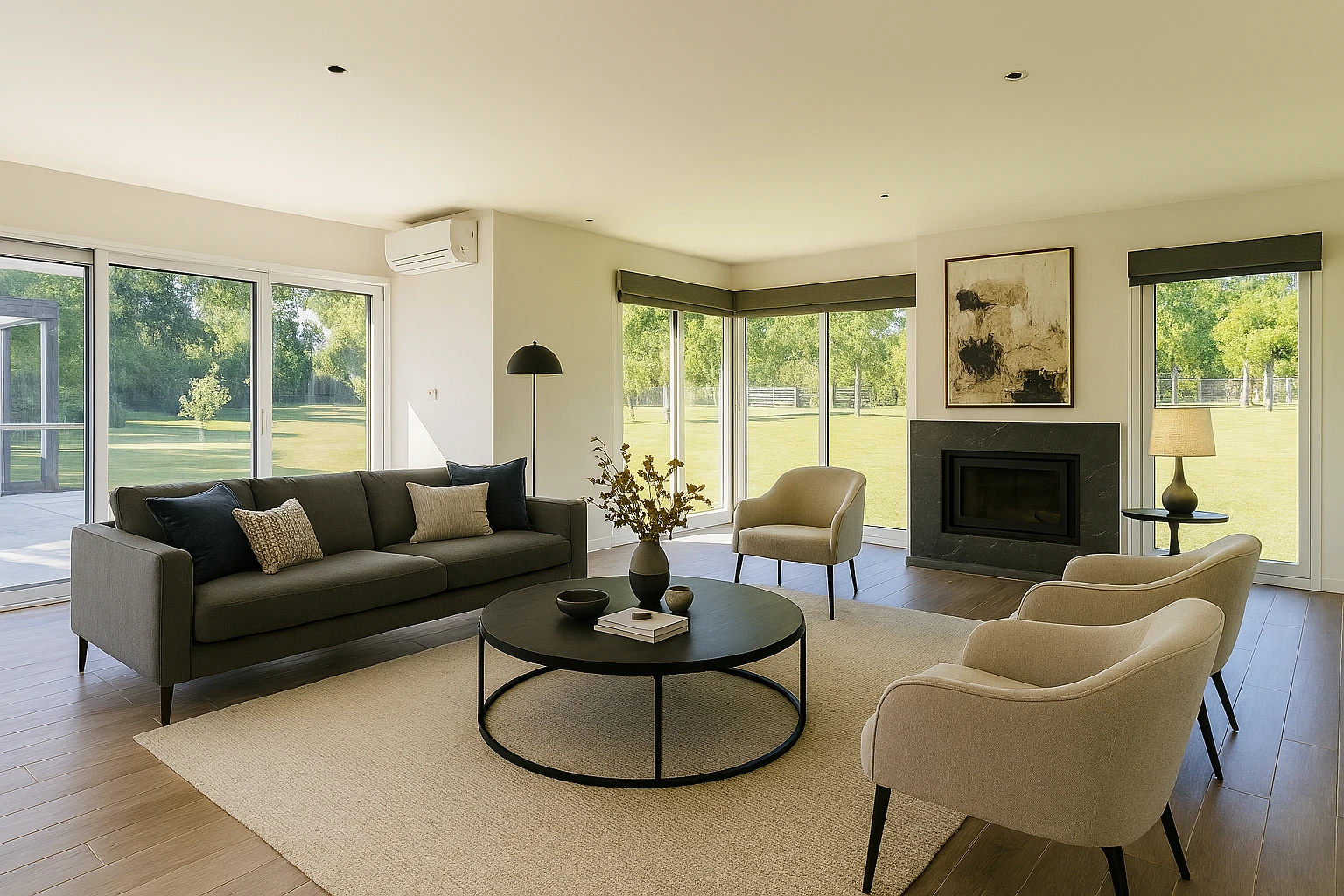 Gran living comedor con estufa de alto rendimiento y ventanales orientados al norte integrados completamente al jardín.