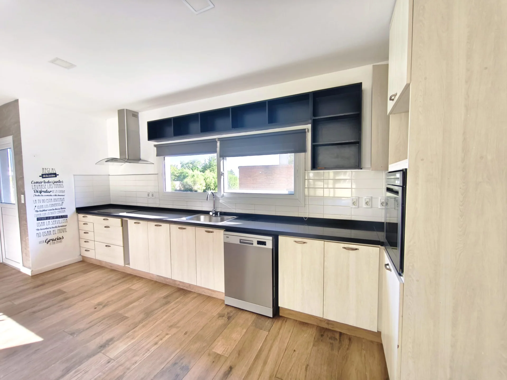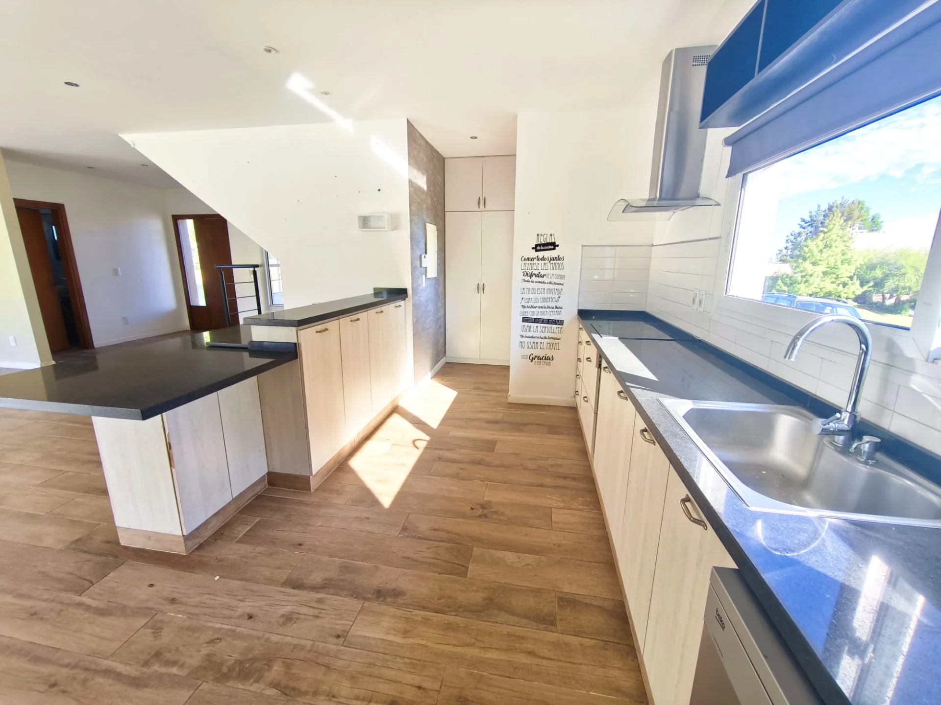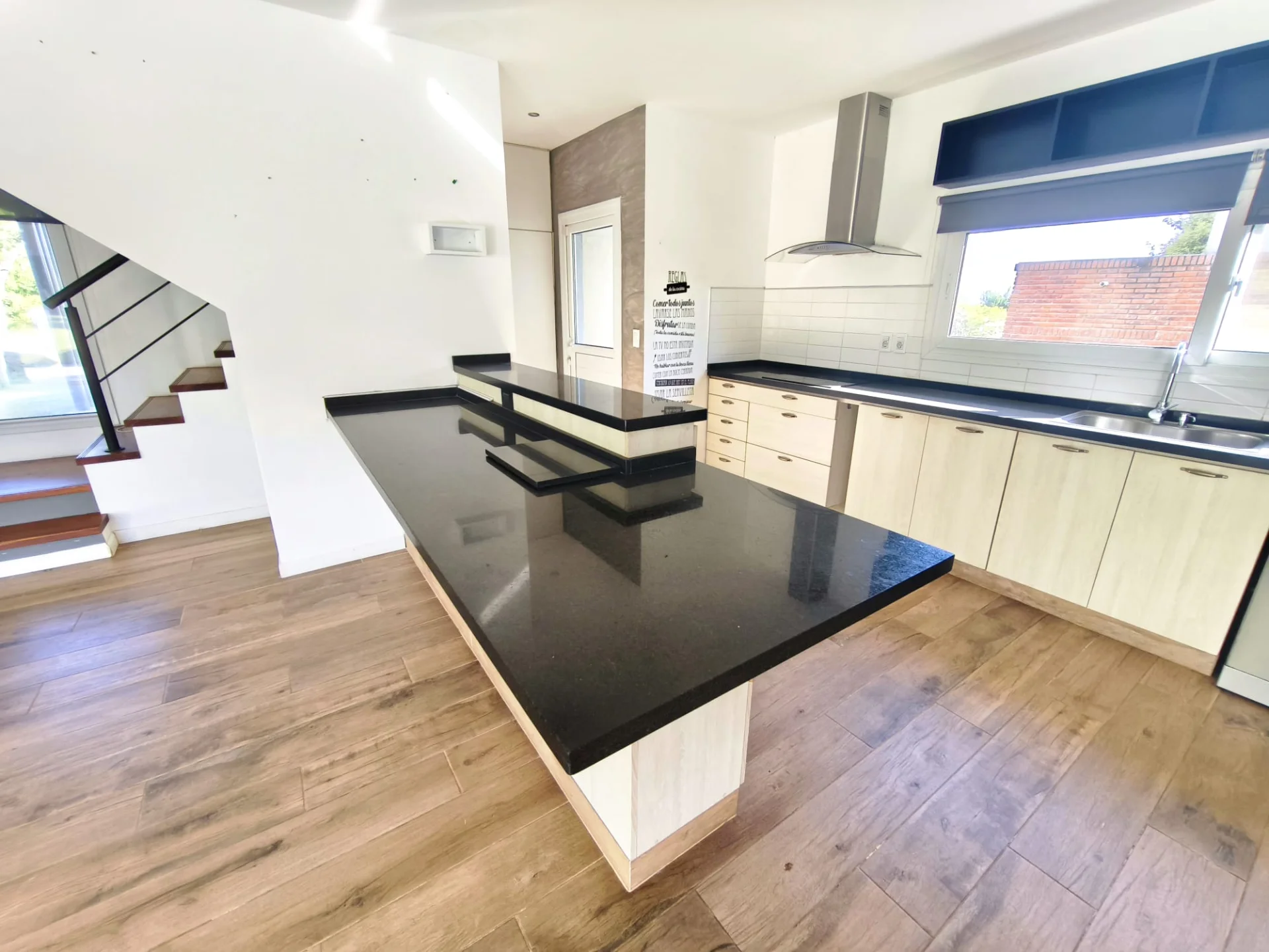 Cocina integrada con gran península y desayunador.