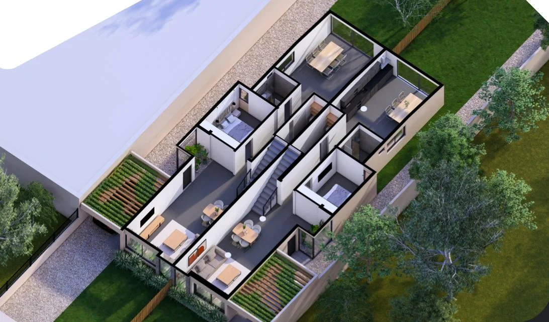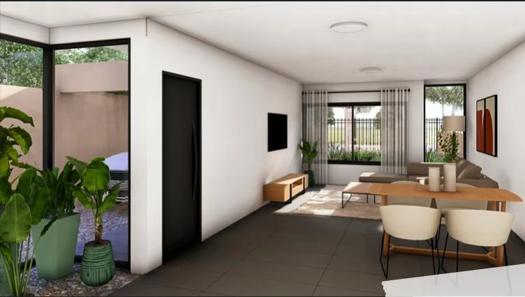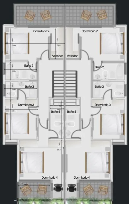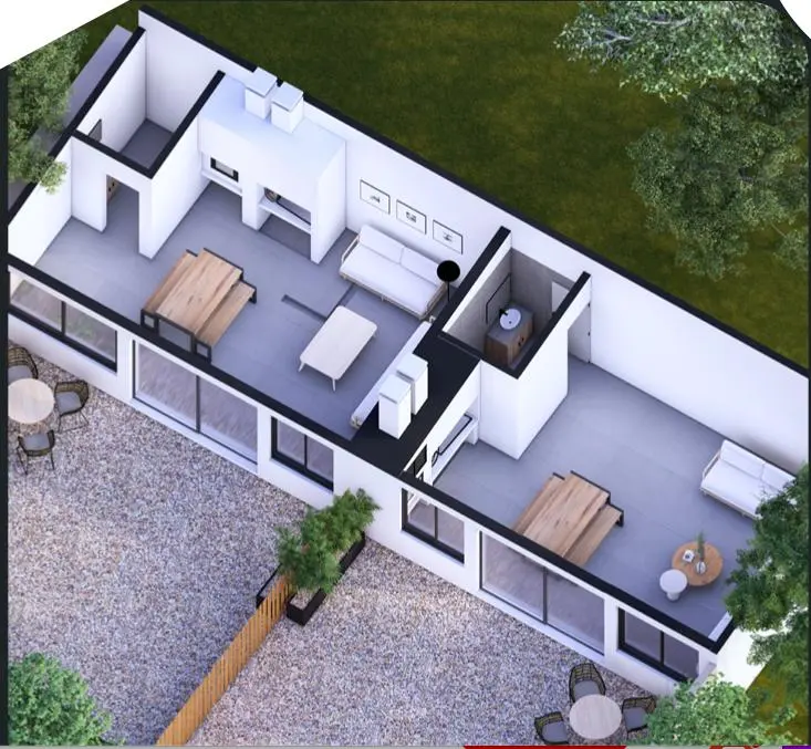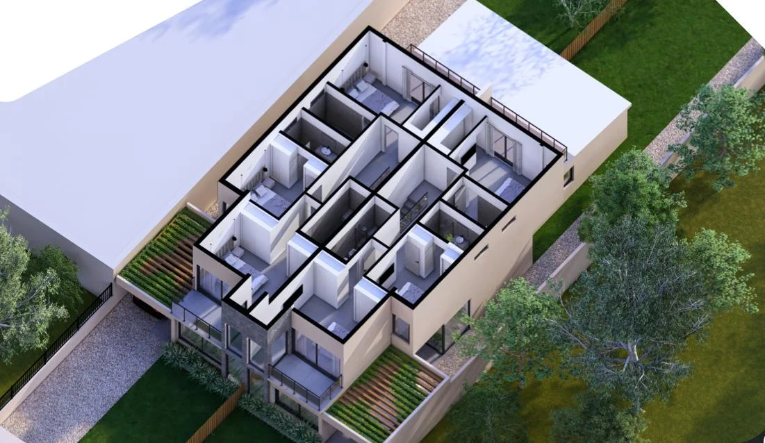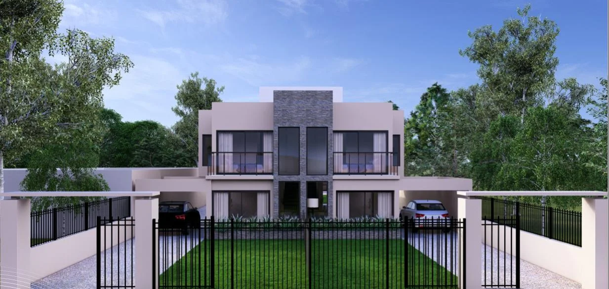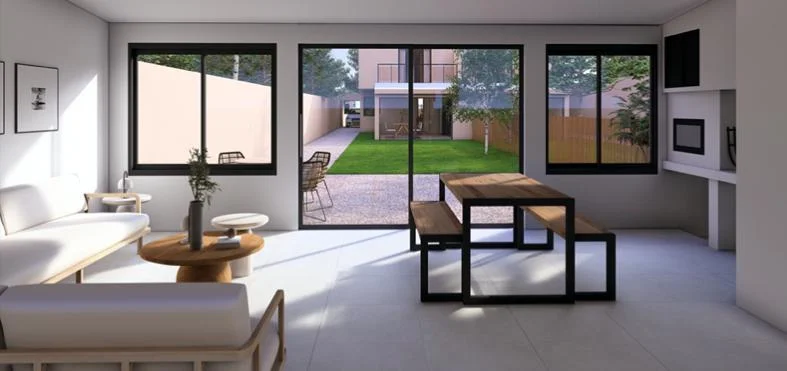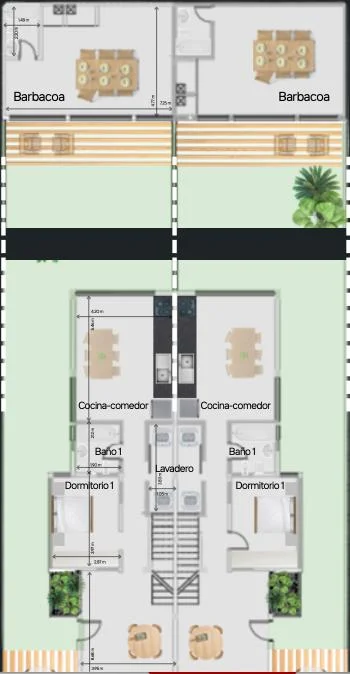 El desarrollo se compone de dos unidades de alta categoría en propiedad horizontal, cada una con cuatro dormitorios y áreas sociales diseñadas para maximizar el confort y la funcionalidad. La planta baja incluye un living comedor, cocina integrada a otro comedor, un baño completo, un dormitorio y lavadero. Desde aquí, se accede a un amplio espacio verde con una barbacoa independiente que incluye un baño completo y parrillero.