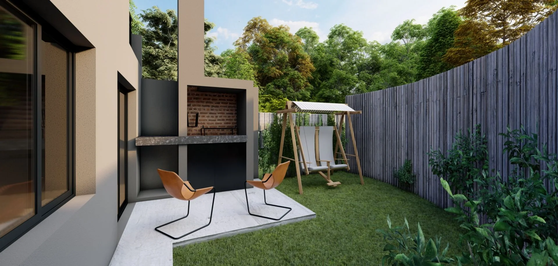 Parrillero y amplio jardín al fondo con muro perimetral