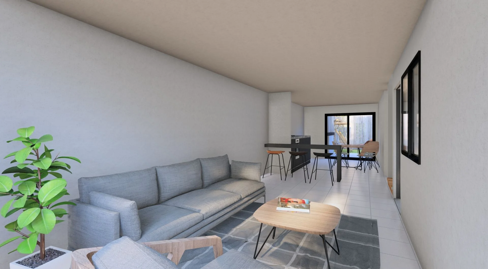En planta baja, la casa ofrece un ambiente integrado de cocina y comedor, amplio y luminoso, ideal para disfrutar en familia o con amigos. También cuenta con un dormitorio con acceso directo al patio y un baño social.