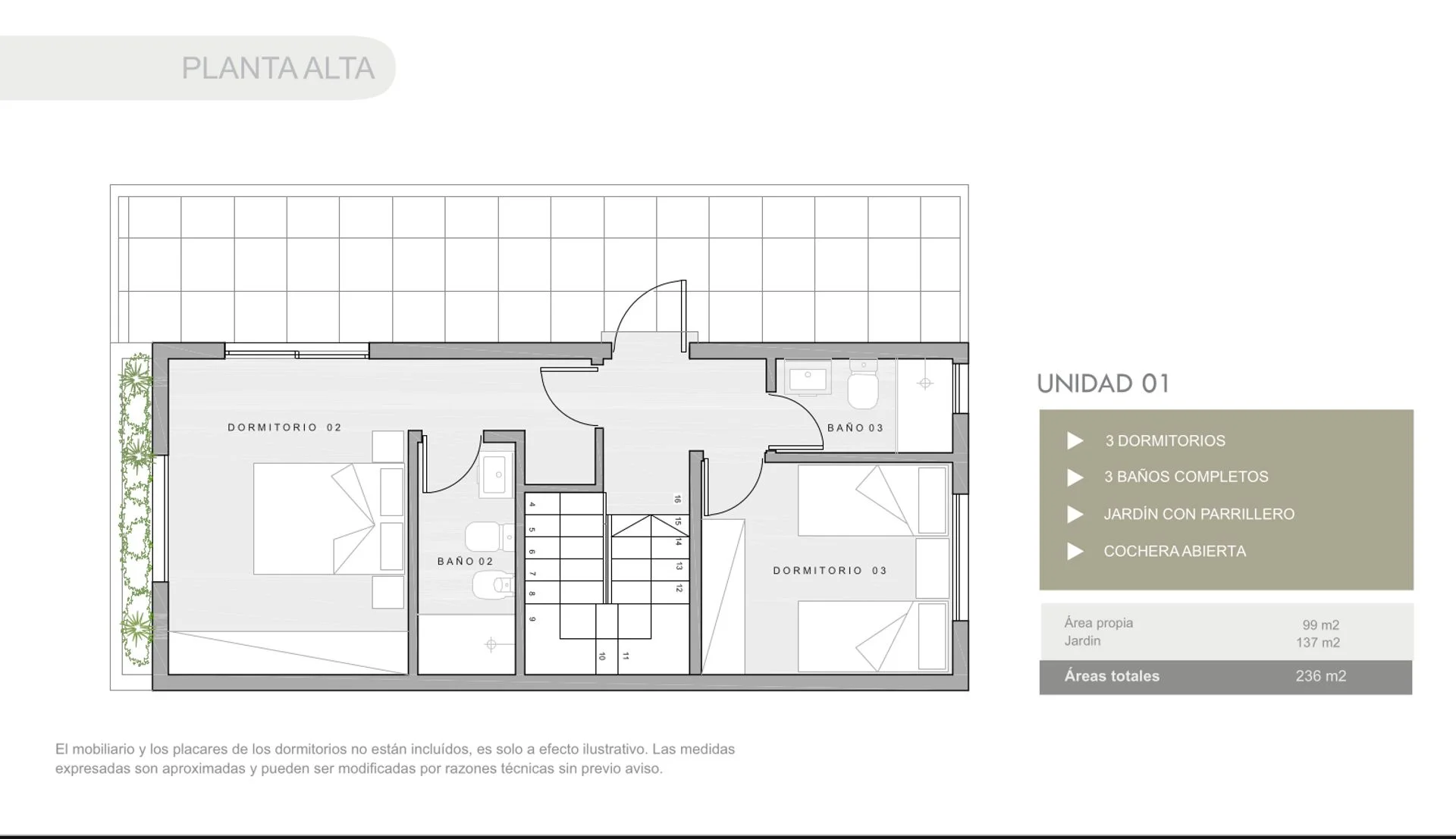 En planta alta se encuentra el dormitorio principal en suite, amplio y muy iluminado, junto con un tercer dormitorio y otro baño completo.