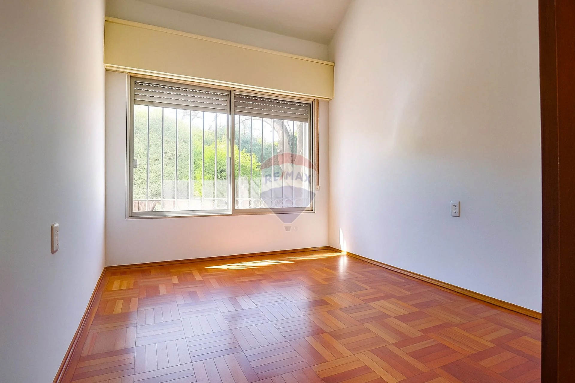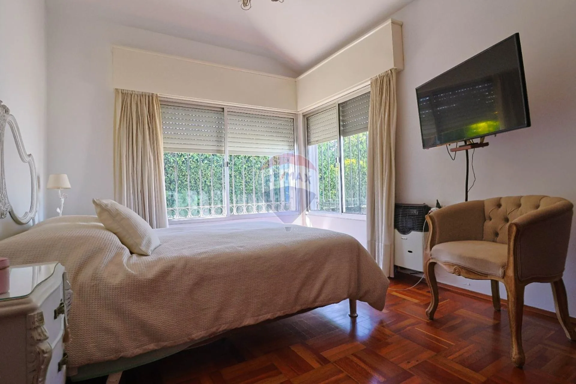 En la parte intima (también separada por una puerta) se conecta mediante un corredor los tres dormitorios, los dos baños y el estudio (que puede ser un cuarto dormitorio). Todos los dormitorios tienen placares de cedro y piso de parquet en excelente estado.