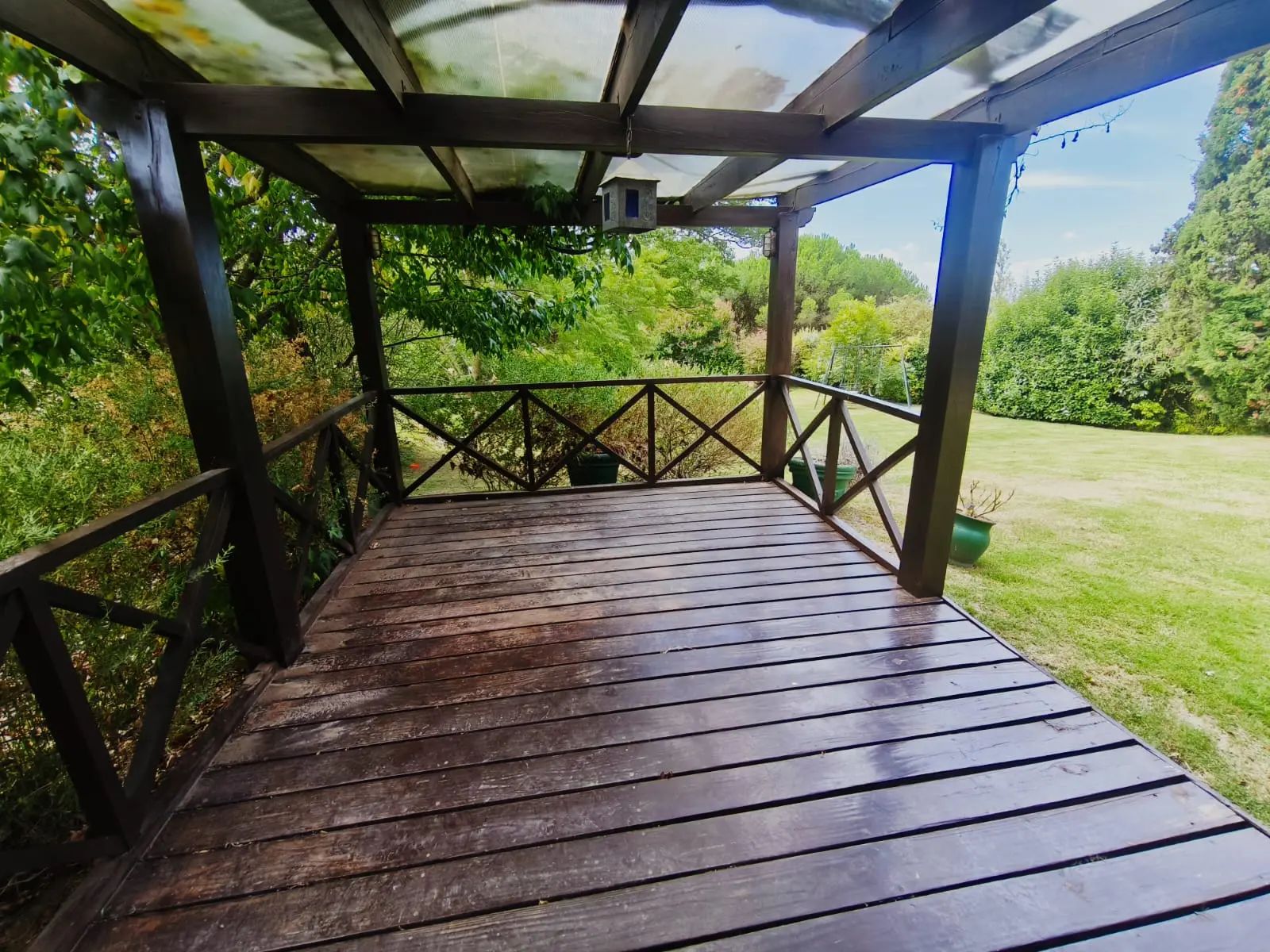 El patio exterior incluye pérgola de madera y un segundo parrillero.