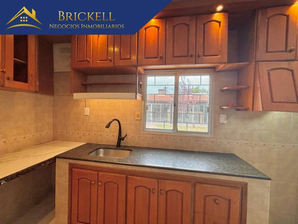 Cuenta con una cocina con muebles en cedro, mesada de marmol, integrada al living-comedor, creando un espacio funcional y acogedor.