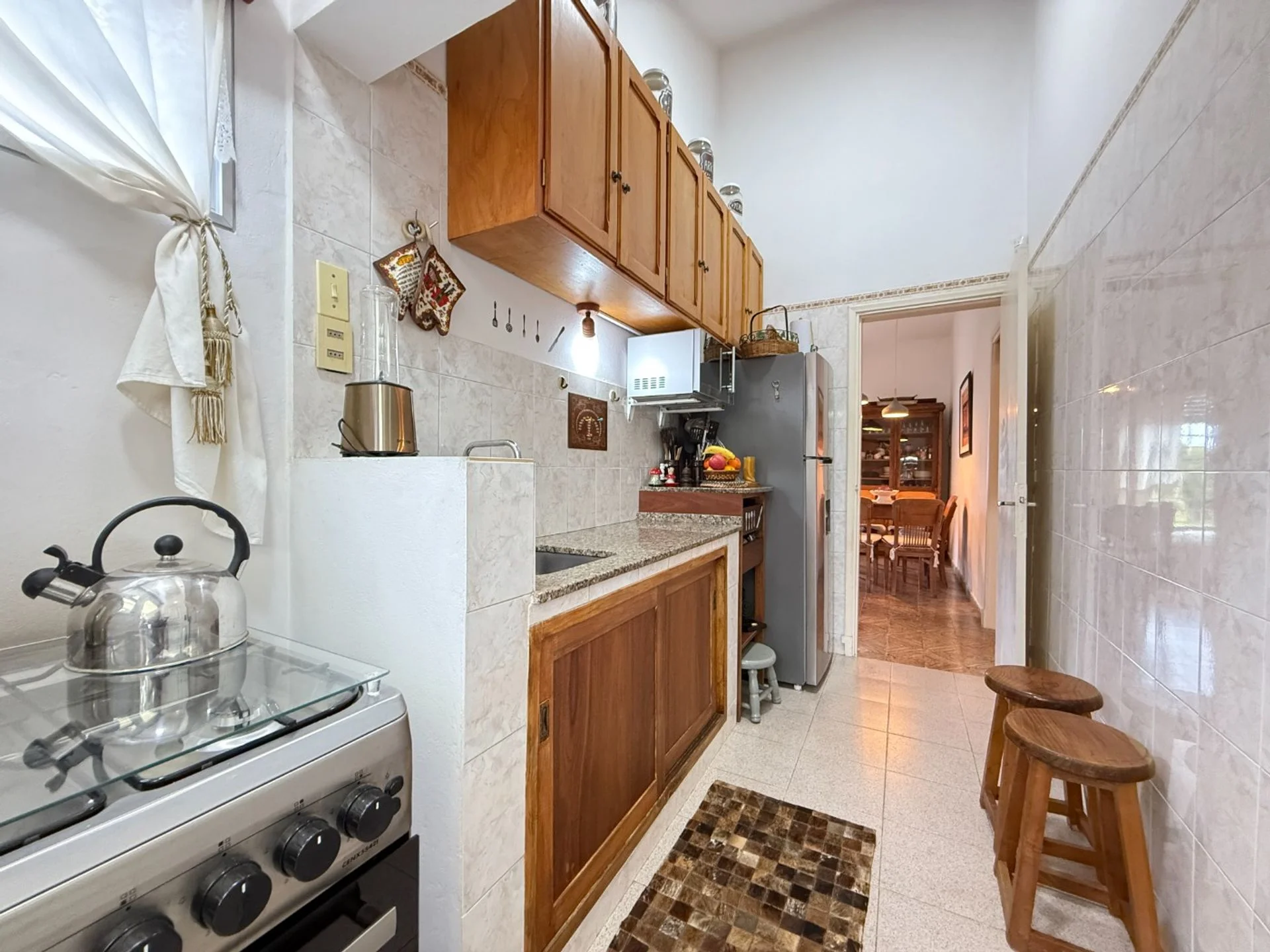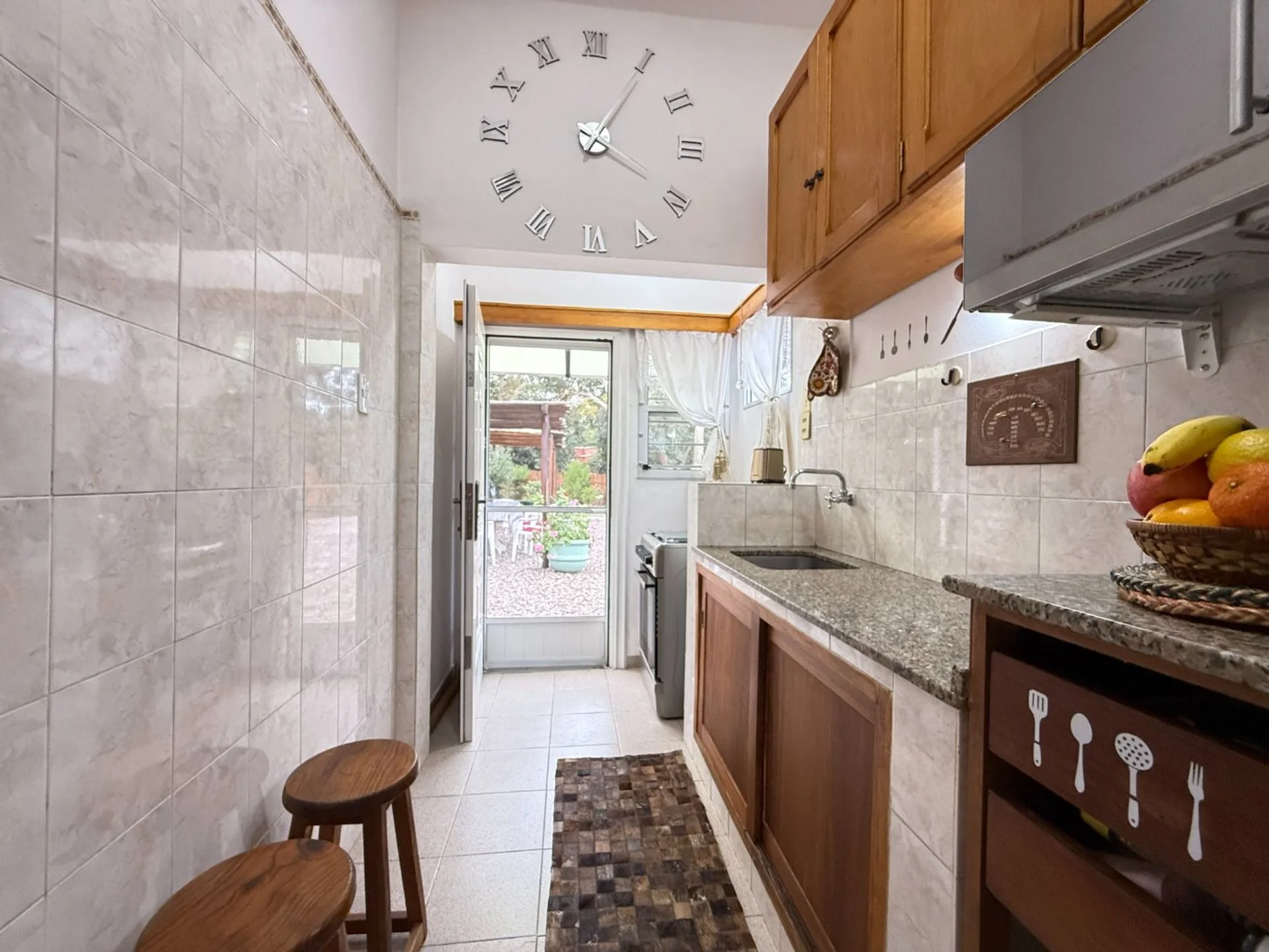 Cocina con mesada de granito, mueble bajo mesada y aéreos, y puerta con mosquitero para salir al fondo.