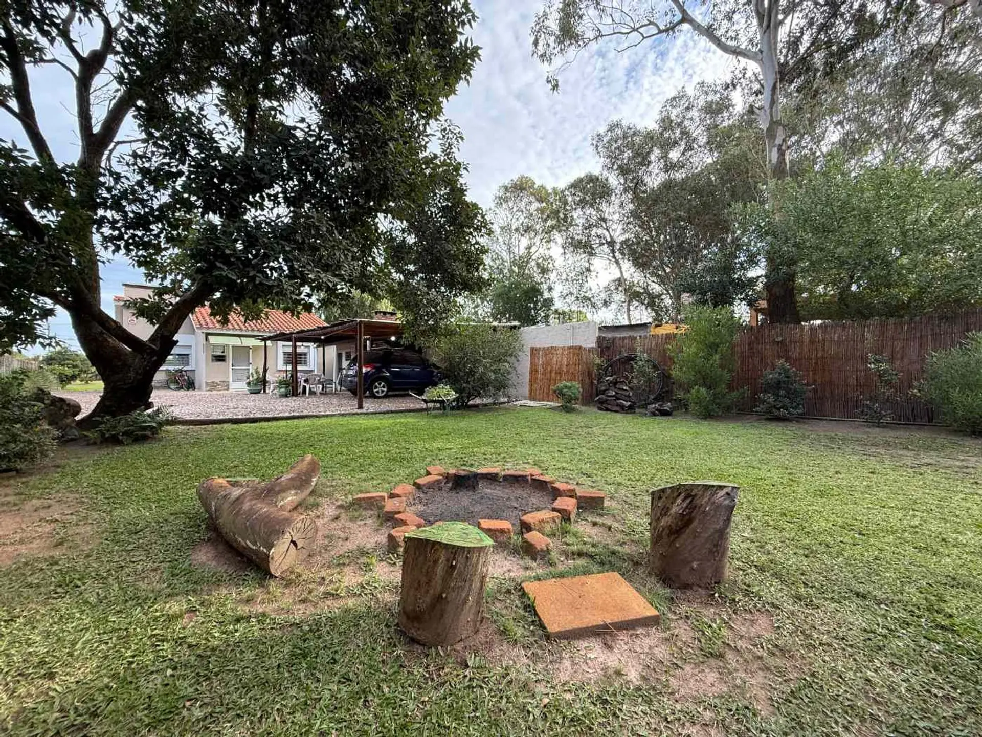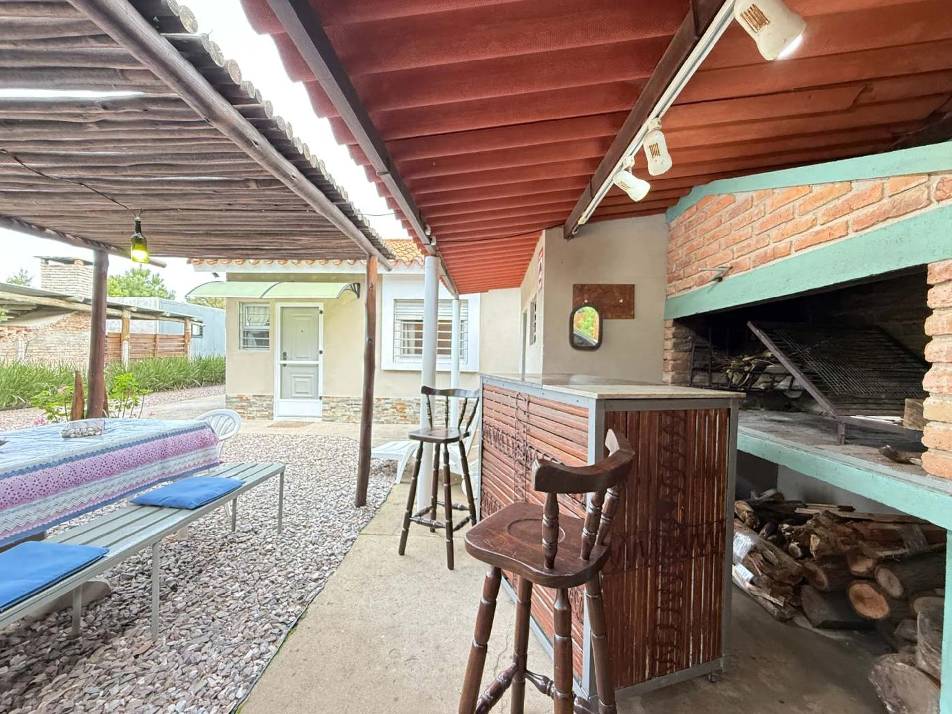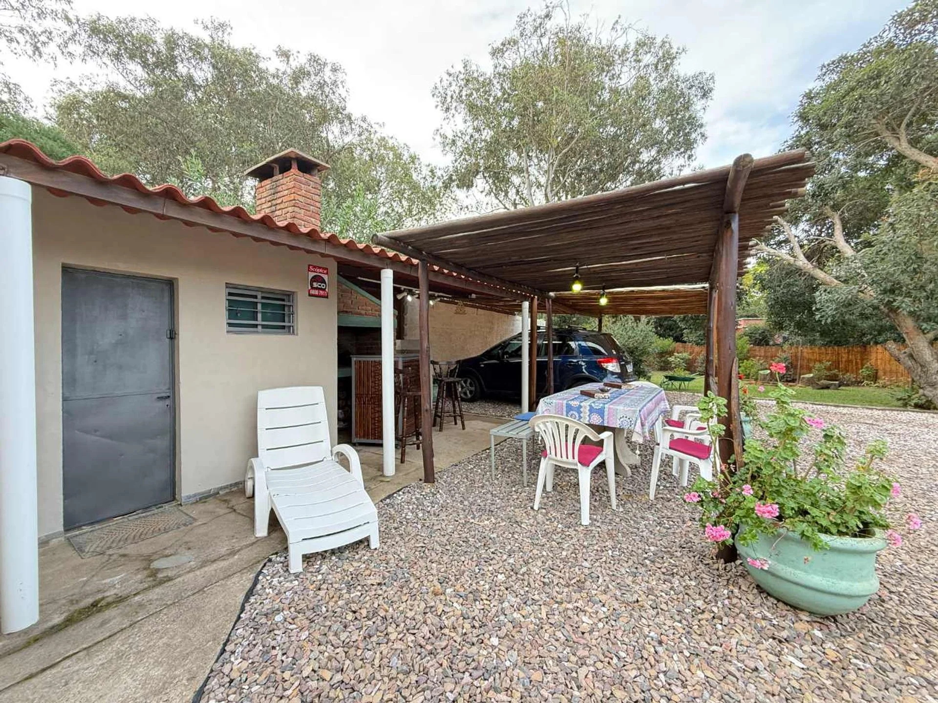 Gran patio con un pequeño galpón, un amplio parrillero techado con una barra, pérgola con mesa, y cochera para dos autos.