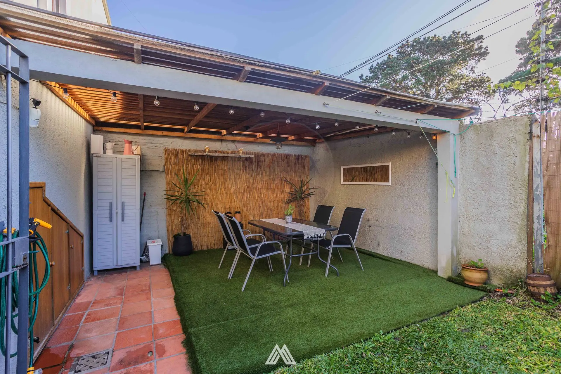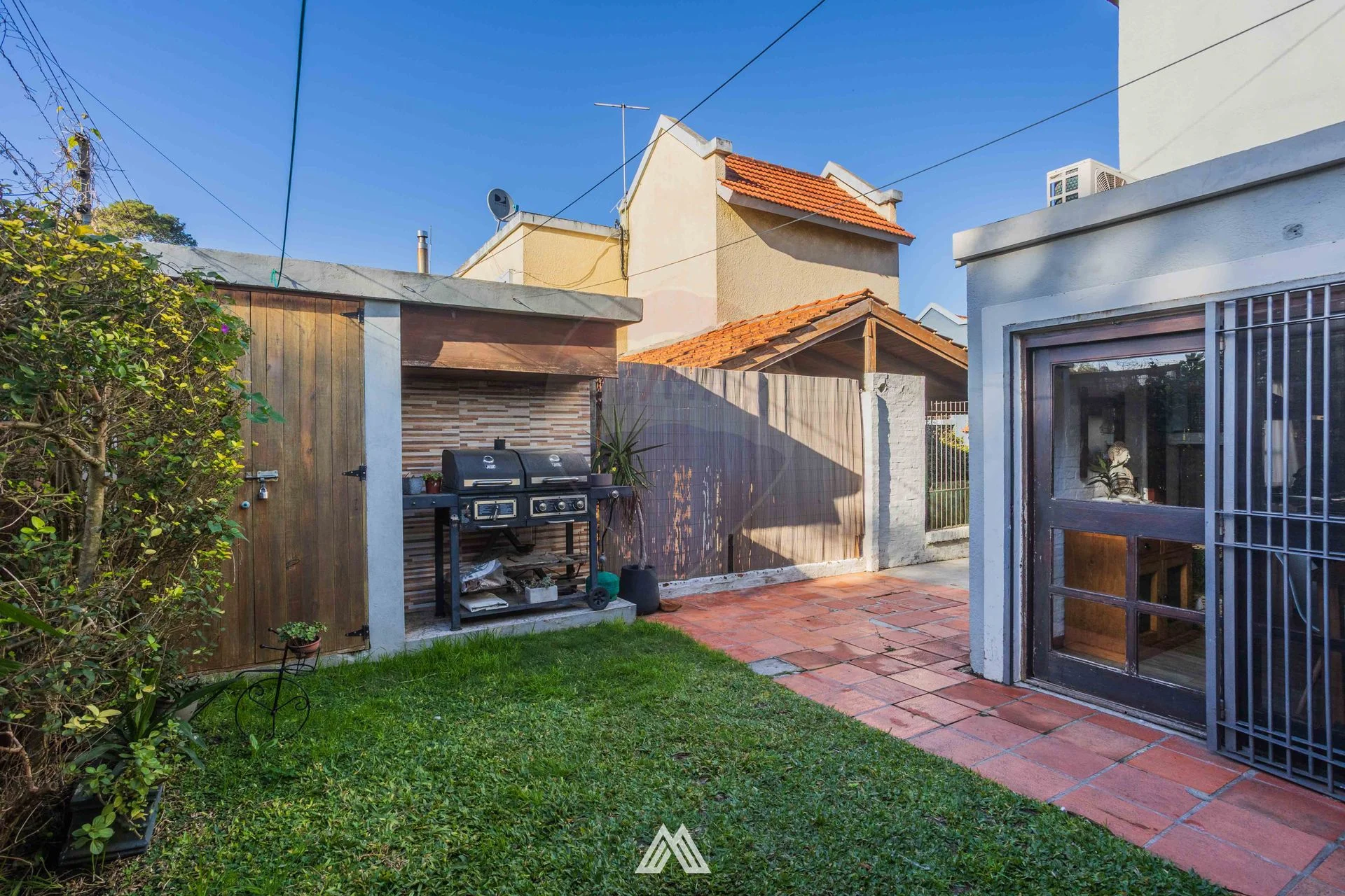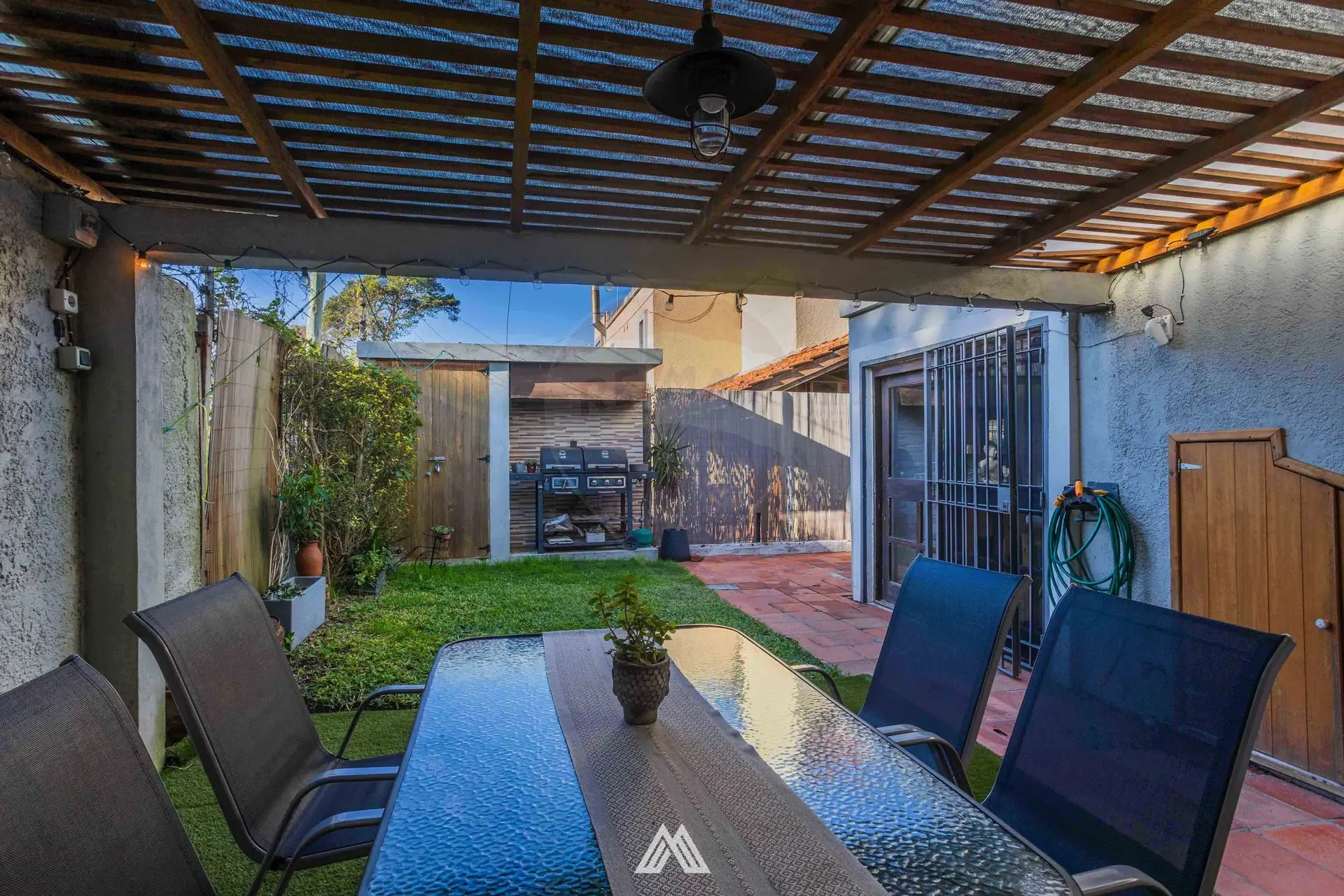 Fondo con una parte abierta y otra semi techada, ideal para reuniones al aire libre, con espacio de guardado para todas tus cosas. En el lateral cuenta con doble cochera.