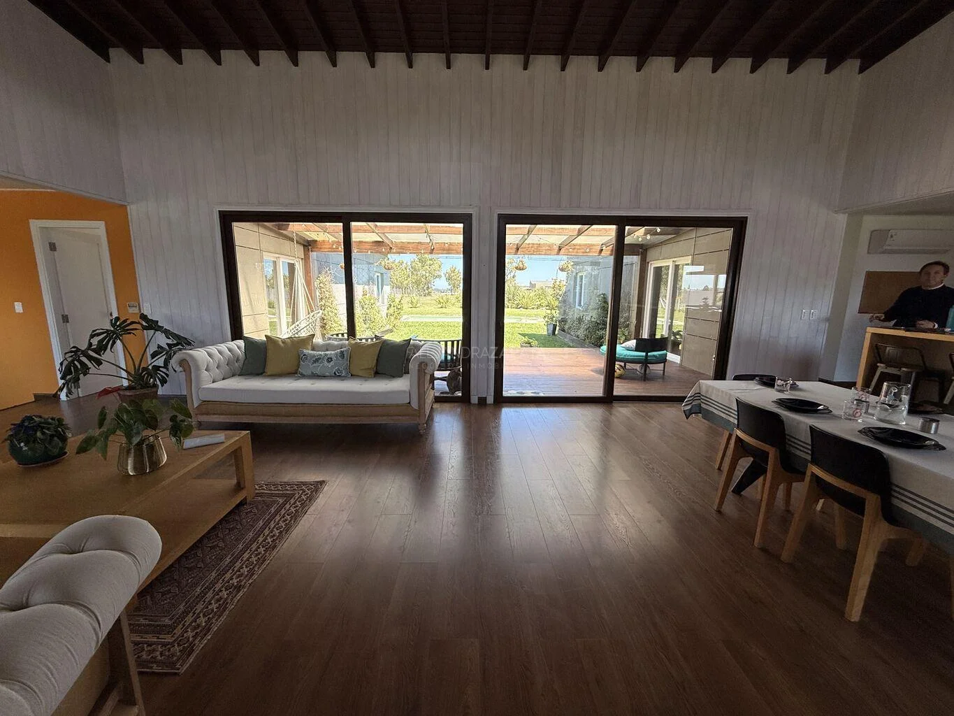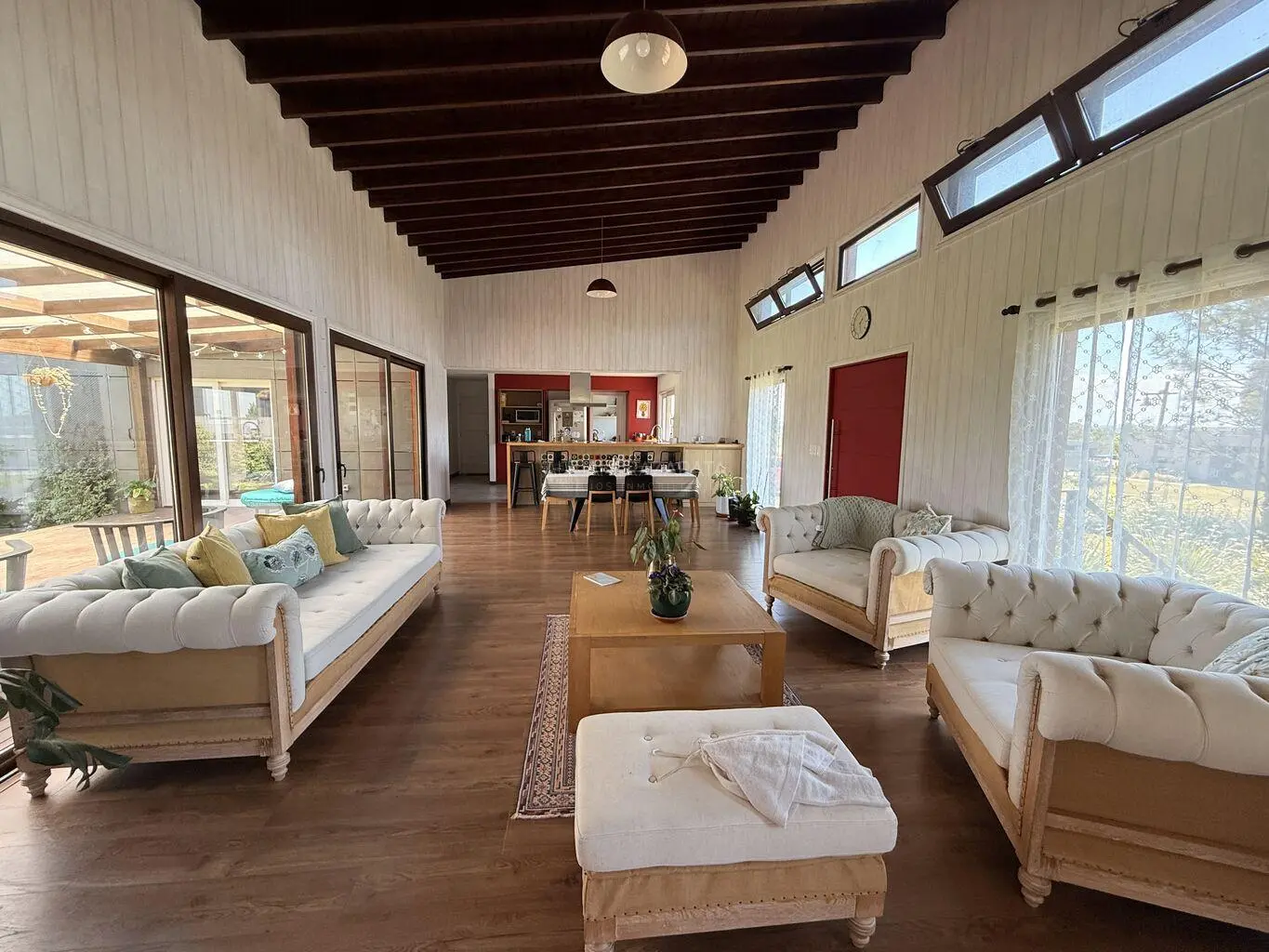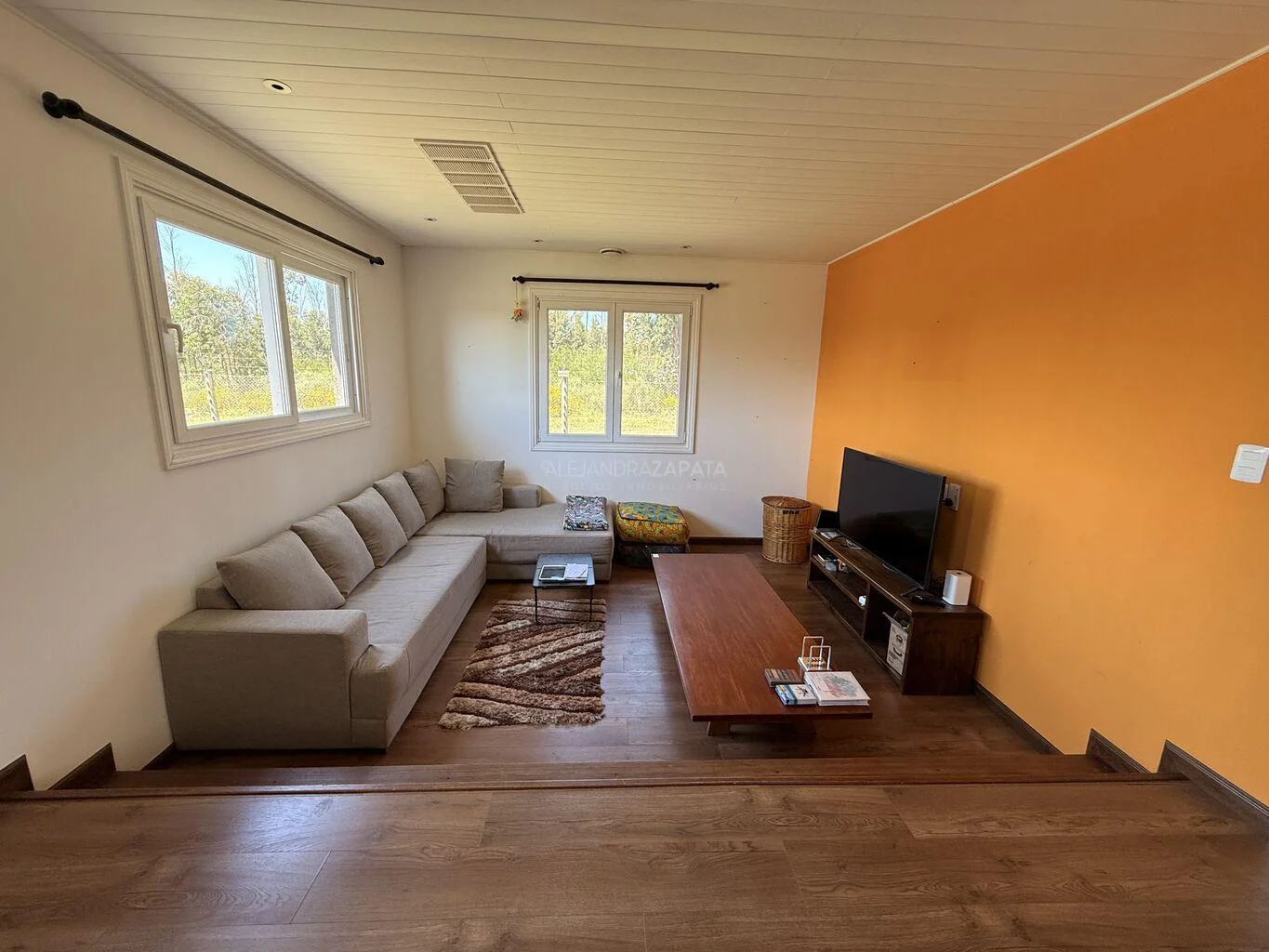 Hacia el área izquierda de ese mismo salón tenemos armado un gran living con vista al hermoso jardín verde y bajando unos escalones se generó un lindo estar con la televisión.