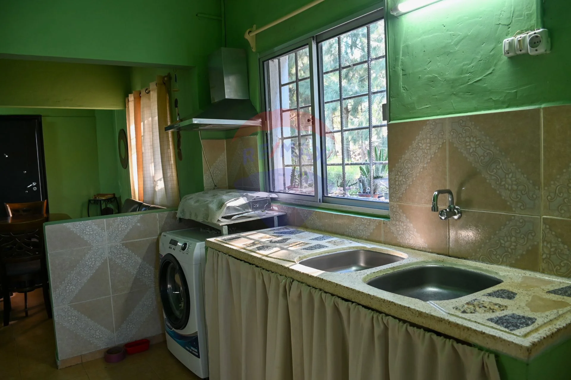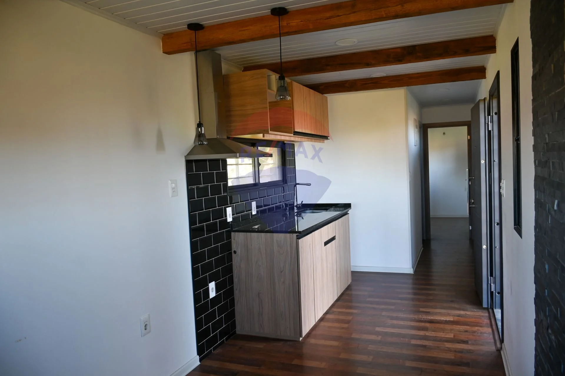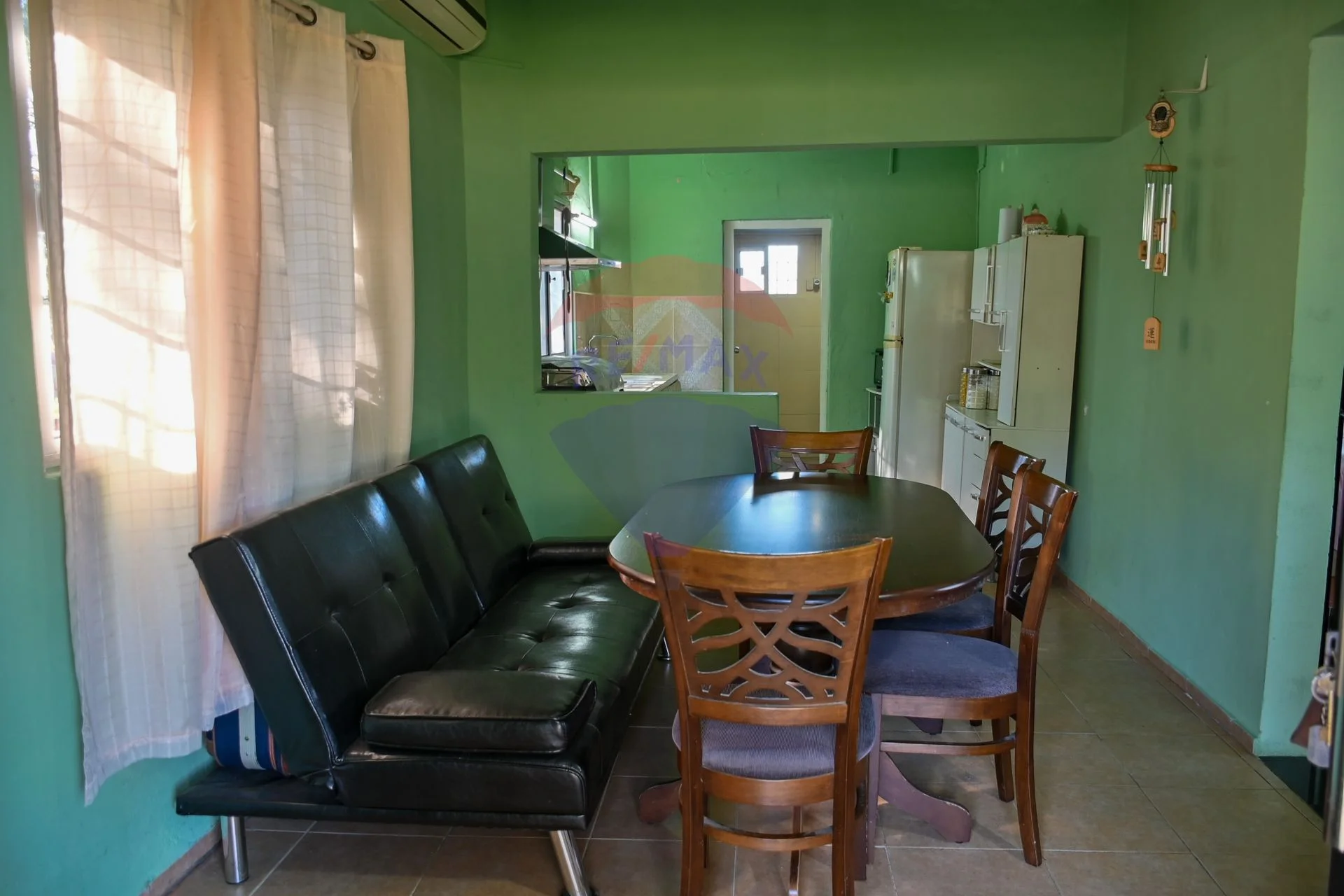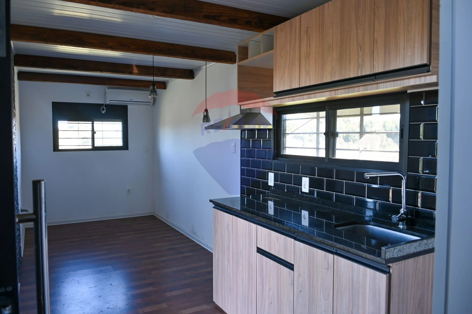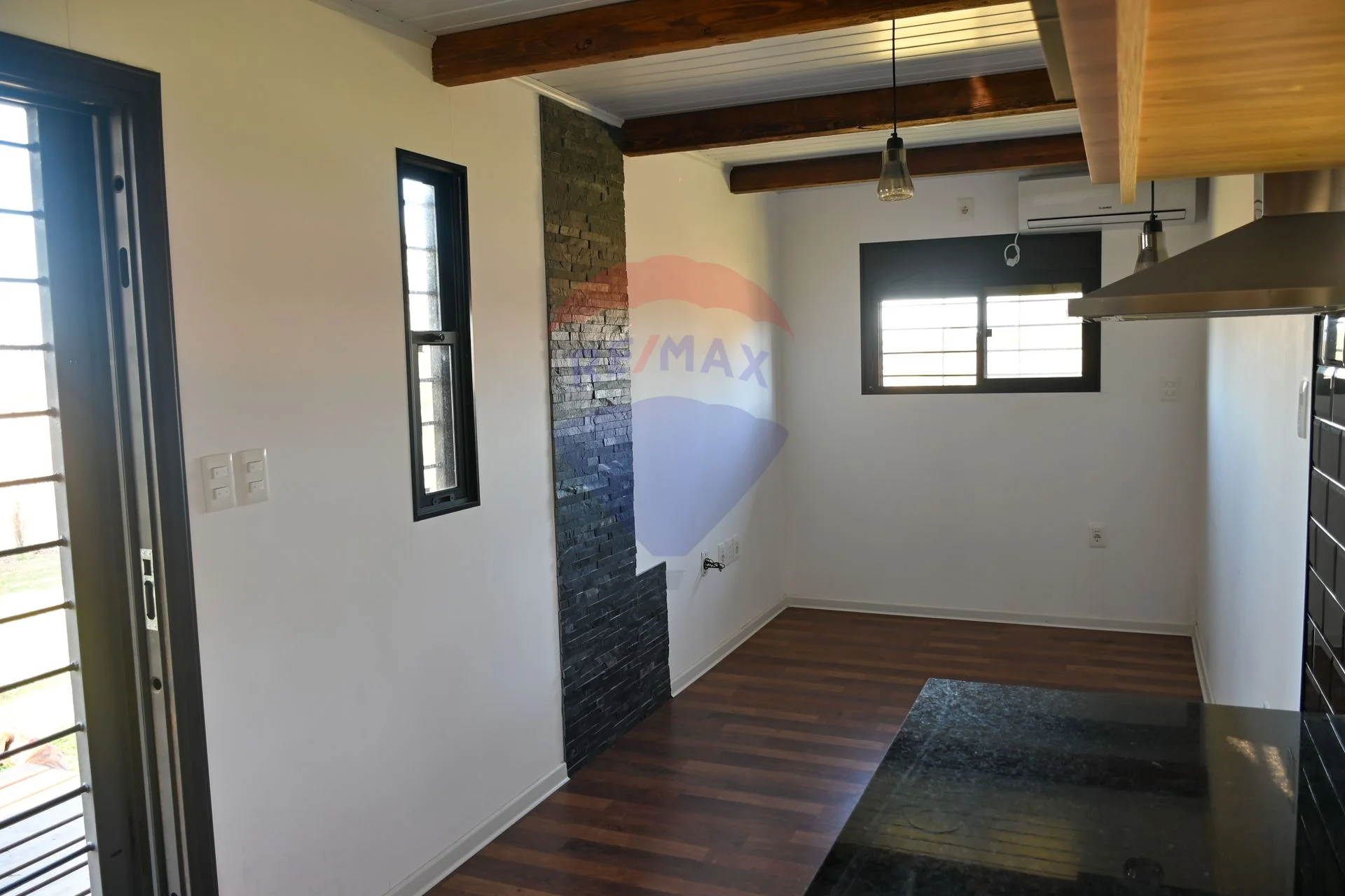 Living-comedor con aire acondicionado y cocina integrada con campana.