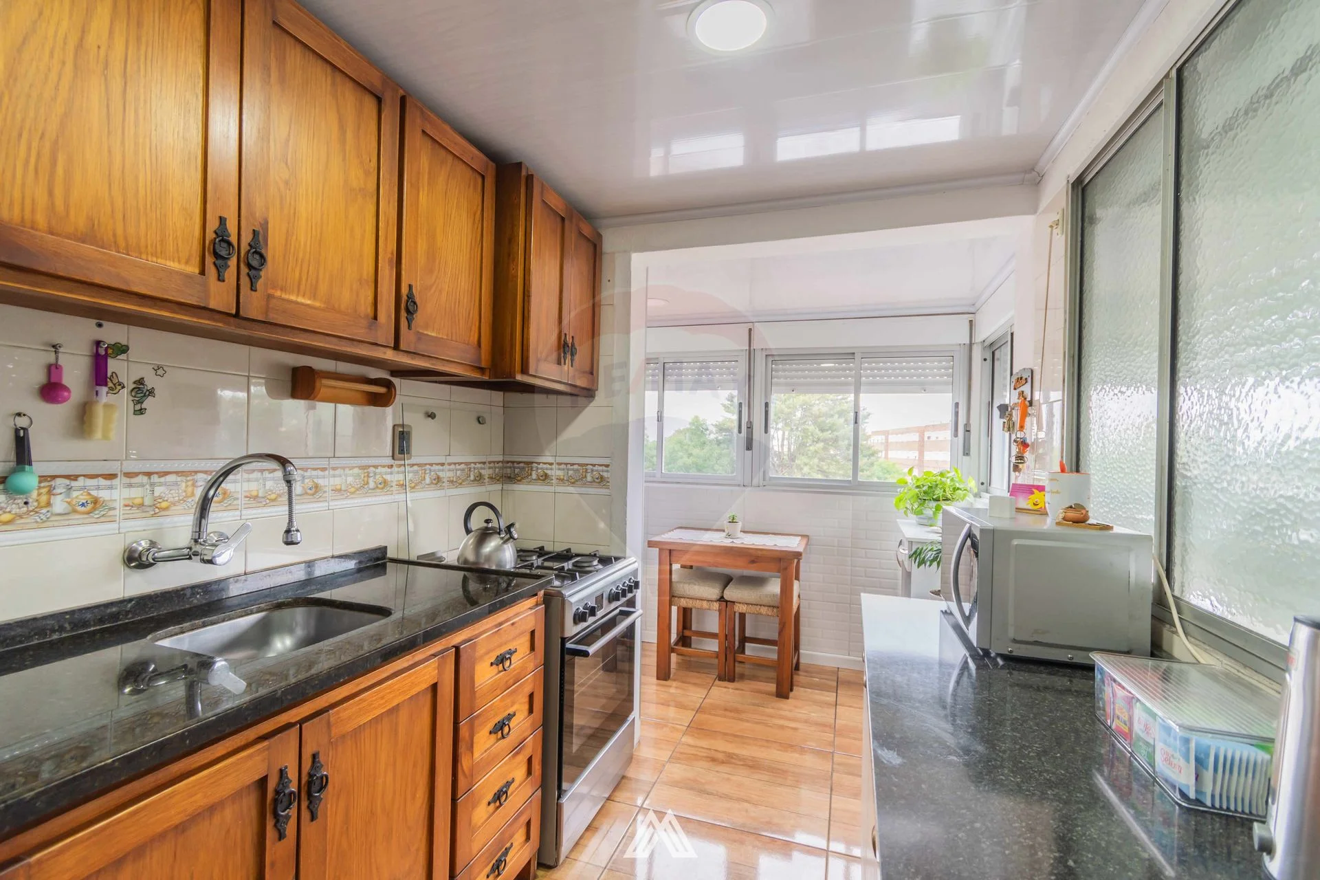 Este apartamento se encuentra en un segundo piso por escalera. Cuenta con un amplio y luminoso living-comedor, con pisos de cerámica y aire acondicionado. Dispone de dos dormitorios, ambos con ventanas, persianas y aire acondicionado. El baño ha sido totalmente reciclado, está revestido en cerámica y cuenta con mampara. La cocina también fue reciclada e integrada a lo que era el balcón, equipada con muebles aéreos y bajo mesada de madera, una amplia mesada, dos extractores y múltiples ventanas de aluminio. El apartamento cuenta con iluminación LED en todos sus ambientes. Además, incluye cochera propia.