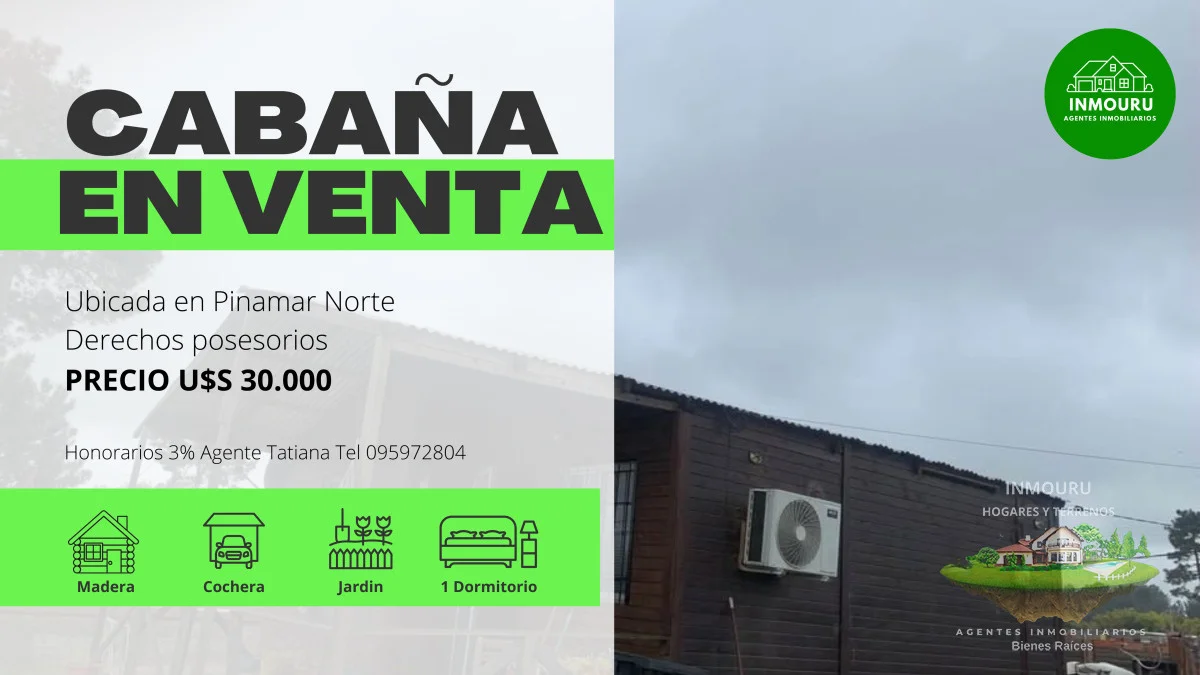 Venta de Cabaña en Pinamar Norte PRECIO U$S 30.000 Vendo hermosa cabaña, derechos posesorios, título en mano, ubicada en Pinamar Norte. Hermoso terreno. Todas las ventanas y puertas con rejas. Escuela y UTU a 3 cuadras. Honorarios 3% Agente Tatiana Referencia Interna : Tera-1817