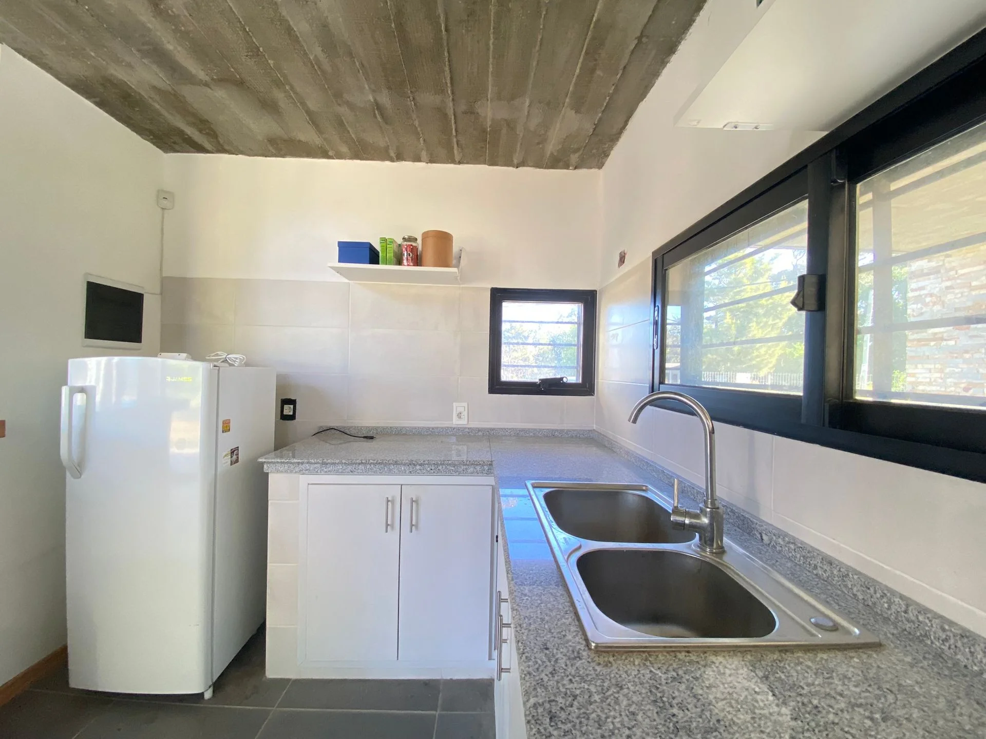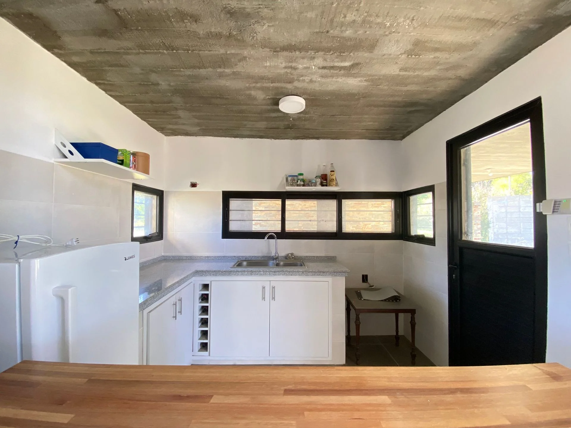 Hacia el frente se encuentra un living comedor con estufa a leña , junto a este espacio se encuentra la cocina integrada con muebles bajo mesada, equipada con barra en madera y mesada de granito.