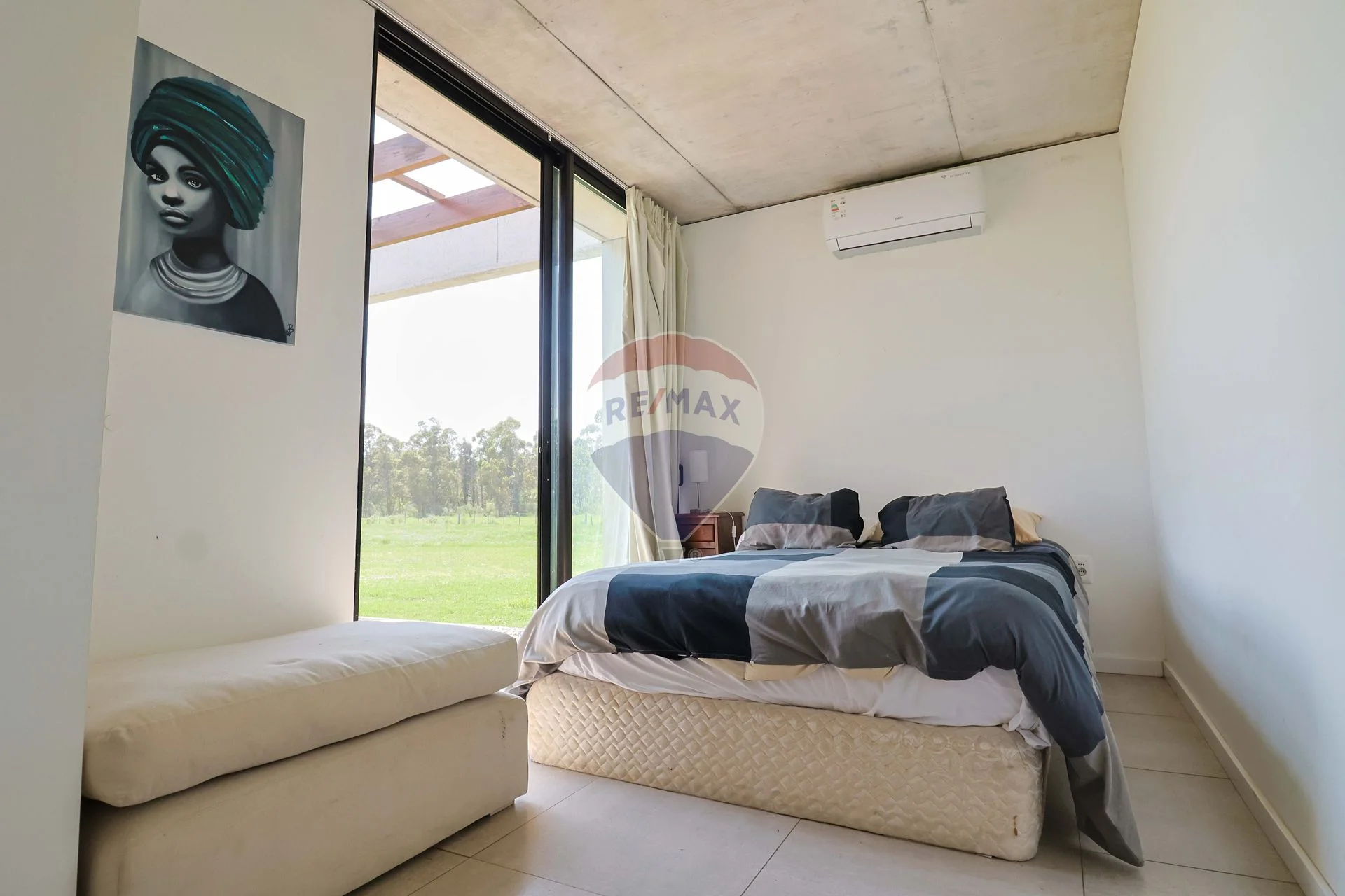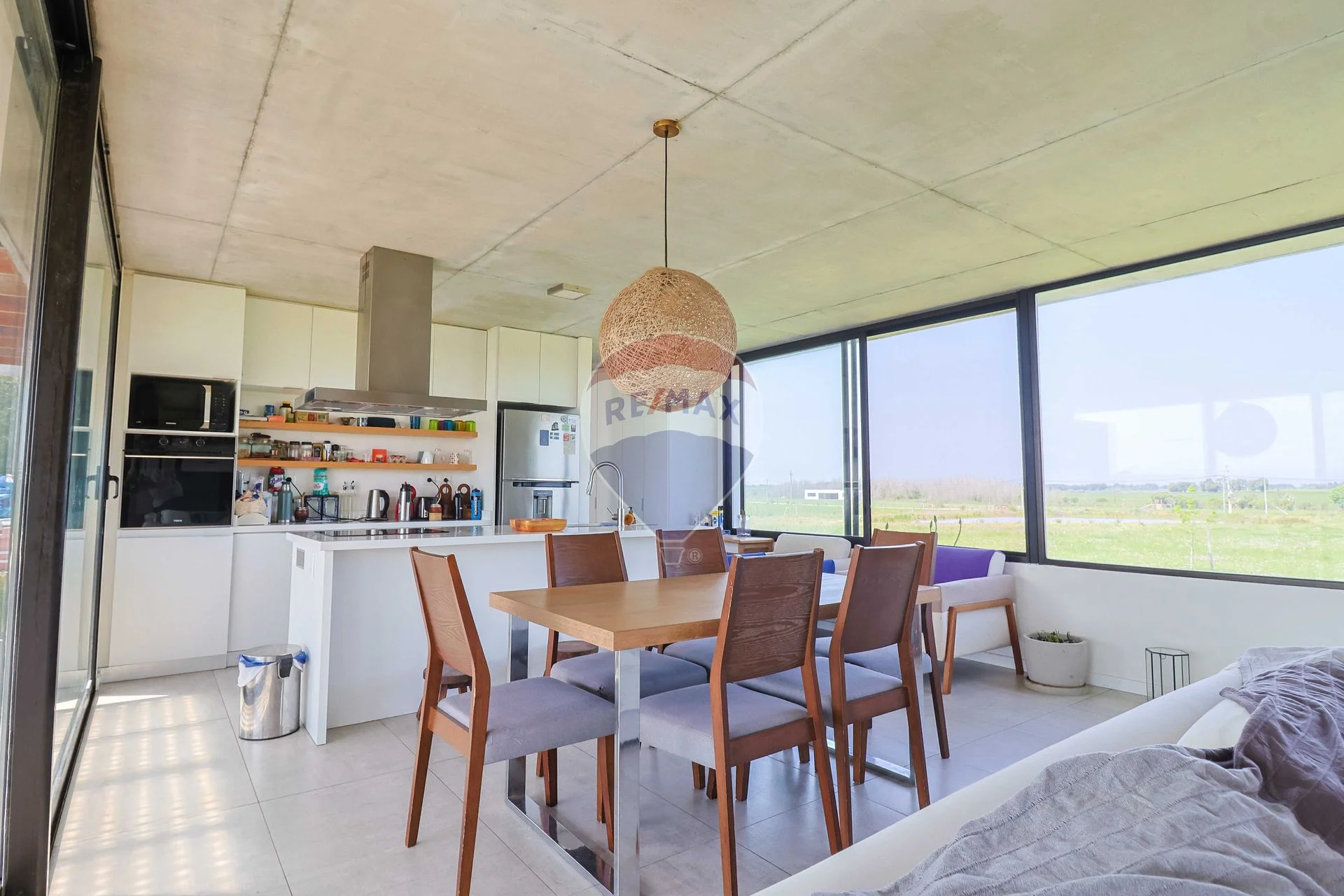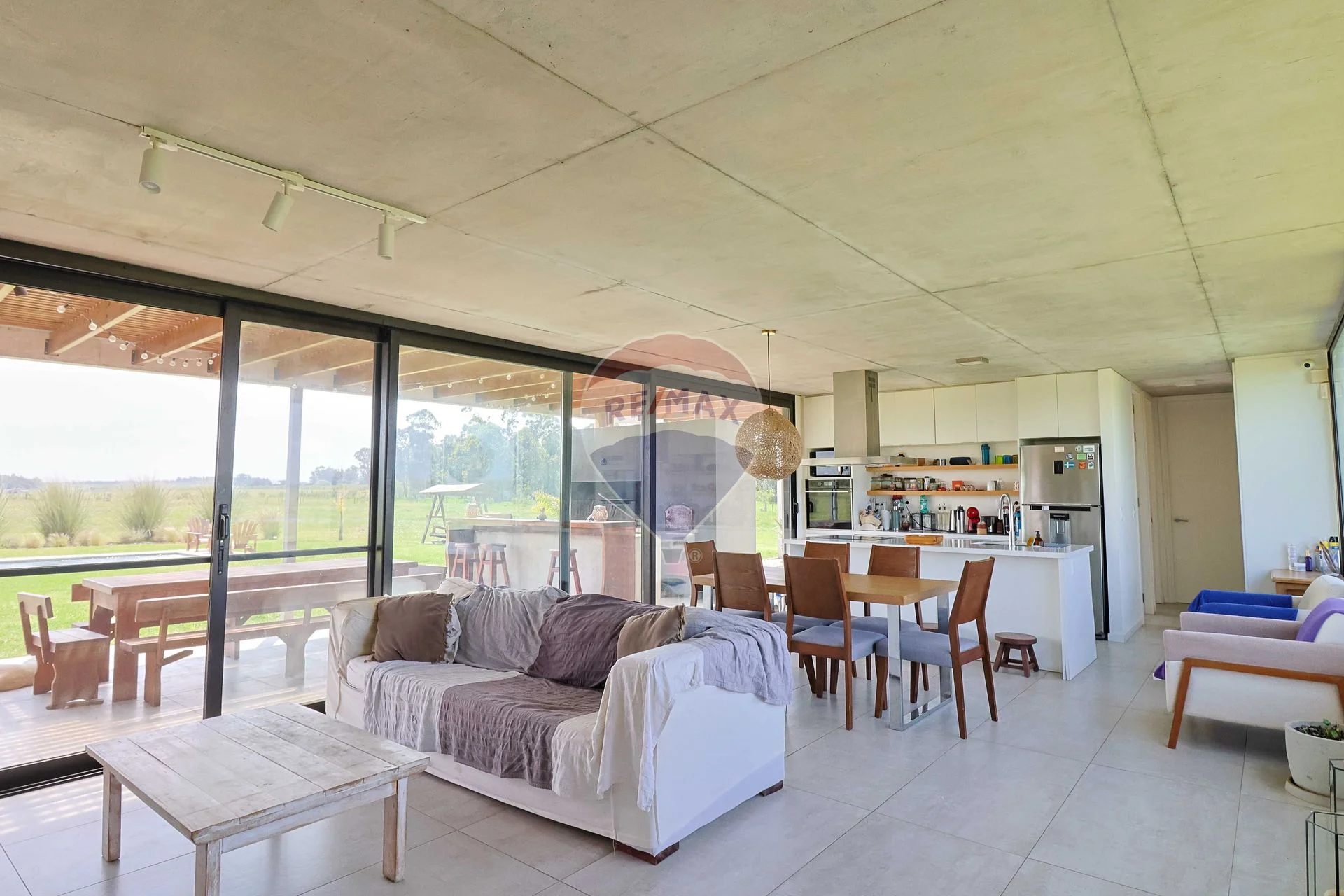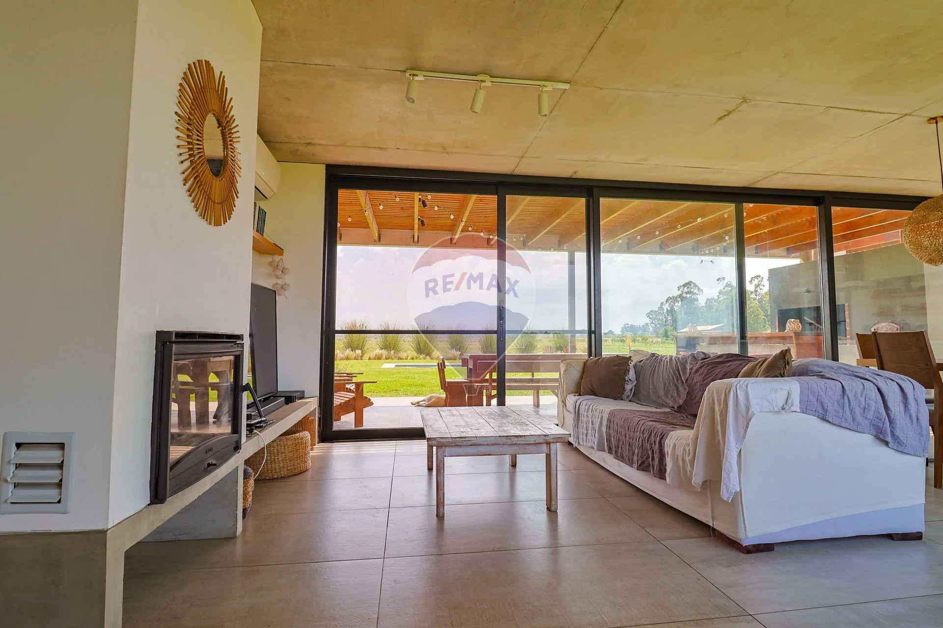 Amplio y ventilado living comedor con aire acondicionado frio/calor, estufa a leña de alto rendimiento, mosquiteros y excelentes aberturas con vidrios dobles.
