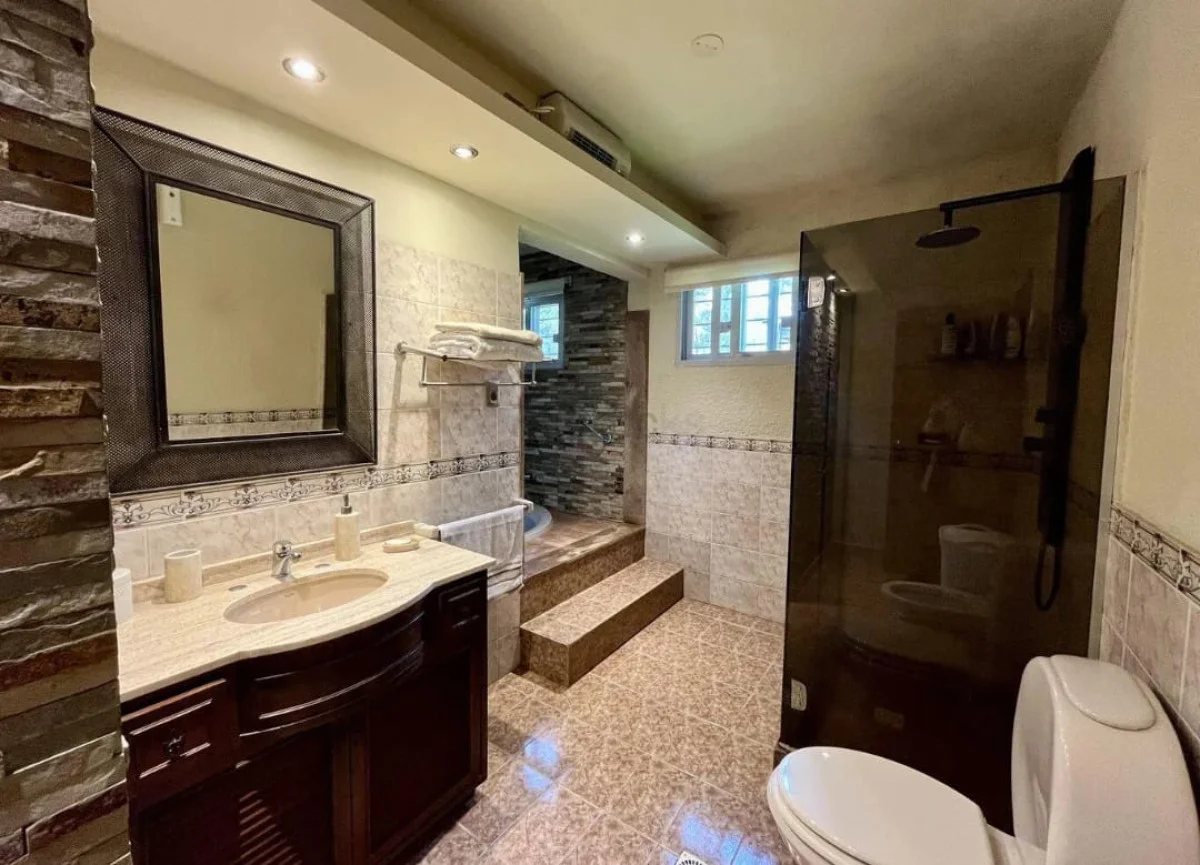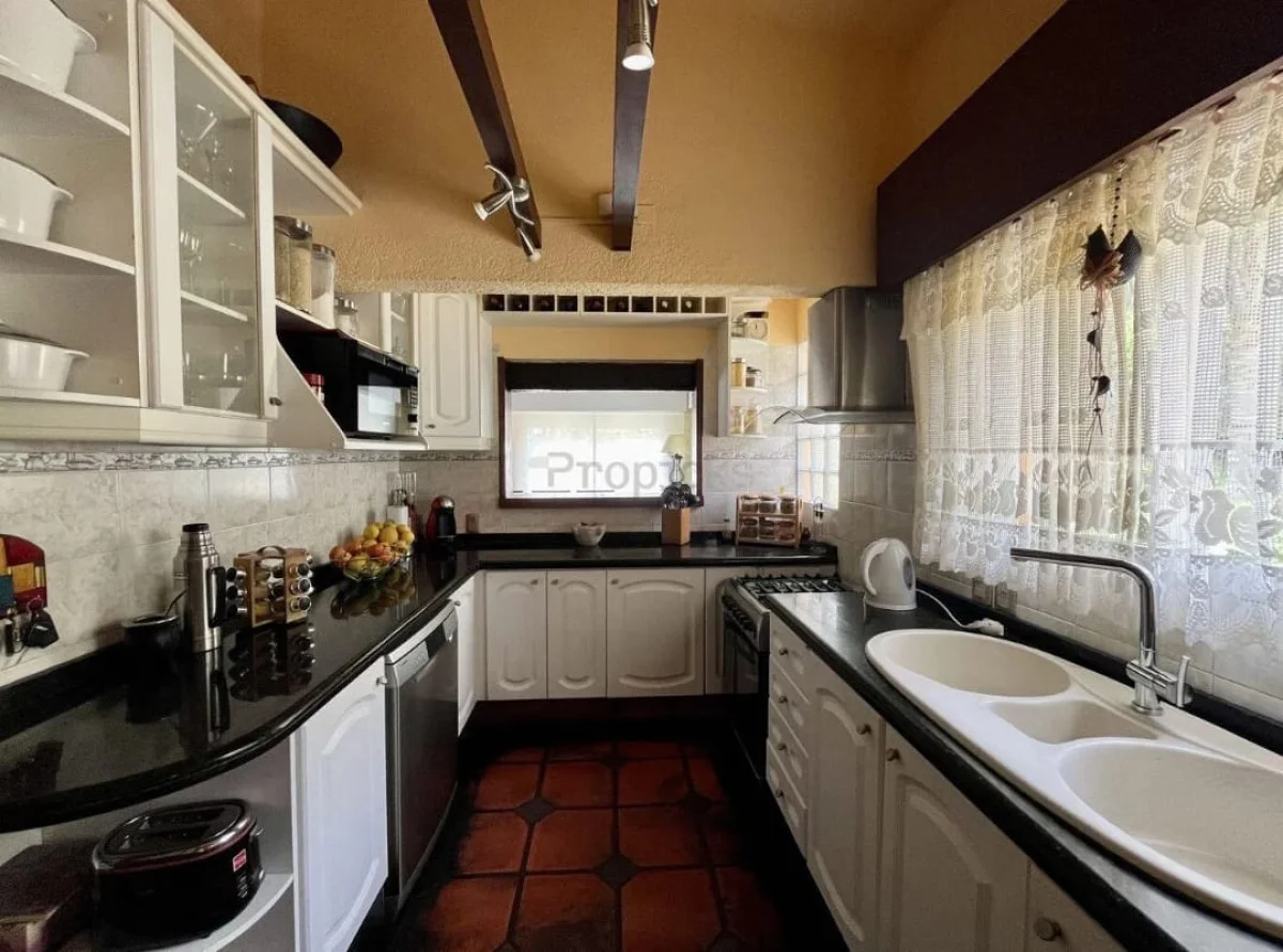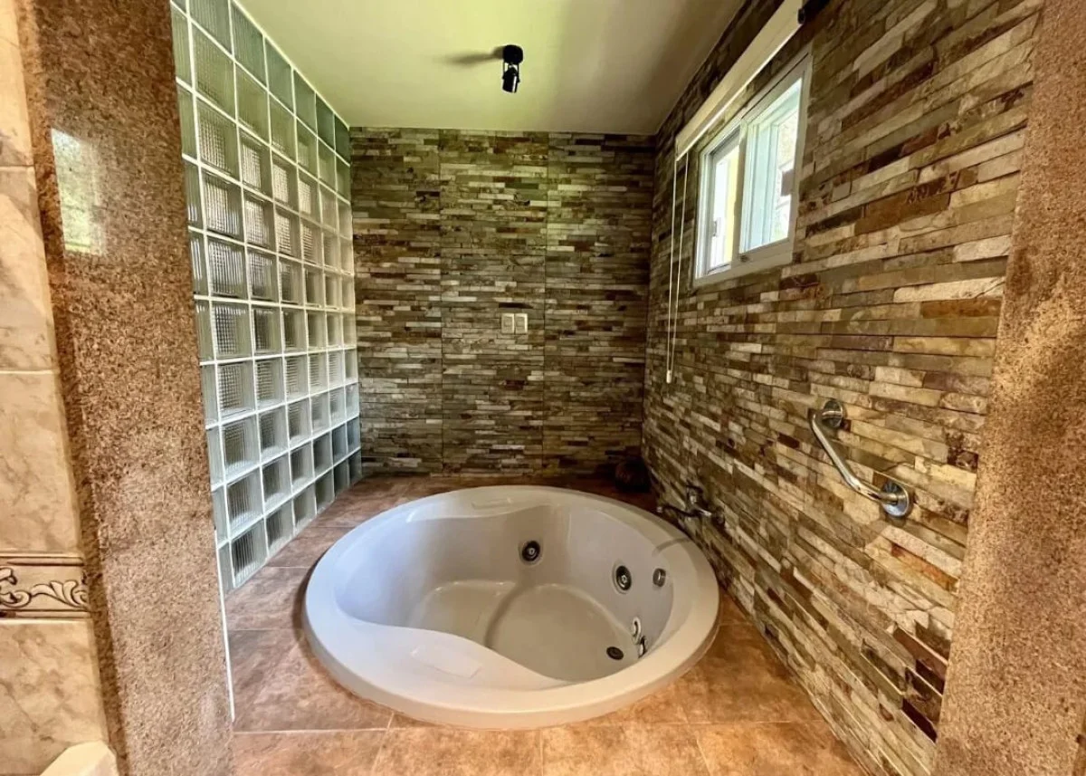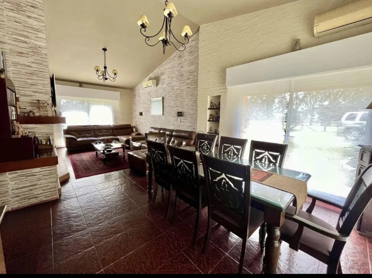 La casa principal, de arquitectura tradicional, ofrece amplios y luminosos espacios. La sala de estar, con techos altos y un diseño cálido, cuenta con estufas a leña que invitan a la relajación durante los meses más fríos. Dispone de un total de cuatro dormitorios, uno de ellos en suite con un lujoso jacuzzi. Los baños han sido diseñados con acabados de piedra y mármol que aportan un toque rústico y elegante. La cocina, de estilo tradicional, está completamente equipada con mesadas de granito negro y gabinetes blancos, ofreciendo un ambiente funcional y acogedor. El comedor, con capacidad para ocho personas, es ideal para disfrutar de cenas familiares y reuniones con amigos.