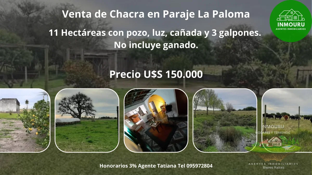 Venta de Chacra en Paraje La Paloma Precio U$S 150.000 Son 11 hectáreas con 3 galpones, cañada, pozo de agua semisurgente habilitado por Ministerio. Además, incluye linda casa. Honorarios 3% Agente Tatiana Referencia Interna : Tera-1717