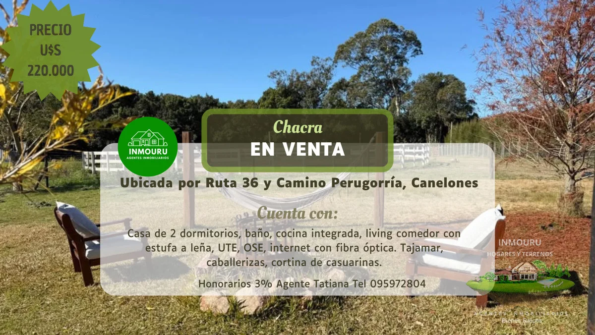 Venta de Chacra en El Colorado, Canelones Precio U$S 220.000 Casa de madera estilo moderno de 72 m², lista para habitar. Cuenta con 2 dormitorios, baño completo, cocina integrada, living comedor con estufa a leña. Instalación de UTE, OSE, internet con fibra óptica, Instalación pronta para cámaras de seguridad. La casa cuenta con rejas en todas las ventanas y puertas y cochera techada. Tierra muy fértil con índice CONEAT 110, praderas de alfalfa y avena plantada. Tajamar rodeado de árboles. Cortina de casuarinas que brinda privacidad y protección y 19 caballerizas, galpón. En el predio funcionó anteriormente un pensionado equino, con toda la estructura lista para retomarlo. Terreno rectangular con acceso por senda privada. Está ubicado en Ruta 36 y Camino Perugorría. Honorarios 3% Agente Tatiana Referencia Interna : Tera-2000