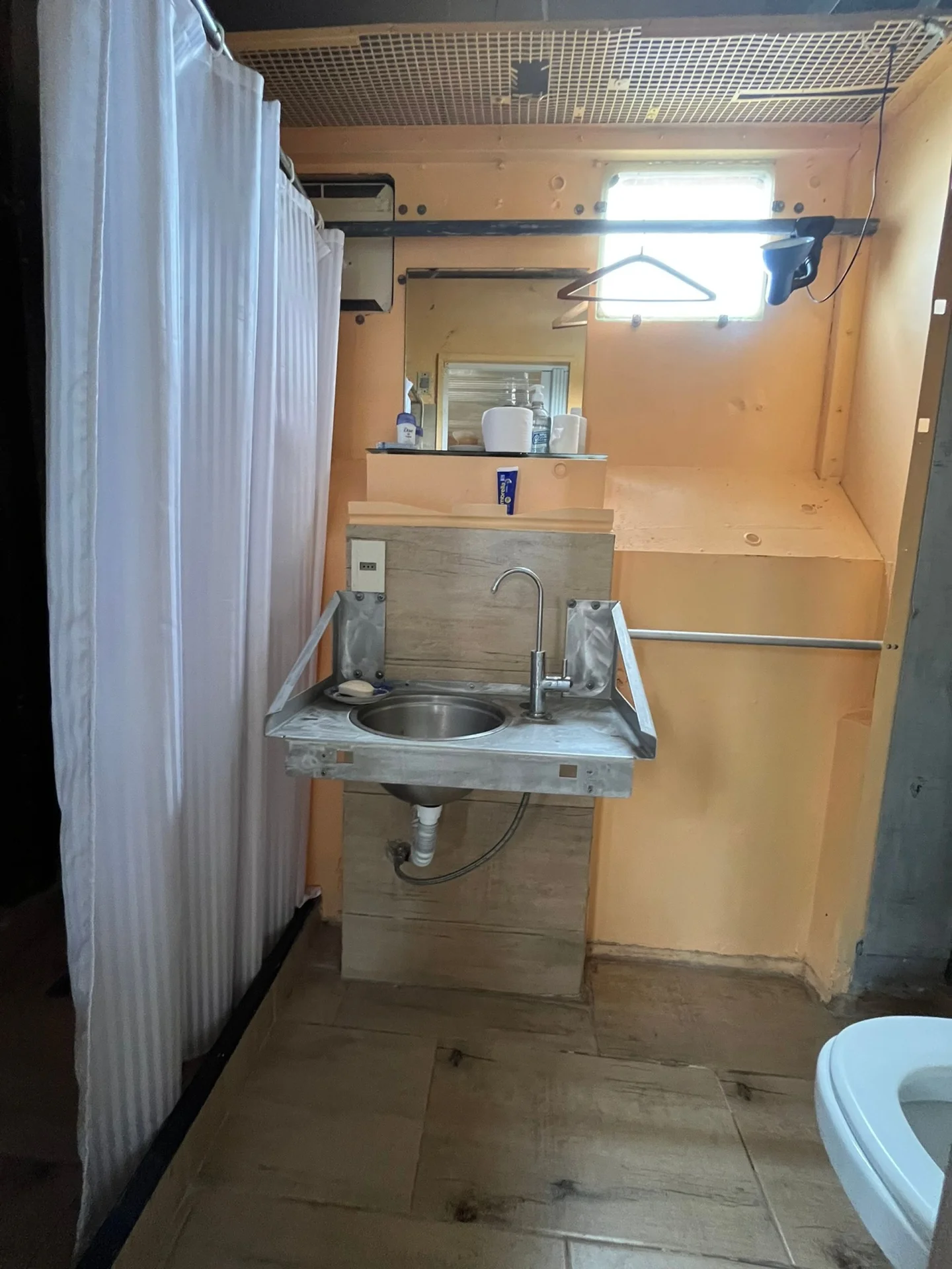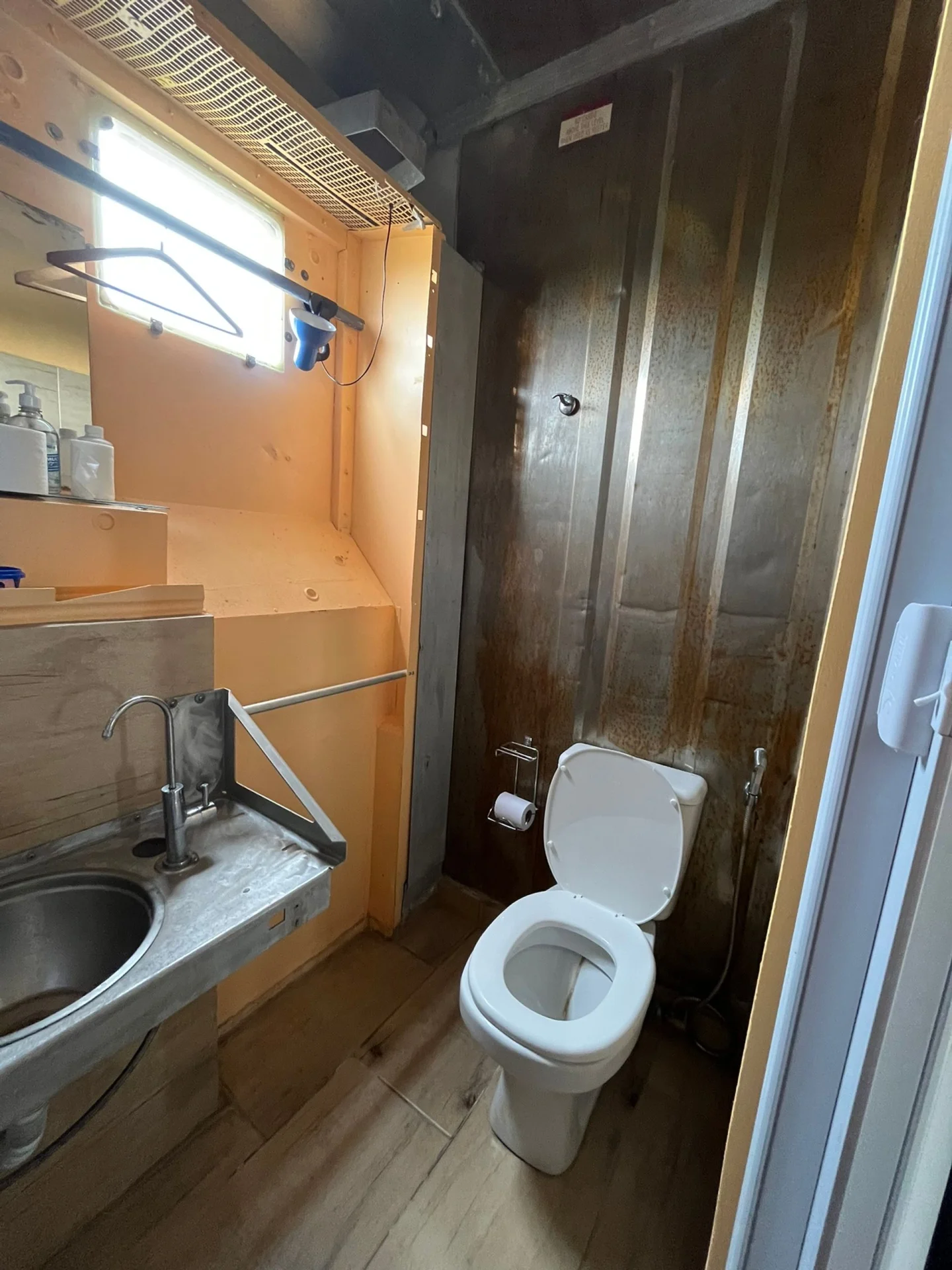 Contenedor de 40 pies (12 m.): Con división interna en dos áreas, una que se utiliza como estar con kitchenette, baño completo y dormitorio, y la otra como depósito.