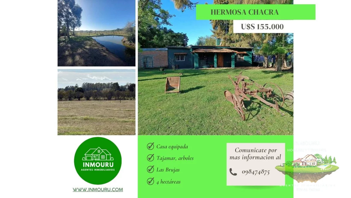 Venta de chacra en la zona de Las Brujas próximo a Santa Lucia Ruta 48 km 0 Zona muy tranquila 2 padrones que tienen una propiedad de 4 dormitorios , 2 baños, living comedor 2 estufas a leña Parrillero Horno de barro bajo techo Piscina en patio cerrado Galpones, caballerizas Buen indice de CONEAT Monte de peras Prada de ómnibus y escuelas en la zona Precio USD 155000 Contribución anual $ 5000 Honorarios 3 % Agente Nazarena Referencia Interna : Tera-2167
