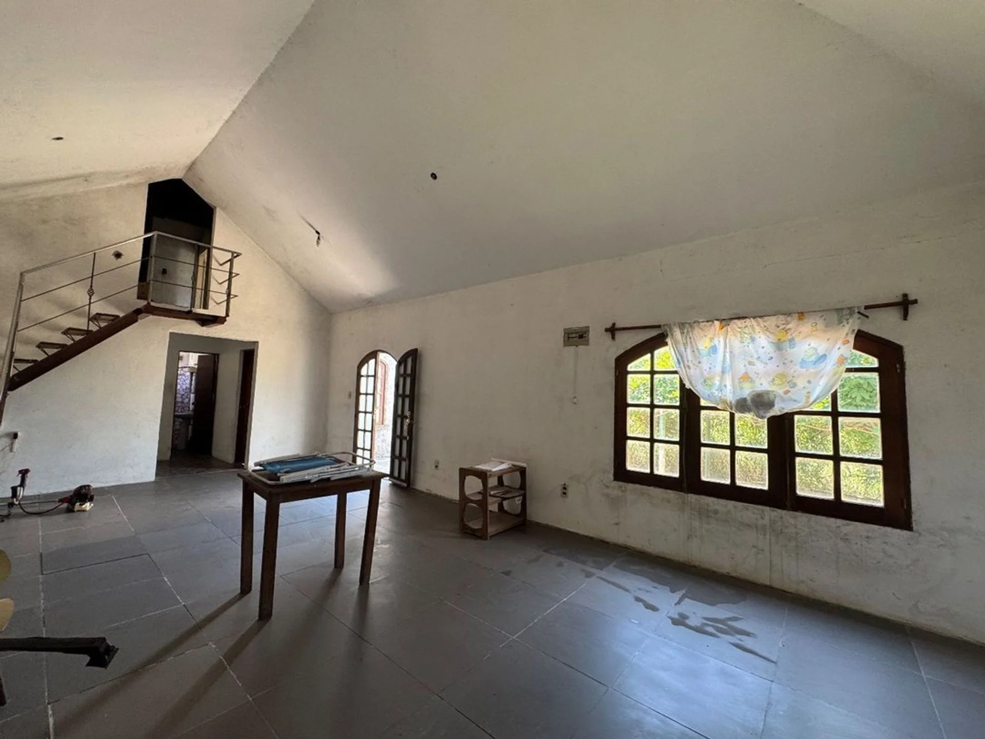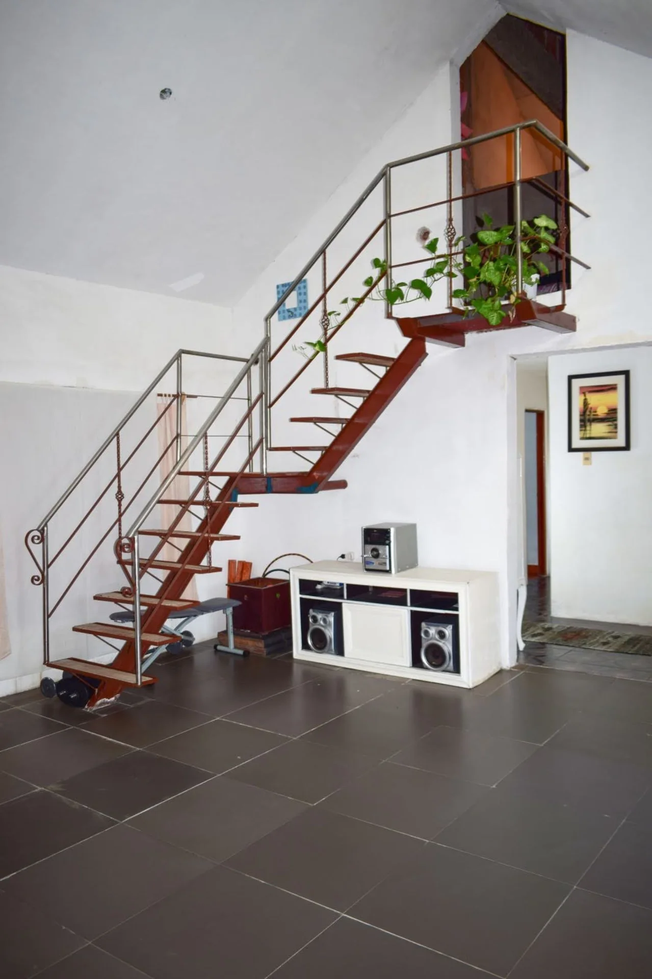- Escalera metálica de estilo moderno que conecta con la planta superior.