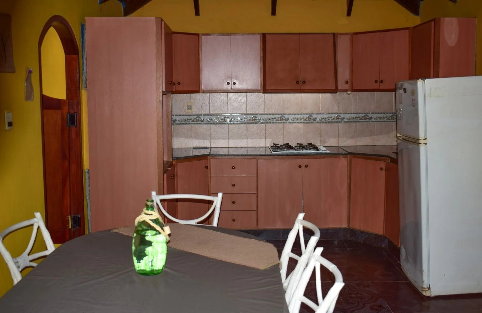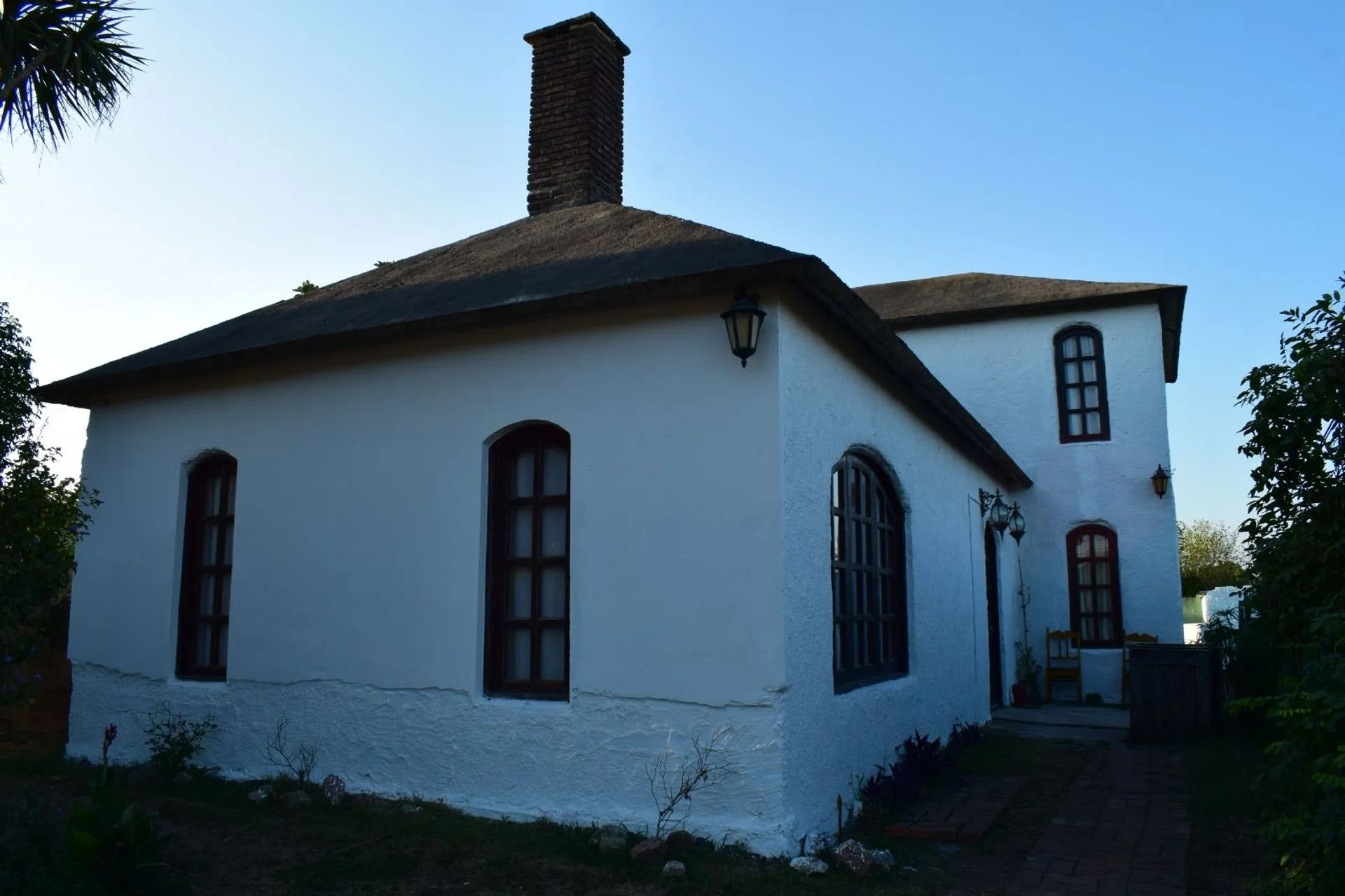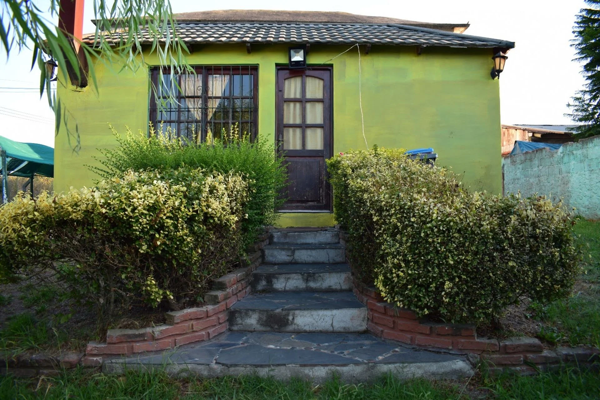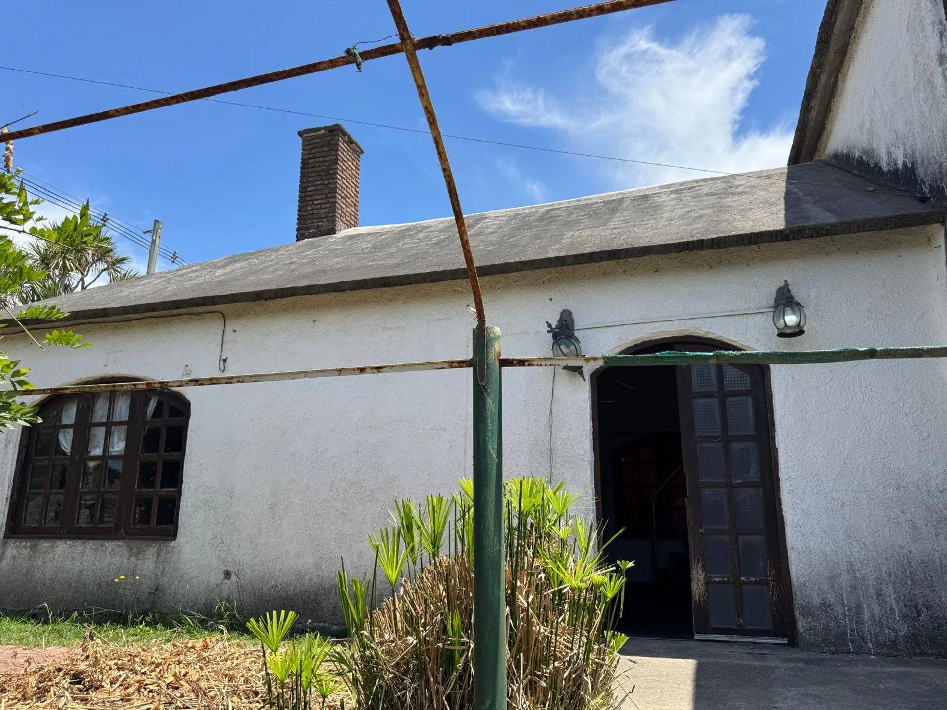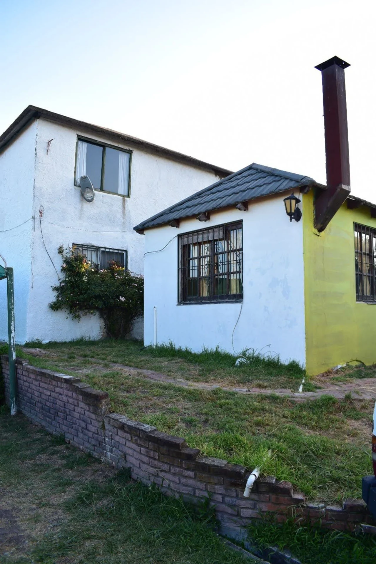 La fachada presenta líneas sobrias y personalidad propia: muros blancos, aberturas en madera con terminación en arco y una chimenea de ladrillo visto. El frente se completa con rejas y columnas de ladrillo. El acceso peatonal se da a través de una pérgola cubierta de enredaderas, que enmarca de forma pintoresca la entrada lateral y el área de estacionamiento.