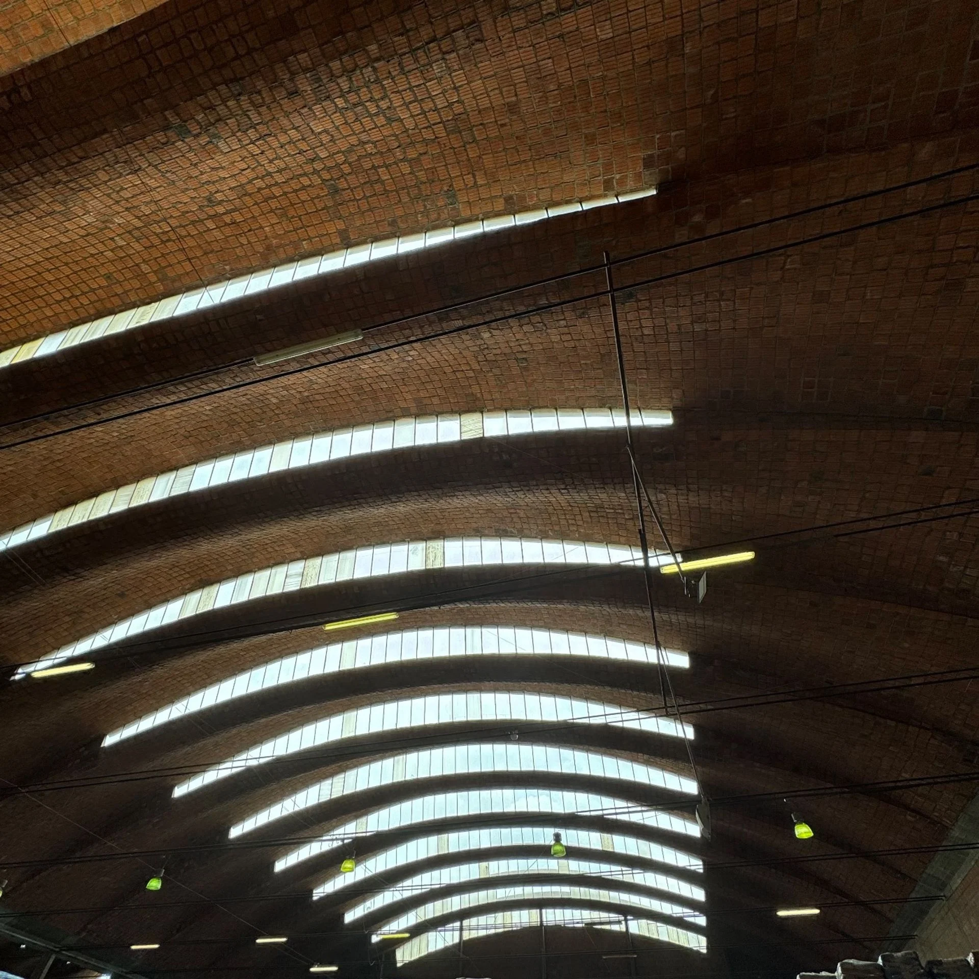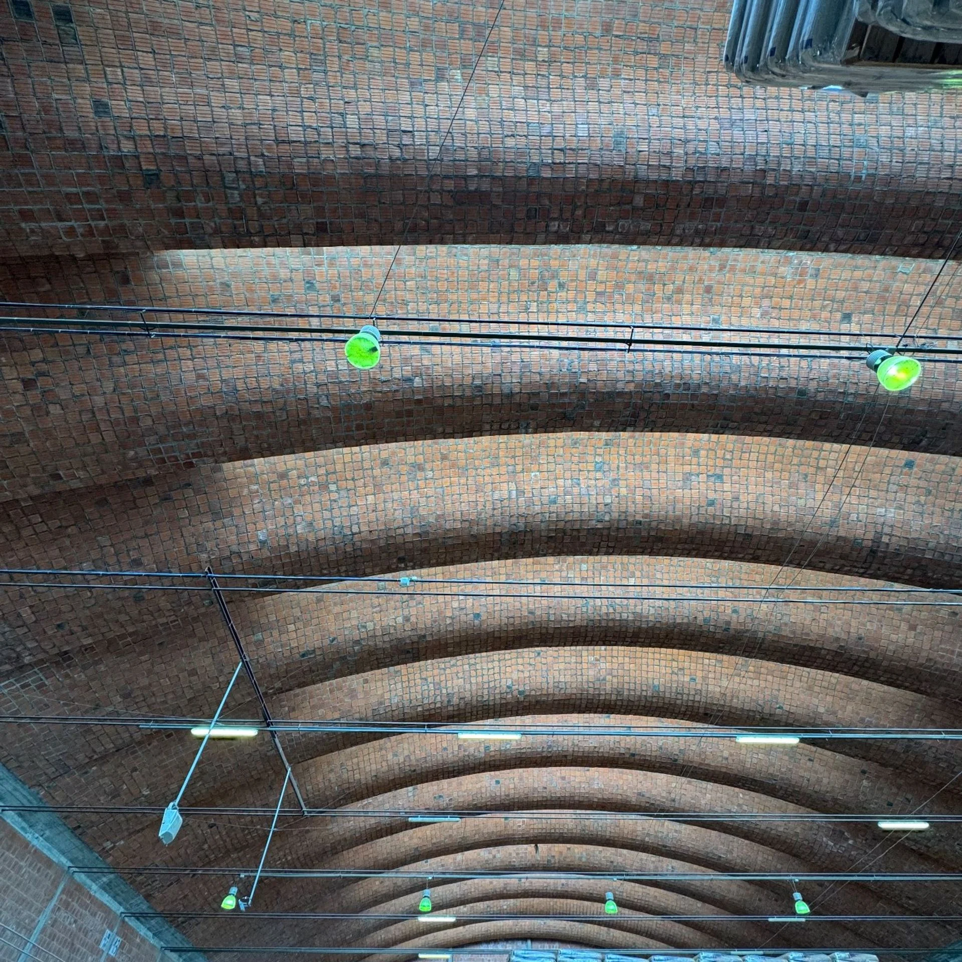 El material de las bóvedas es ladrillo hueco de prensa, ticholo (25 x 25 x 7,5) unido con mortero de arena y portland en relación 3 a 1. En el espacio entre fajas se fijan lucernarios cenitales apoyados en montantes de aluminio, orientados para suministrar una iluminación uniforme y sensiblemente indirecta.