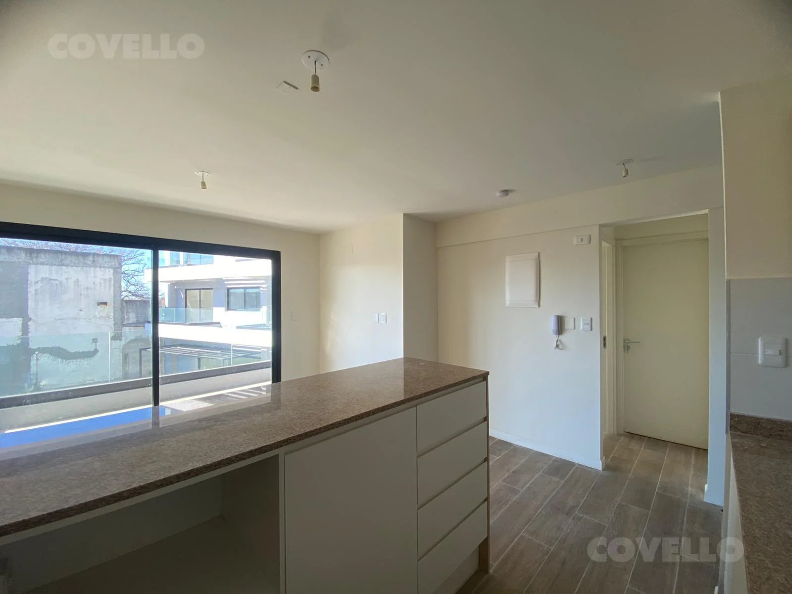 Disponible en primer piso, este cómodo apartamento ubicado en el edificio Postal Carmelo Suites ofrece una excelente orientación noreste, con muy buena luz natural y vista despejada a la calle Defensa.