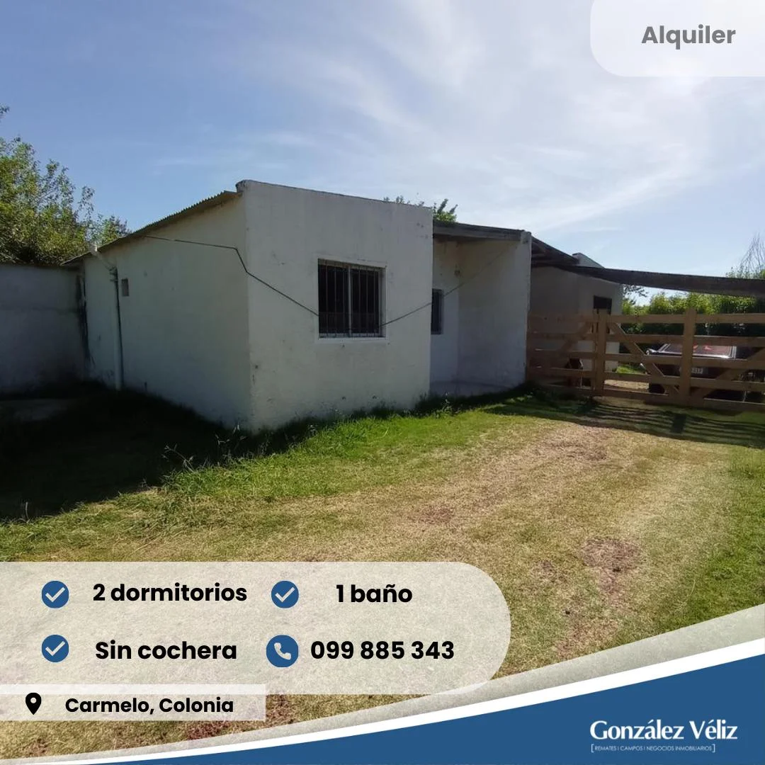 SE ALQUILA!!Casa en Zona Norte: Cuenta con dos dormitorios, cocina/comedor, baño, patio cerrado con alero y churrasquero al fondo.Código de referencia: GHO4800172Si te interesó la propiedad puedes coordinar visita a través de los números: ALQUILERES: Oficina 45425448 / 099885343 VENTAS: 099425417 (Martín González)/ 099337795 (Carlos Véliz)Estamos ubicados en Zorrilla de San Martín 447 esquina Roosevelt, Carmelo - Uruguay.