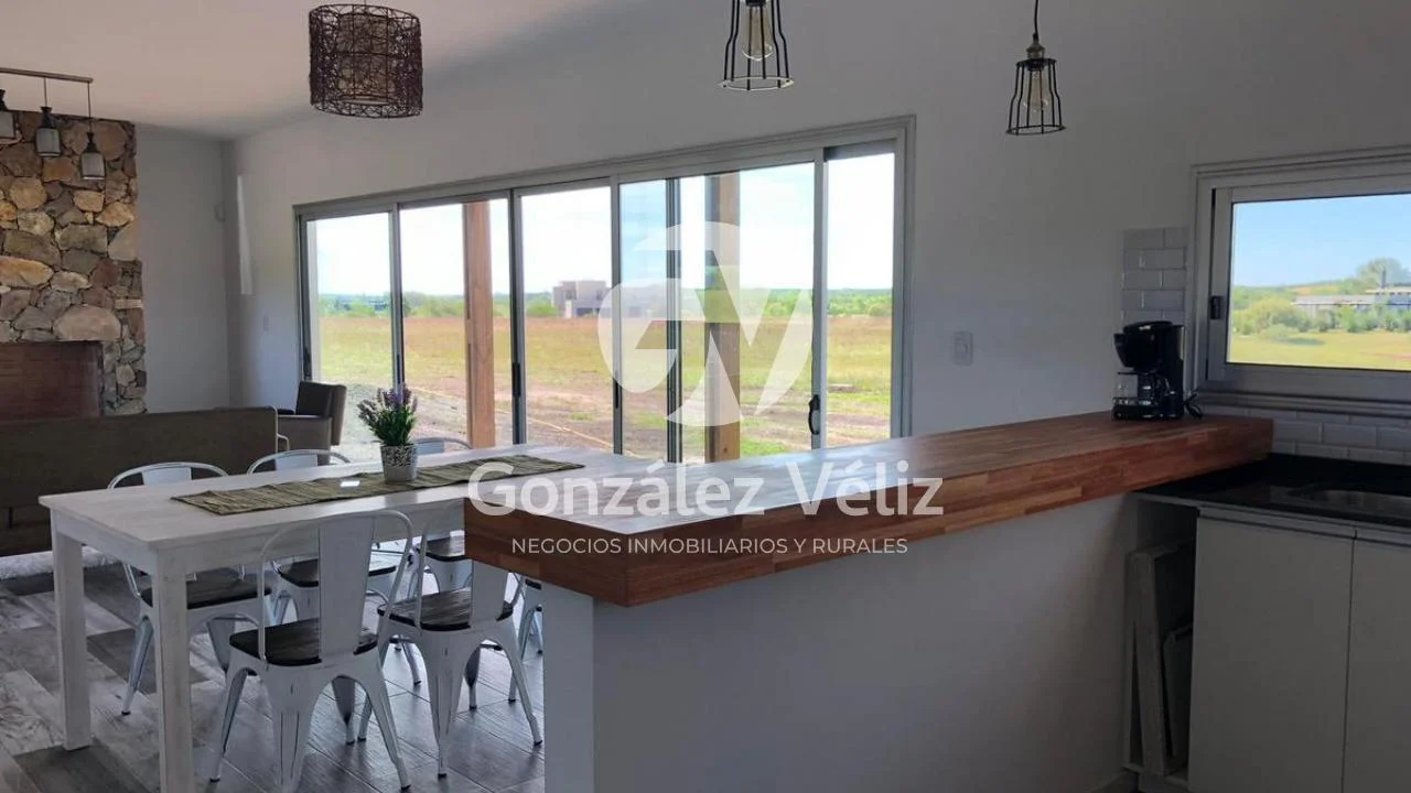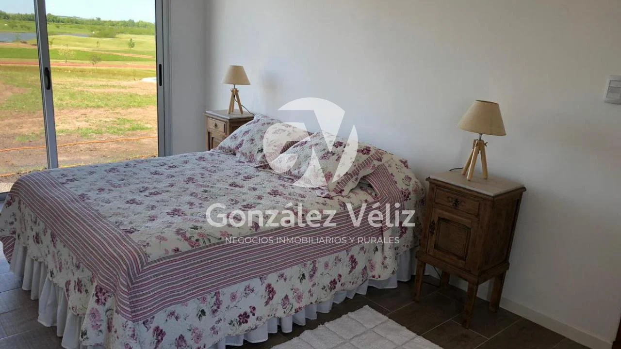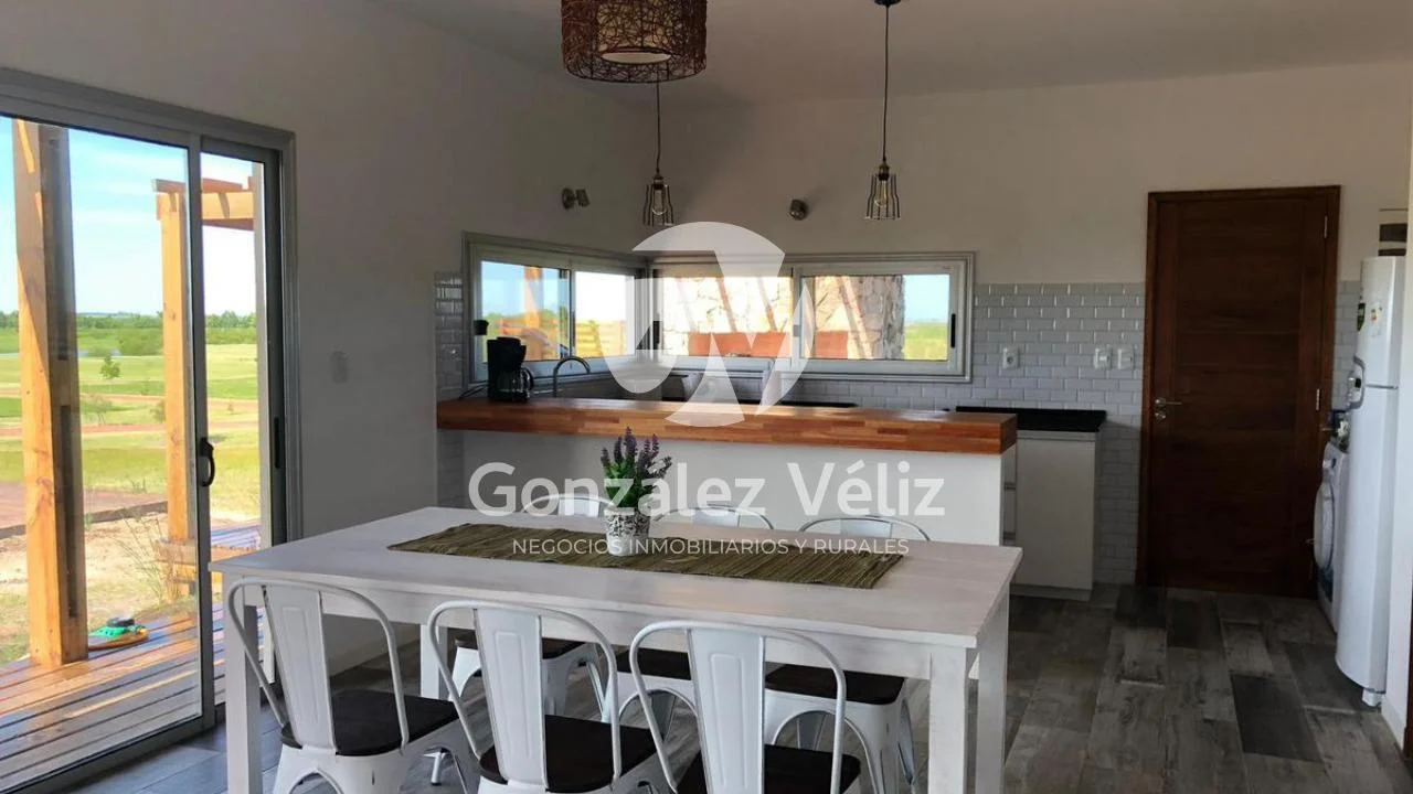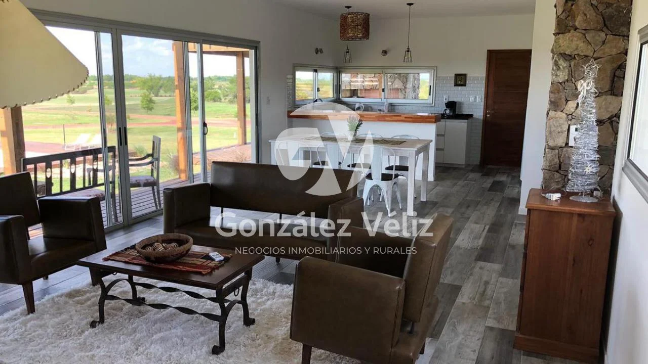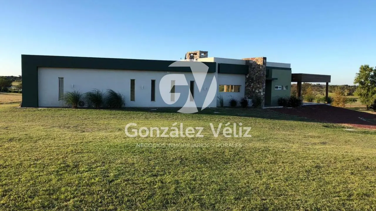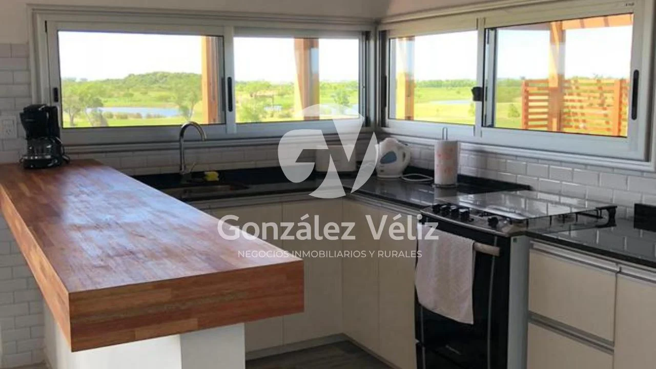 3 dormitorios con baño en suite, living comedor con cocina integrada, baño social, estufa leña, cochera para dos autos, parrillero, piscina, hermosa vista al campo de golf, 4100mts de terreno.