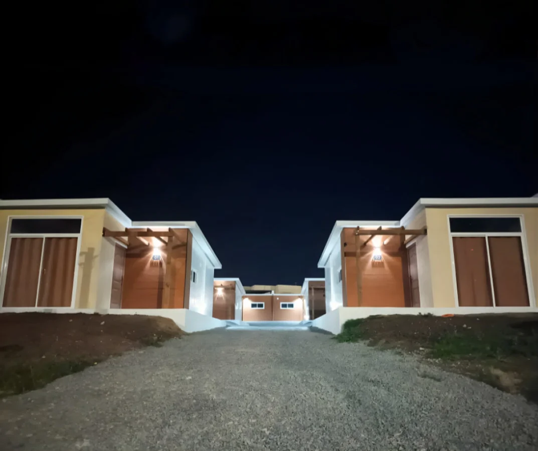 Complejo con acceso central iluminado y cocheras/espacios de estacionamiento