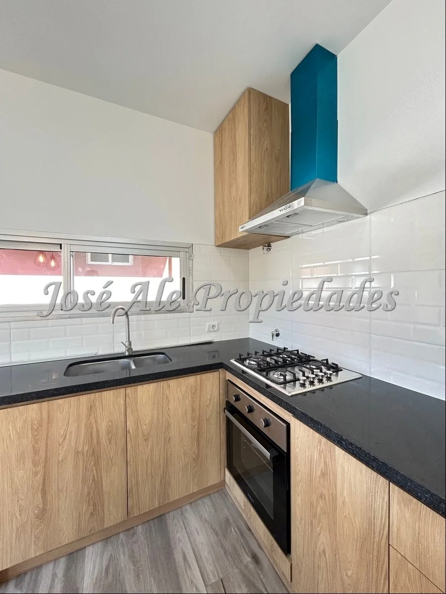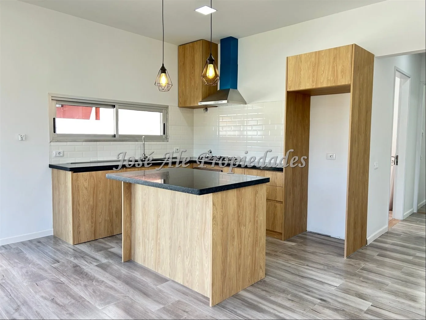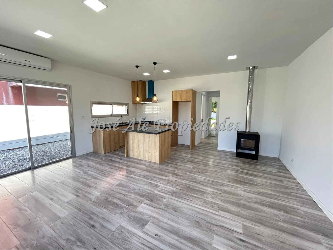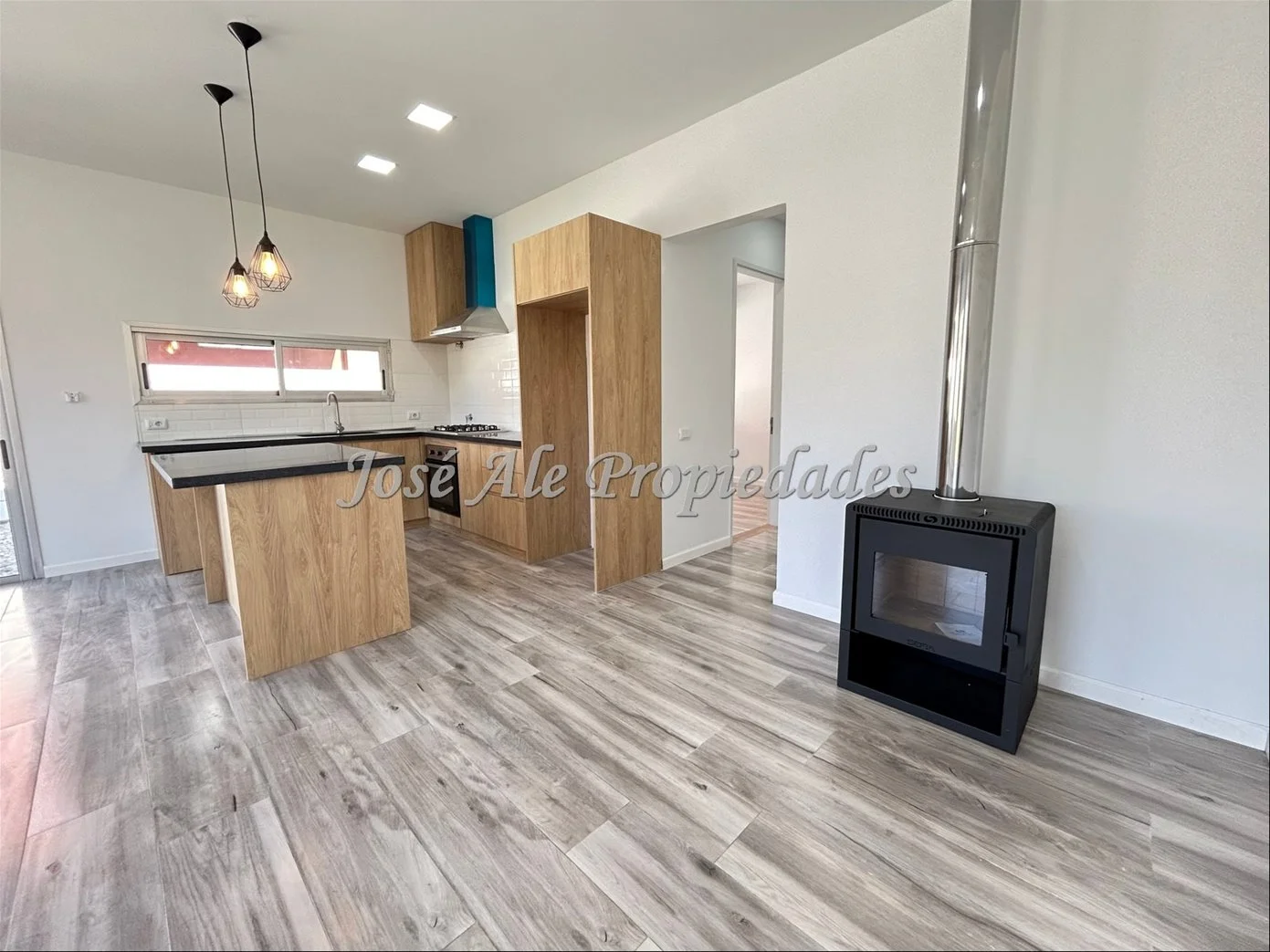 Comodidades: - Espacioso living comedor con pisos de porcelanato símil madera en tonos de grises. - Moderno calefactor a leña. - Aires Ac. - Cocina integrada con mesada de granito negro e isla desayunador, mobiliario a medida aéreo y bajo mesada, anafe y horno empotrados, campana extractora y moderno revestimiento. - 2 Cómodos dormitorios, uno de ellos en suite con vestidor y el otro cuenta con amplio armario empotrado piso-techo. - 2 Baños amplios y modernos. - Amplio patio completamente amurado. - Parrillero completo. - Hermosa piscina.
