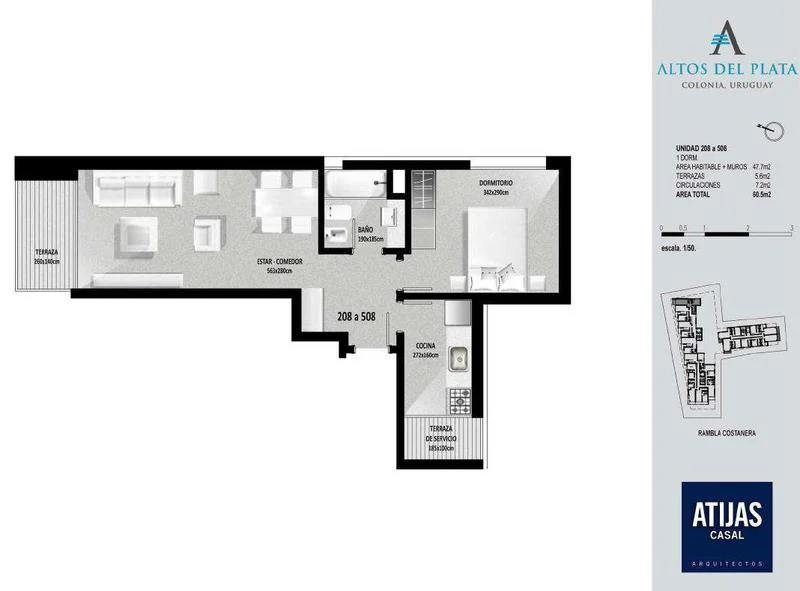 En el Edificio Altos del Plata, frente a la Rambla de Colonia del Sacramento, se ofrece en ALQUILER este apartamento de 1 dormitorio con placard, living-comedor con terraza y vista al Río de la Plata.