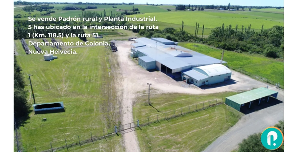 Padrón rural y Planta Industrial de 5 has ubicado en la intersección de la ruta 1 (Km. 118.5) y la ruta 51, Departamento de Colonia - Nueva Helvecia.
