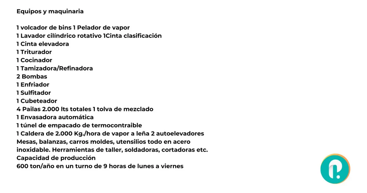Equipos y maquinaria incluido en la Propuesta de Venta: