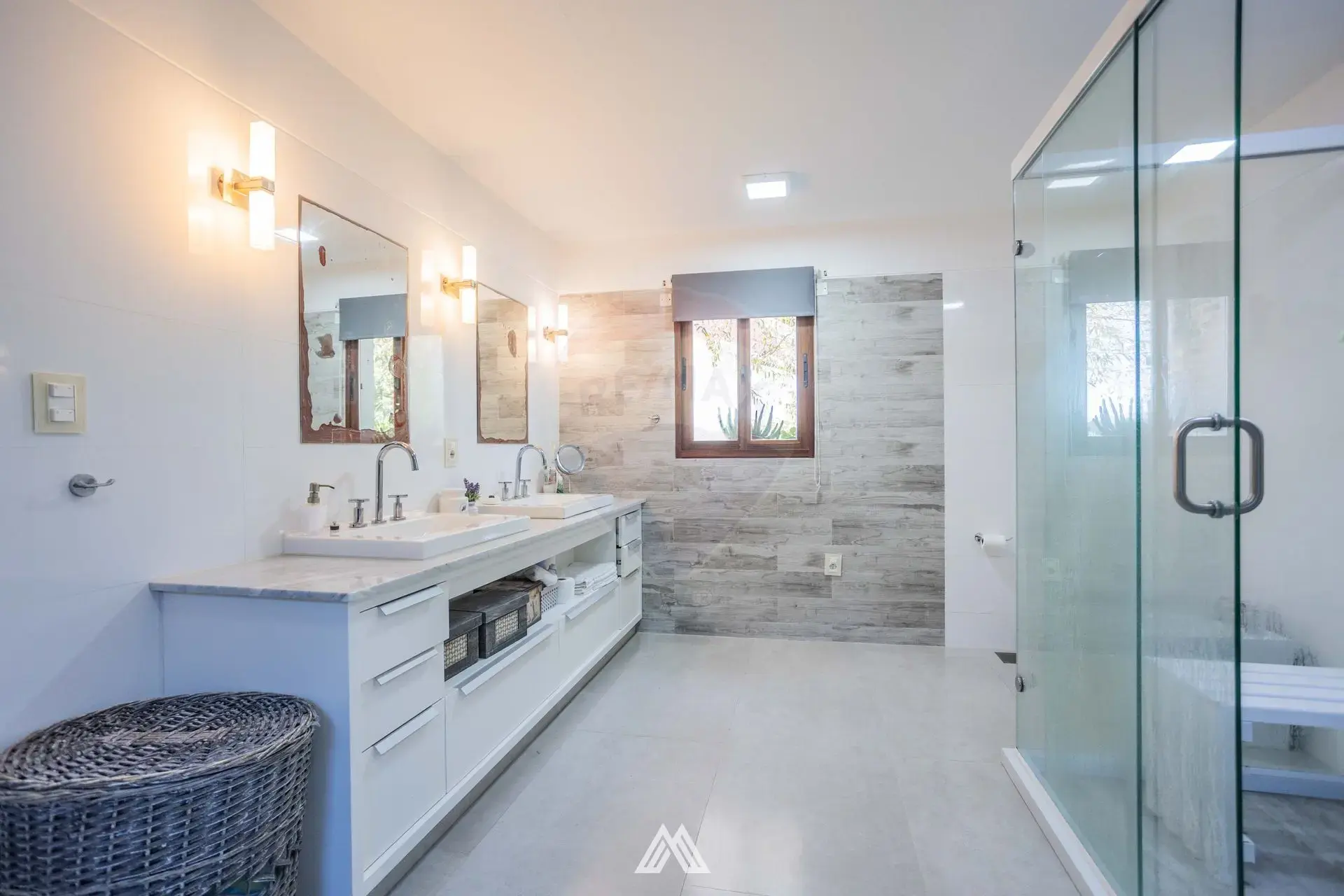 En el exterior la casa está rodeada de un lindo parque con piscina, otro parrillero abierto y un monoambiente con cocina y baño al lado de la piscina. Además, dos baños/vestidores de uso exterior pegados al parrillero.