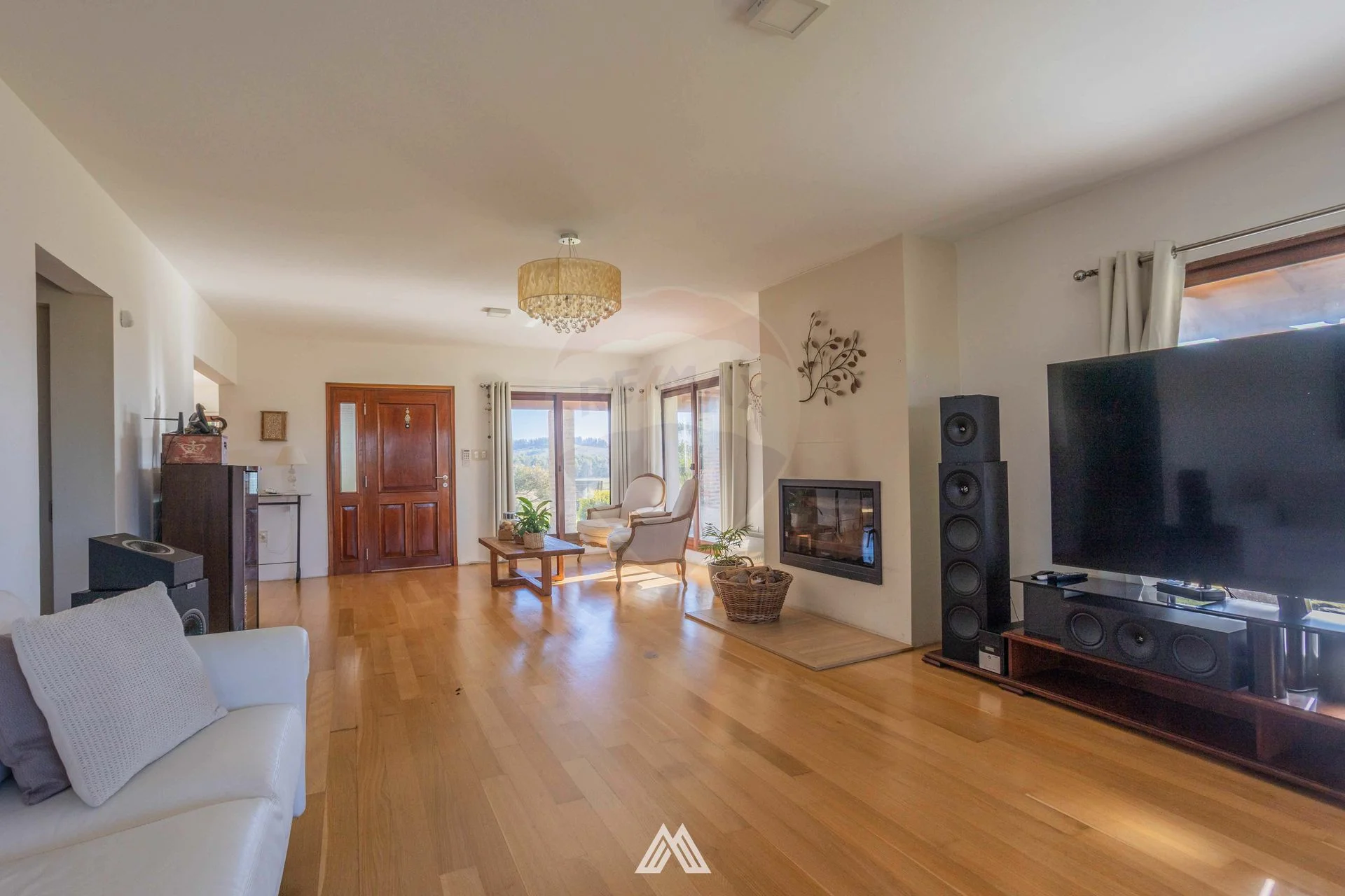 Planta baja con un amplio living con calefactor a leña y sala de estar integrada. Todo con amplios ventanales que aportan mucha luz natural y vista al paisaje del entorno. Baño social pegado al living.