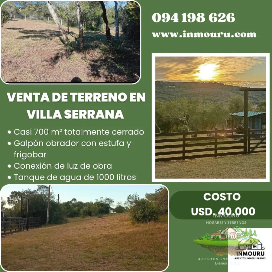 VENTA DE TERRENO CON MEJORAS EN VILLA SERRANA Ubicado entre Baño de la India y Observatorio viejo ????COSTO: USD 40.000 ✅️ Papeles al día ✅️ Acepta Banco ???? Casi 700 m² totalmente cerrado ✅️ Zona alta con vista hacia el Cerro Guazubirá Cuenta con: Galpón obrador con estufa y frigobar Conexión de luz de obra Tanque de agua de 1000 litros Fogón de piedra con parrilla amplia ???? Zona muy tranquila ideal para un buen descanso Honorario: 3% Agente Vanesa 094 198 626 Referencia Interna : Tera-1591