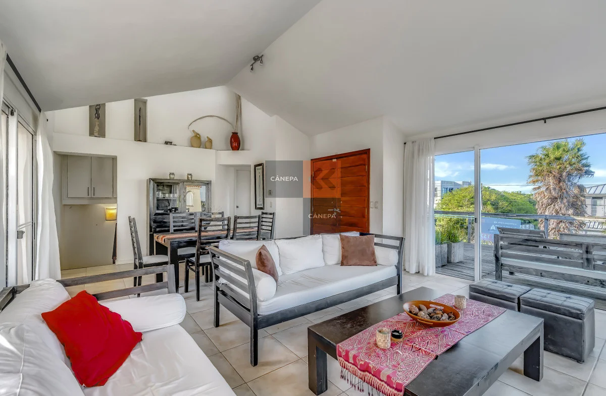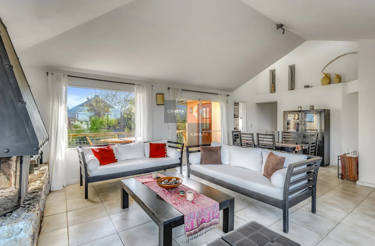 Living comedor muy luminoso con estufa a leña y salida a la terraza con parrillero