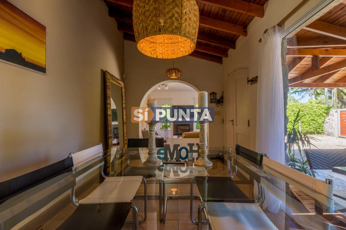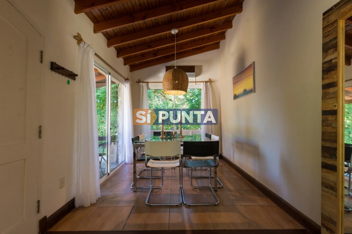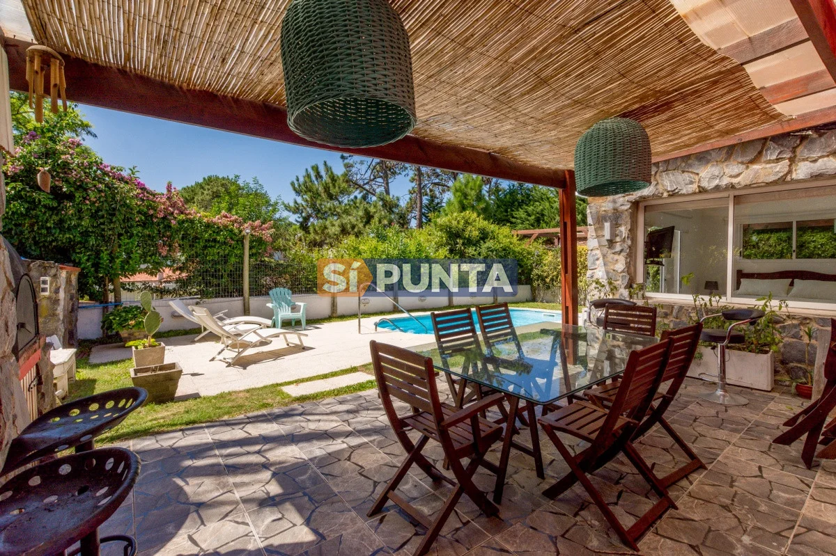 Tan exclusiva como Rincón del Indio! Rodeada por verdes árboles y sin el ruido de la ciudad, el sonido de las olas del mar lo invitan a conocer esta magnífica casa, de visión cálida y moderna. Su estadía será con categoría, confort y seguridad. Con 3 dormitorios (1 en suite) distribuidos en planta baja la suite y dependencia con baño. En planta alta 2 dormitorios con baño y otro cuarto playroom. Totalmente equipada con a/a, wifi, cable. Parrillero techado con horno de pizza y jardín muy disfrutable con piscina climatizada, totalmente cerrado. Cochera techada. Cerco perimetral.