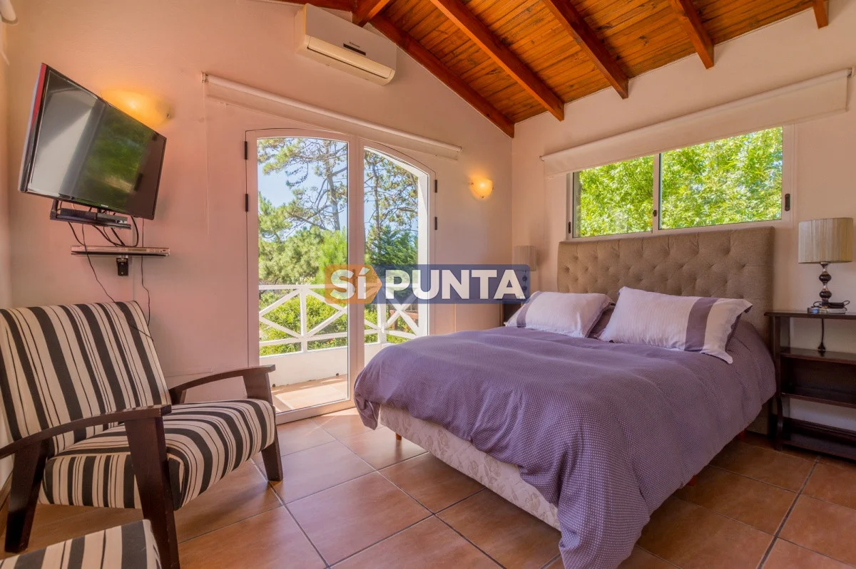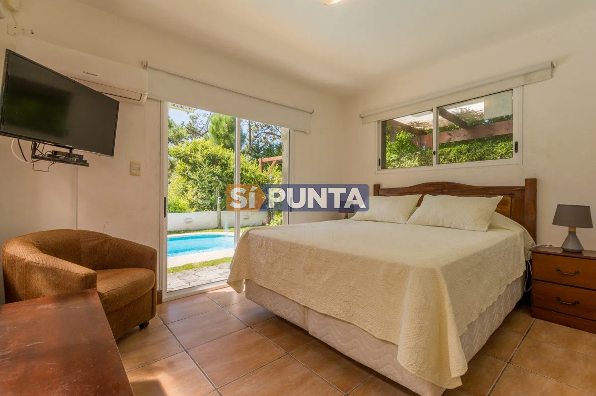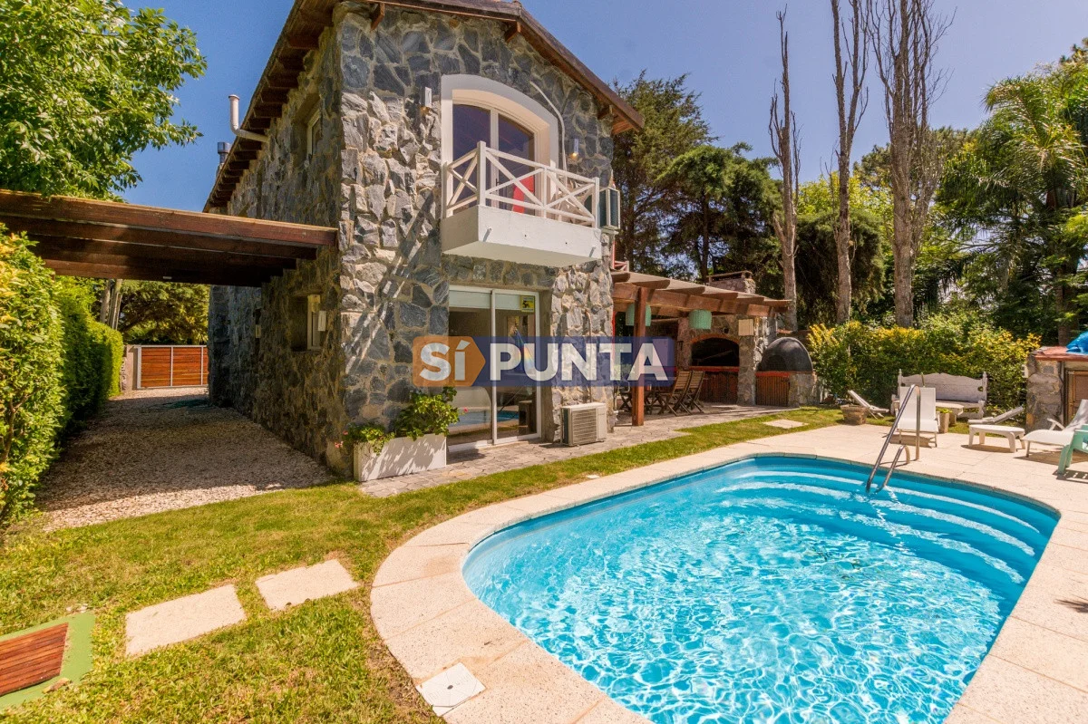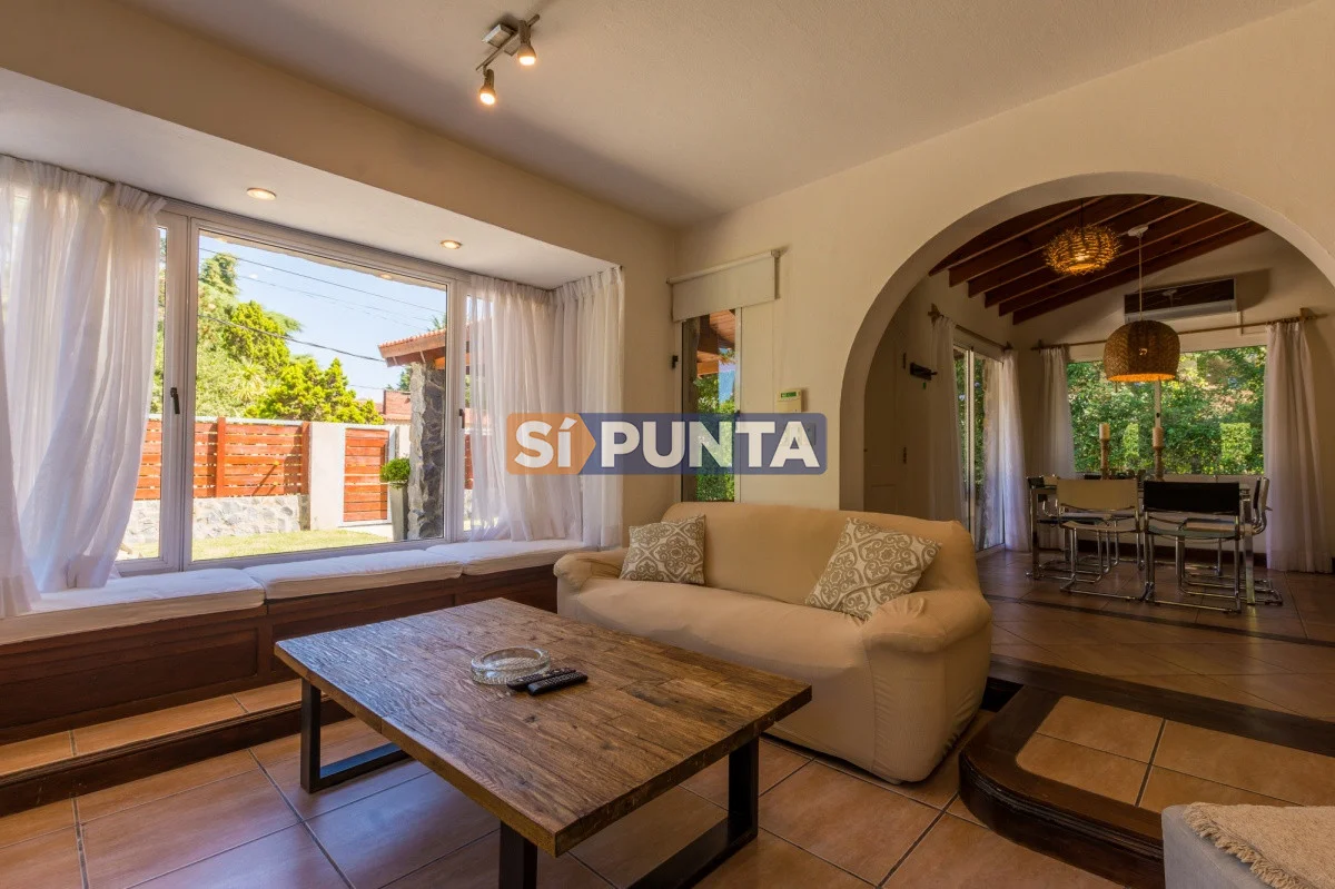 Tan exclusiva como Rincón del Indio! Rodeada por verdes árboles y sin el ruido de la ciudad, el sonido de las olas del mar lo invitan a conocer esta magnífica casa, de visión cálida y moderna. Su estadía será con categoría, confort y seguridad. Con 3 dormitorios (1 en suite) distribuidos en planta baja la suite y dependencia con baño. En planta alta 2 dormitorios con baño y otro cuarto playroom. Totalmente equipada con a/a, wifi, cable. Parrillero techado con horno de pizza y jardín muy disfrutable con piscina climatizada, totalmente cerrado. Cochera techada. Cerco perimetral.