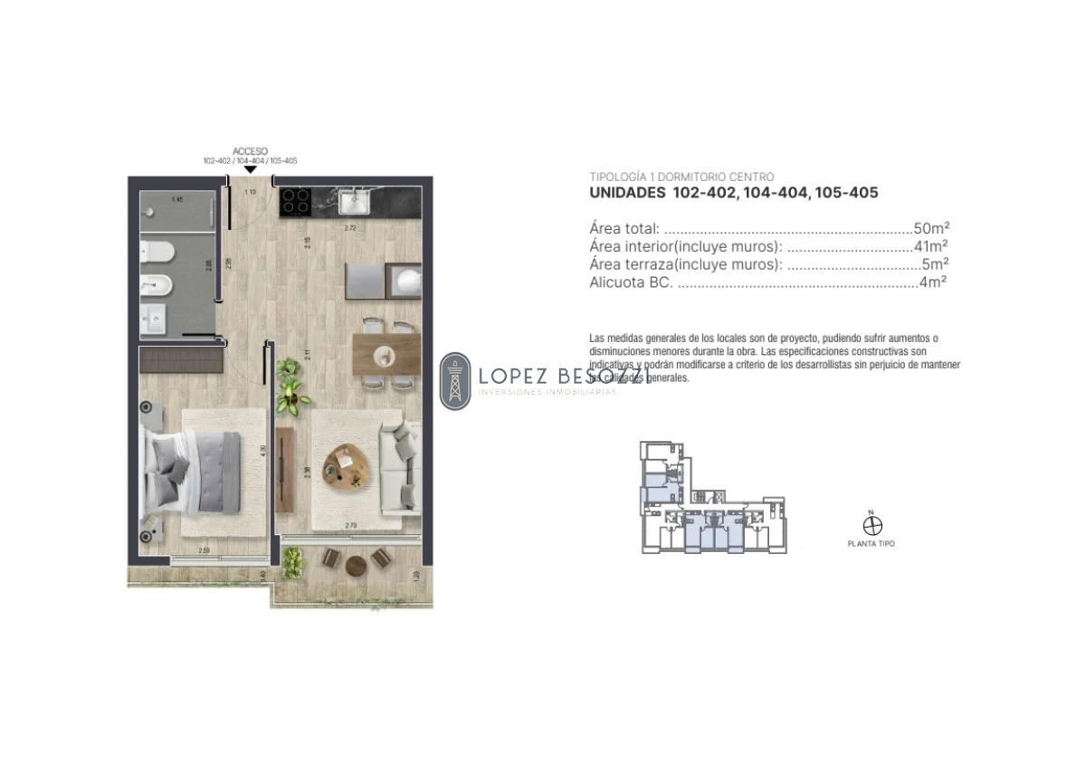 El edificio en construcción contara con unidades de 1 y 2 dormitorios los cuales contaran con terminaciones de primer nivel, previsión para automatización de cortinas, equipos de aire acondicionado; placares en dormitorios a medida; cocina equipadas con horno, anafe y campana; el edificio en general destacarían sus servicios-amenities que el proyecto contara como Barbacoas de uso común; solárium panorámico; piscina climatizada y cerrada para disfrutar durante todo el año; sala de sauna seco, vestuarios y duchas complementarios junto a piscina interna; Amplio local acondicionado y equipado con máquinas caminadoras, de spinning, multifuncionales, y otros equipos manuales, para acondicionamiento físico y deportivo.
