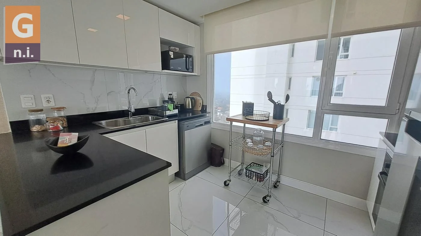 La unidad cuenta con amplio living comedor, cocina integrada, dos dormitorios, tres baños (dos en suite), terraza balcón con área de lavado y garaje de uso exclusivo de la unidad.